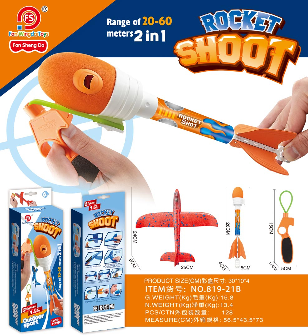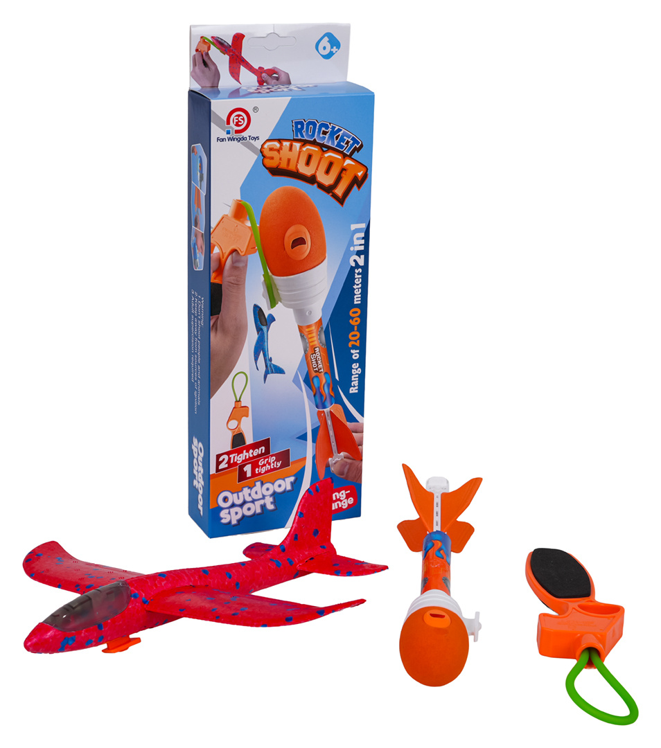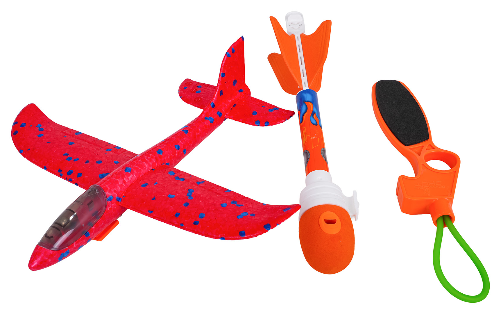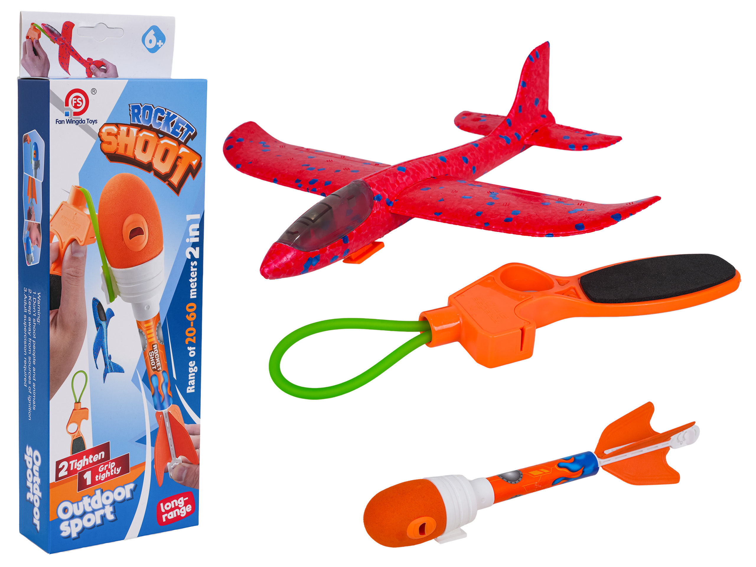 Ideální sada pro hraní na čerstvém vzduchu, lehké, aerodynamicky tvarované letadlo, prak a raketa pro děti od tří let. Letadélko je vyrobeno z lehkého polystyrenu, je odolné a díky své lehkosti může po vystřelení přeletět 20 až 60 metrů. Raketa má gumové zakončení, což zvyšuje bezpečnost jejího používání. K sadě je přiložena prak s gumičkou. Stačí připevnit gumičku k části letadla nebo rakety a vystřelit je na velkou vzdálenost. Skvělá zábava zaručena. Sada nemá ostré hrany, je snadno použitelná a bezpečná pro děti. Raketa je napájena bateriemi (včetně). Po zásahu cíle se její tělo rozzáří barvami. V horní části rakety je také píšťalka.