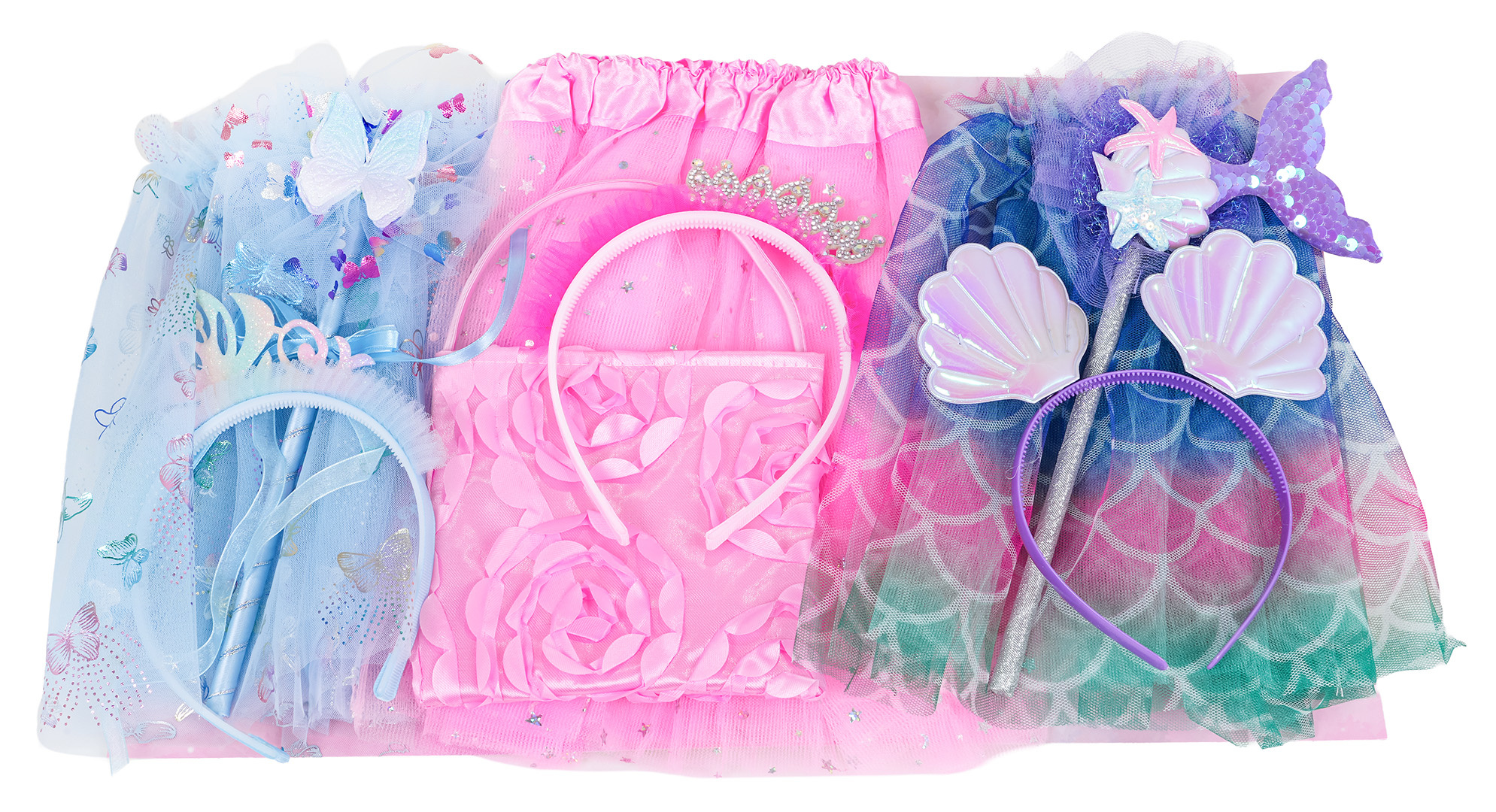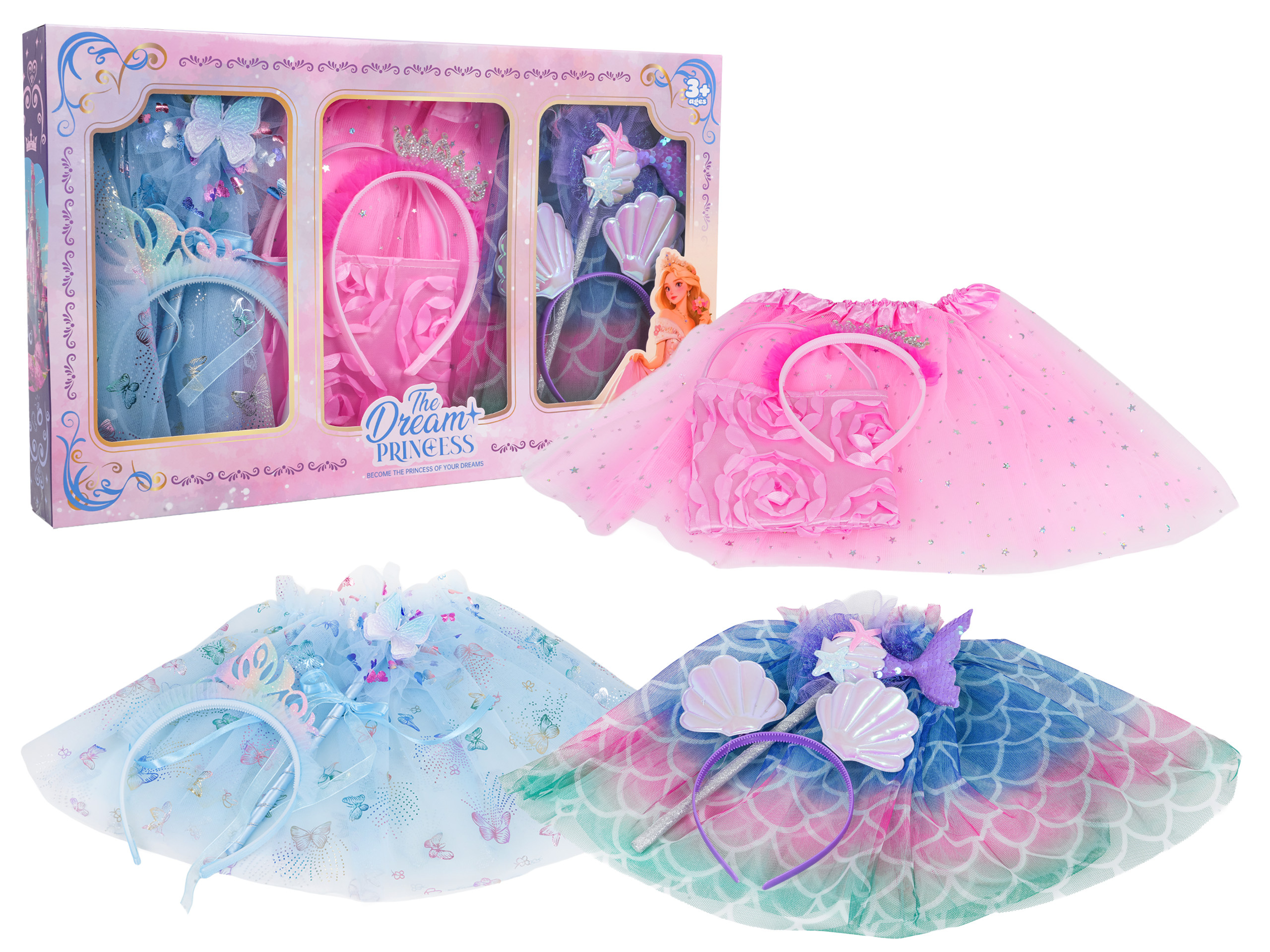 Barevná sada malé princezny pro děti od tří let. Sada byla vyrobena s důrazem na detaily v živých barvách. Skládá se ze tří různobarevných tylových sukní, tří čelenek, kabelky a dvou hůlek. Sada ideální bude na ples, představení nebo pro každodenní zábavu. Teď se vaše ratolest bude moci vžít do role princezny.