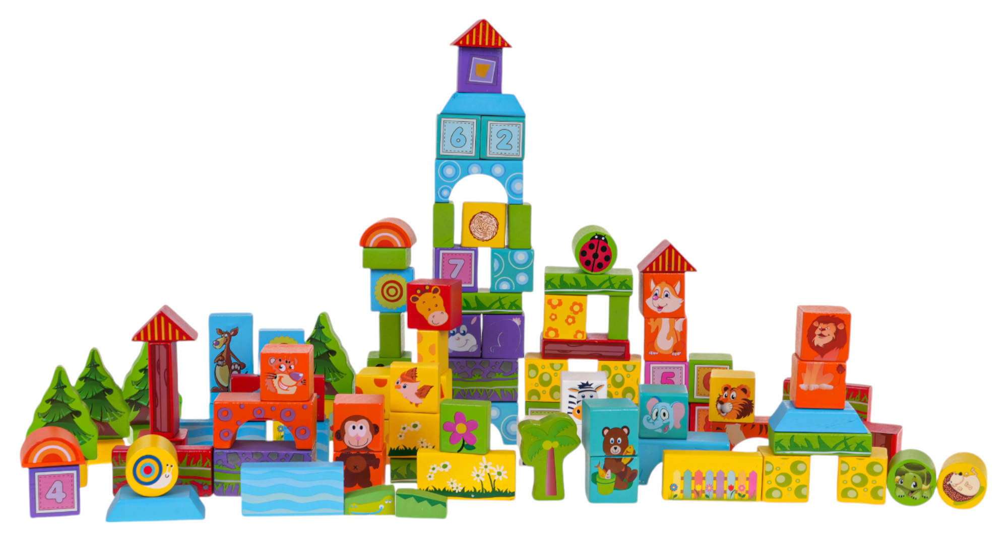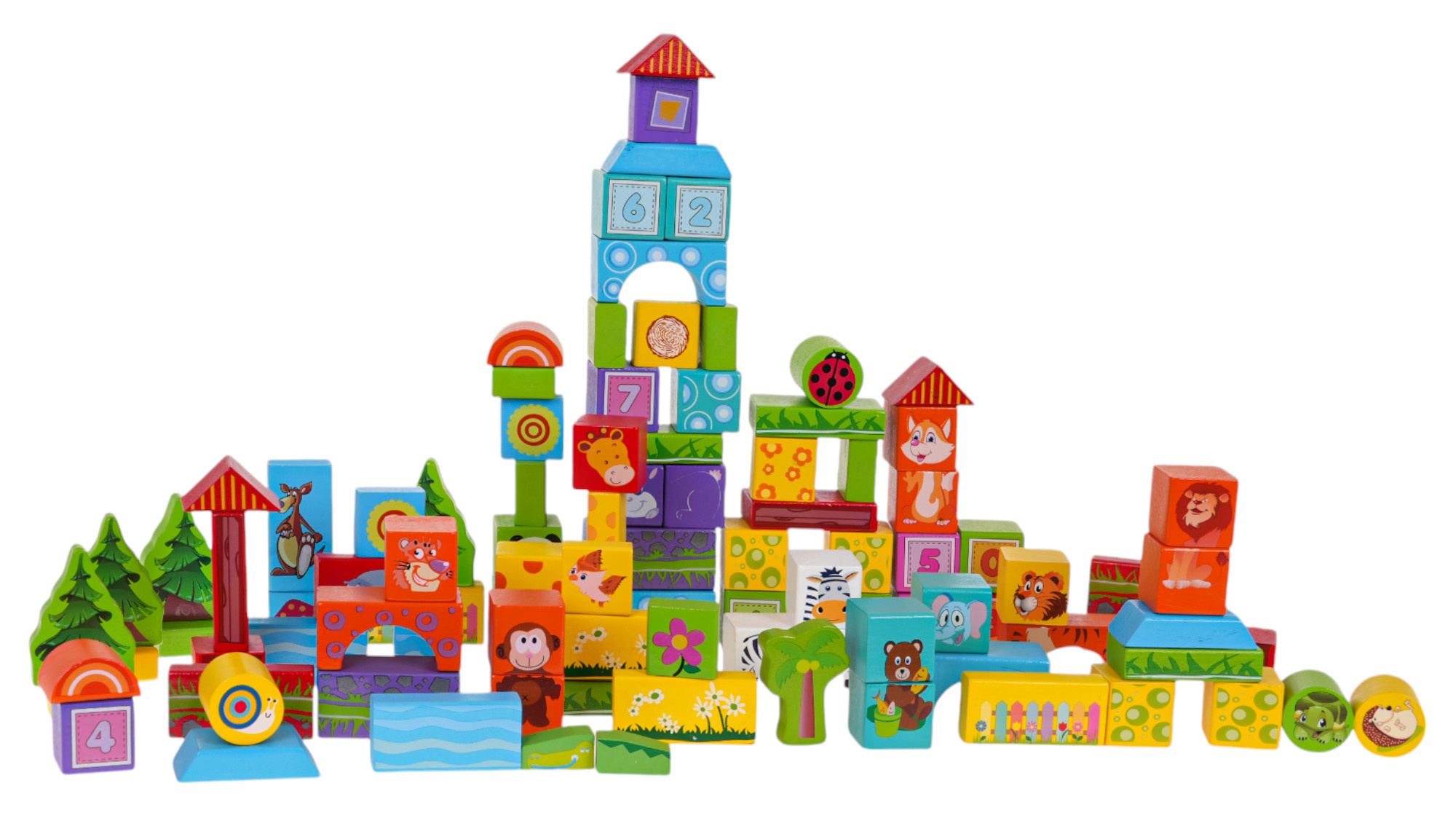 - 100 dřevěných kostek různých barev a tvarů,