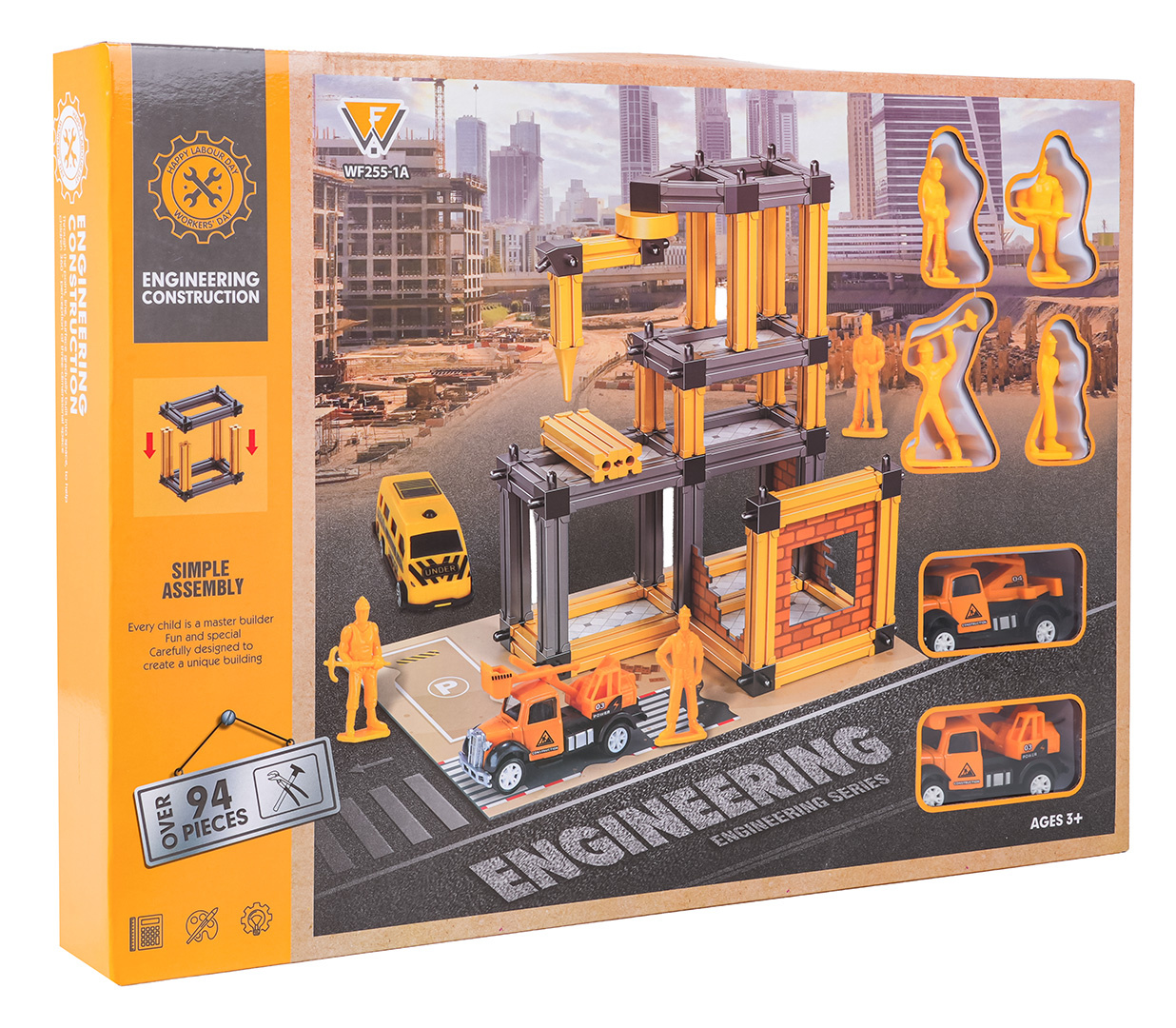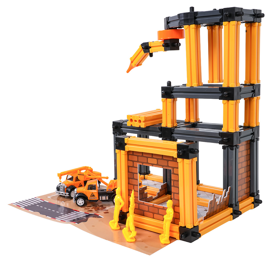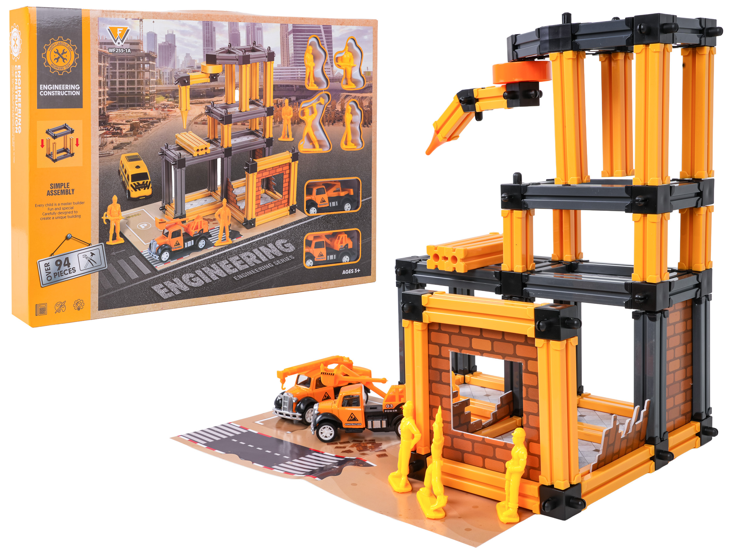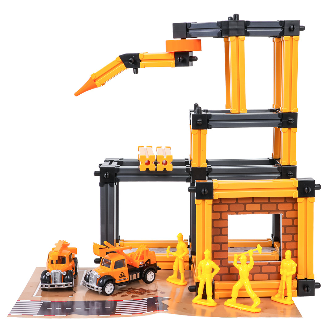 Sada garáž, staveniště, stavební vozidla a figurky pro děti od tří let. Sada je vyrobena z nejkvalitnějších materiálů, které jsou bezpečné pro dítě. V sadě se nacházejí konstrukční části staveniště, podložka pod garáž s nákresem stavby, dvě stavební vozidla a 4 figurky dělníků. Sada ideální pro kreativní zábavu.