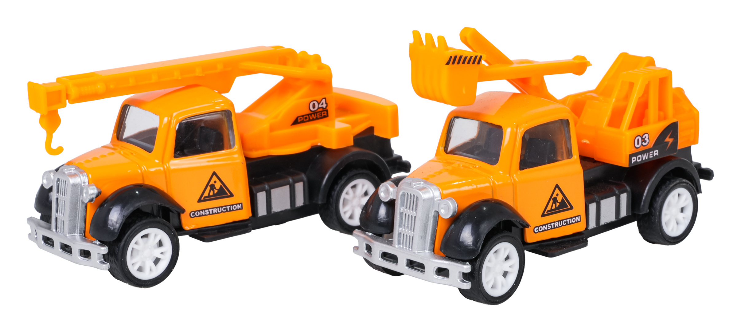 - 2 kovová stavební vozidla: bagr a jeřáb.
