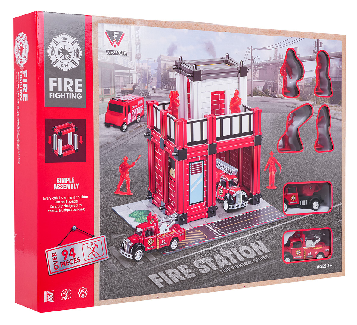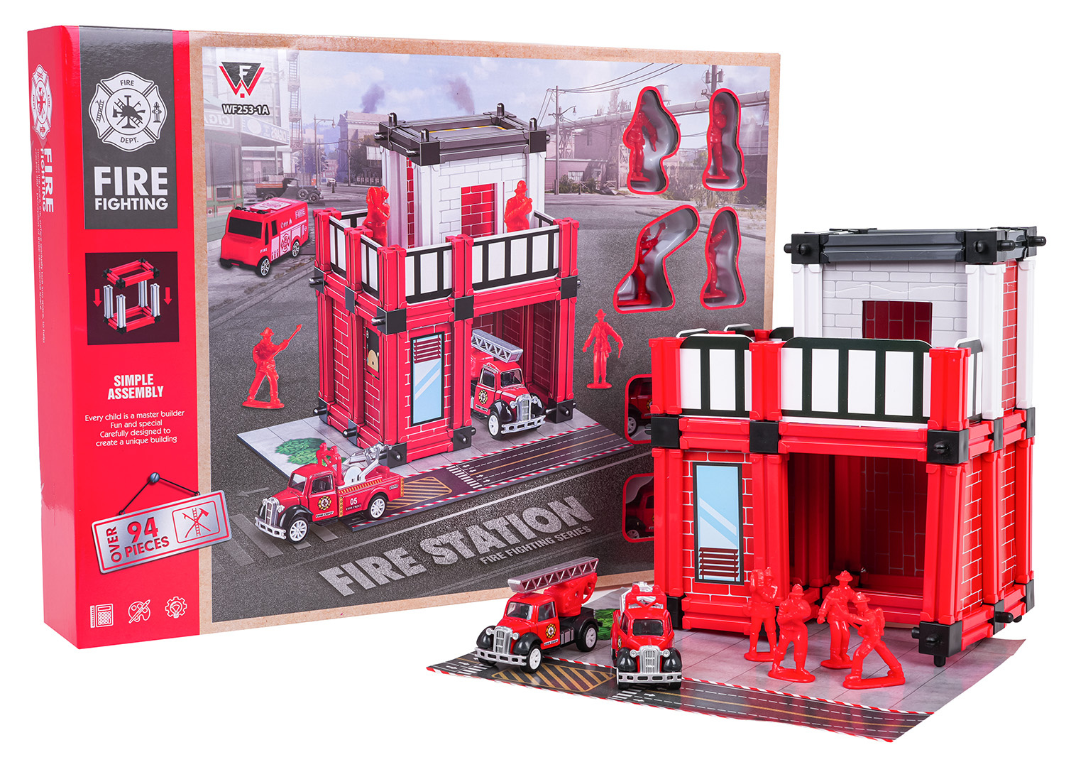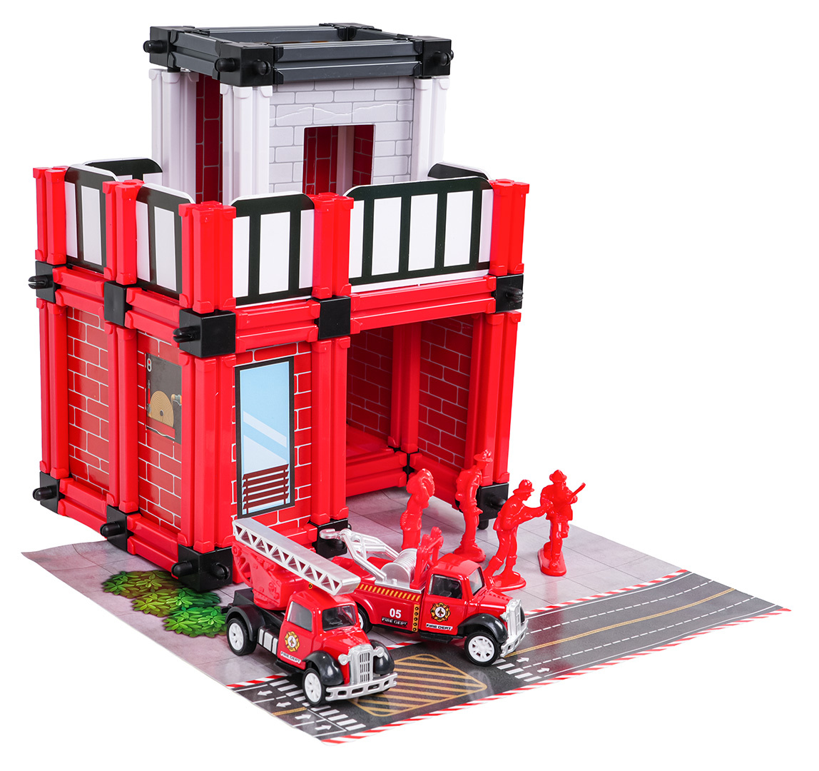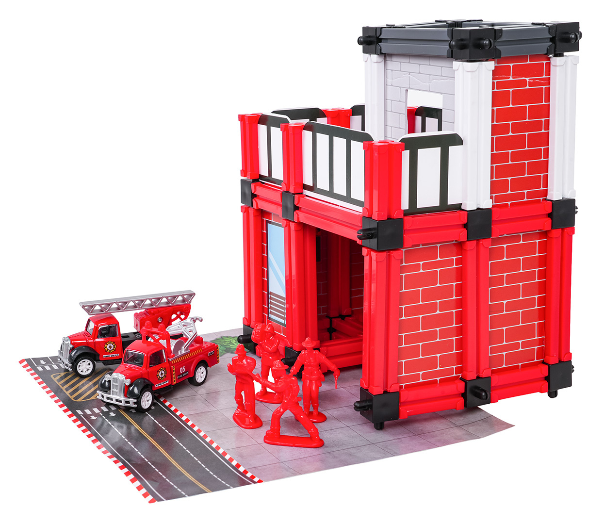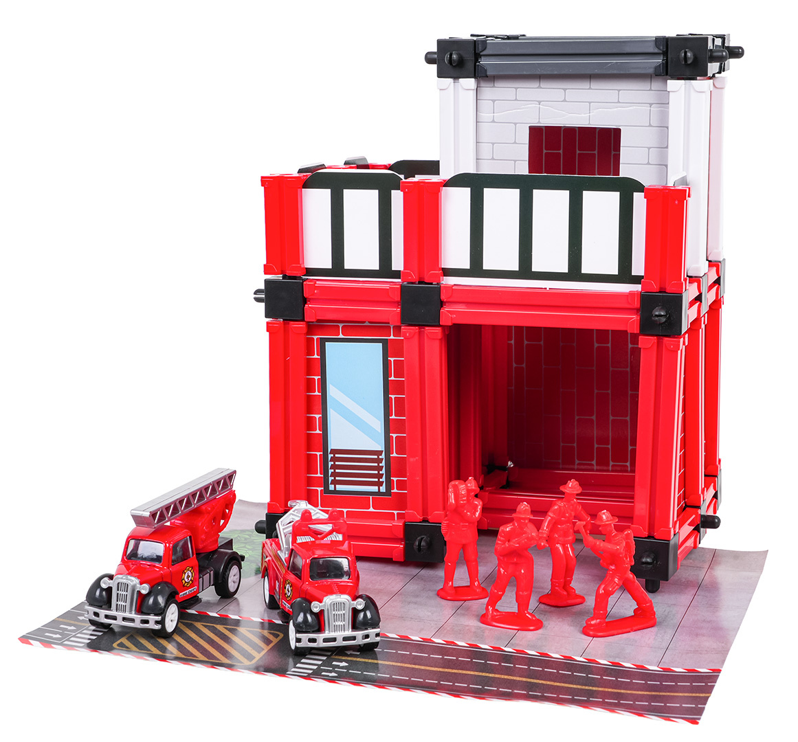 | - konstrukční části hasičské zbrojnice, - 4 figurky hasičů, - 2 hasičská vozidla, - podložka pod remízu. |