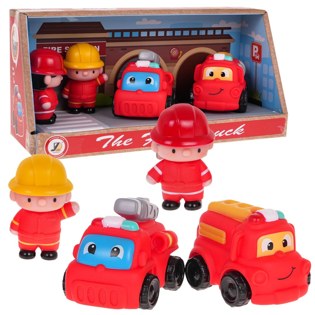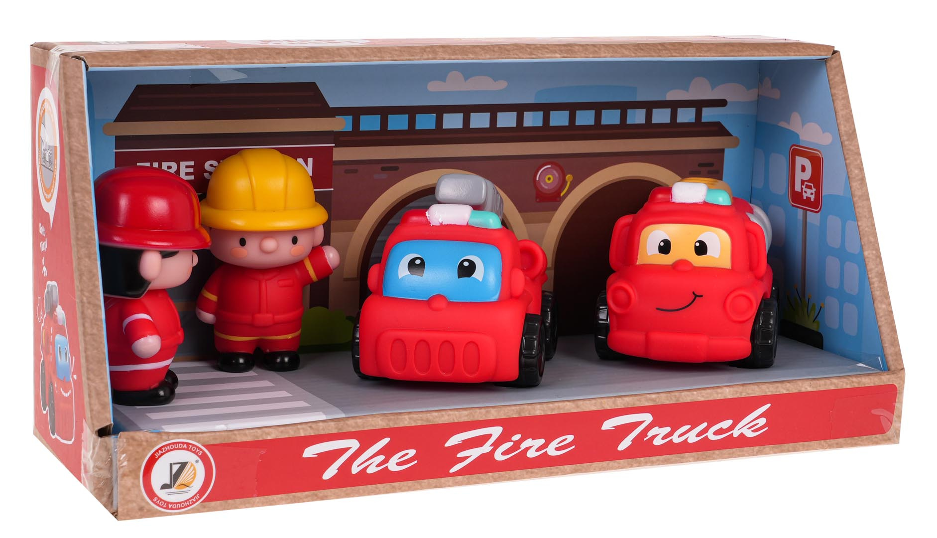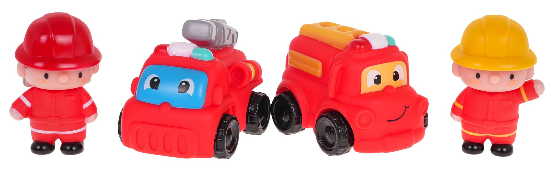 Barevná sada s figurkami hasičů a hasičskými vozidly pro děti od 3 let. Součástí sady jsou dvě figurky hasičů a dvě hasičská autíčka. Autíčka a figurky jsou gumové, kola u vozidel jsou však plastová.