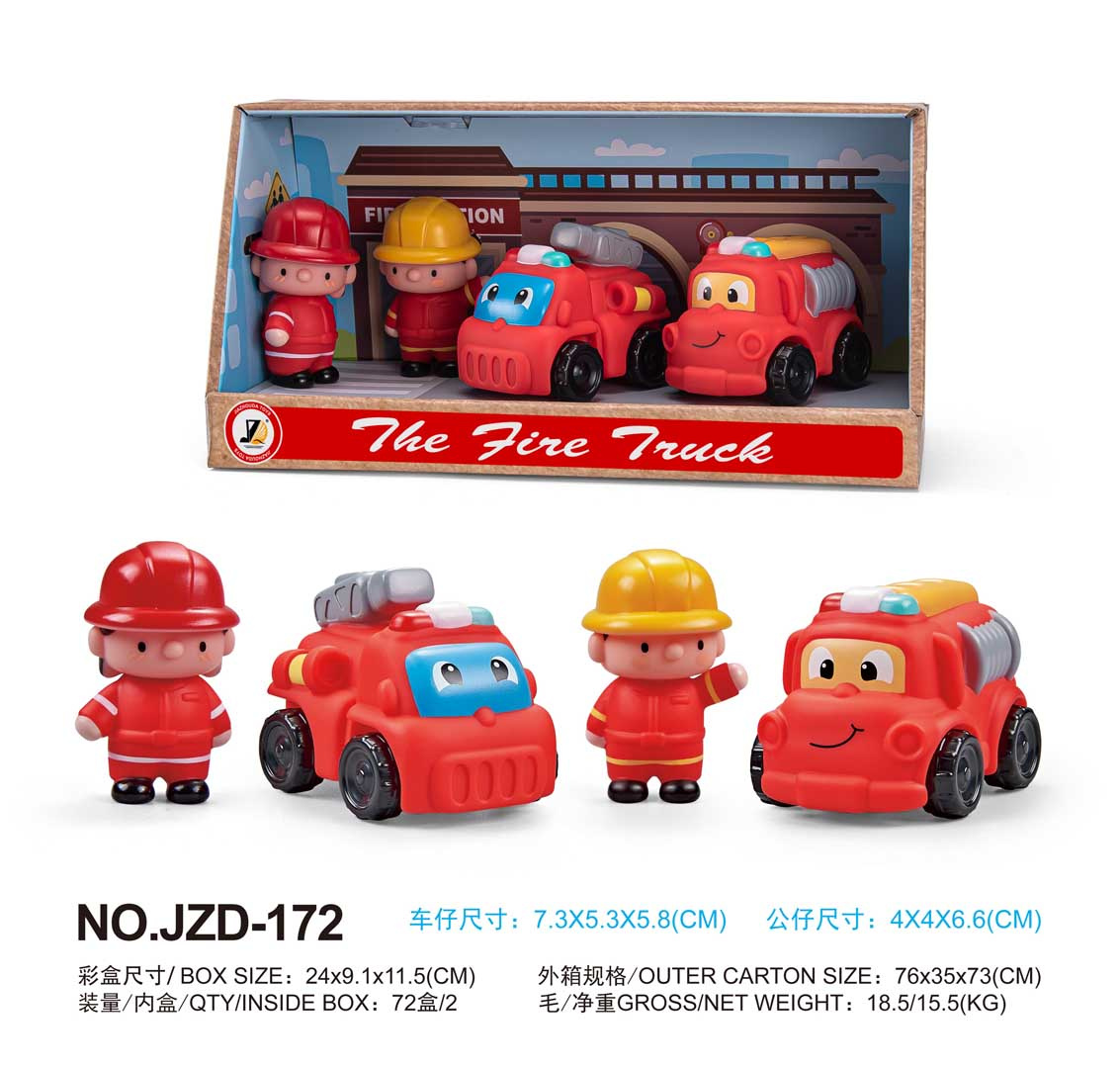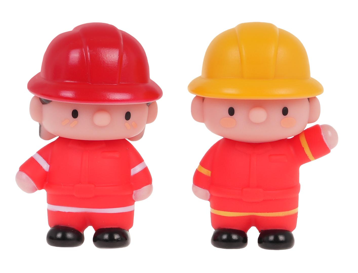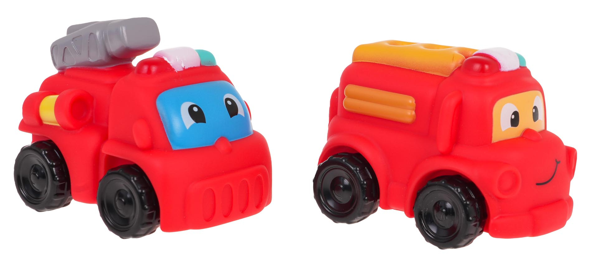 Barevná sada s figurkami hasičů a hasičskými vozidly pro děti od 3 let. Součástí sady jsou dvě figurky hasičů a dvě hasičská autíčka. Autíčka a figurky jsou gumové, kola u vozidel jsou však plastová.