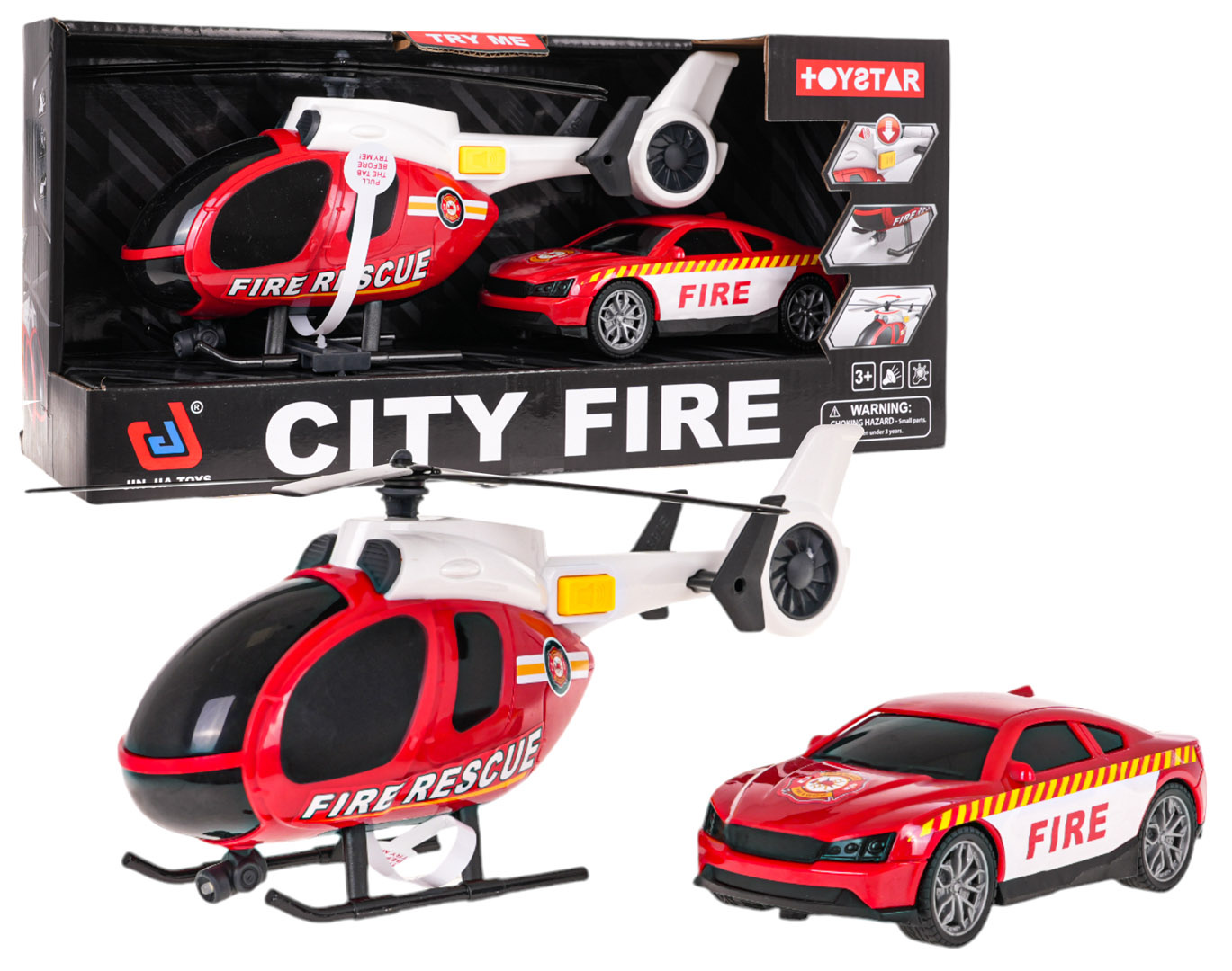 Interaktivní sada hasičského sboru, vrtulník a autíčko pro děti od 3 let. Sada byla vyrobena z nejkvalitnějšího plastu v živých barvách. Helikoptéra má tlačítko aktivující světelné a zvukové funkce. Stisknutí tlačítka spouští přední a zadní osvětlení vrtulníku a zvuky motoru, alarmy a zvuky letu. Helikoptéra je napájena bateriemi typu 3 x AG13 (v balení). Hasičské vozidlo má gumové pneumatiky a volné kolo, které usnadňuje jeho volný pohyb po podkladu. Lopatky vrtulníku můžeme otáčet ručně.