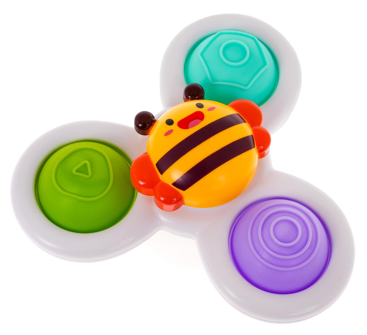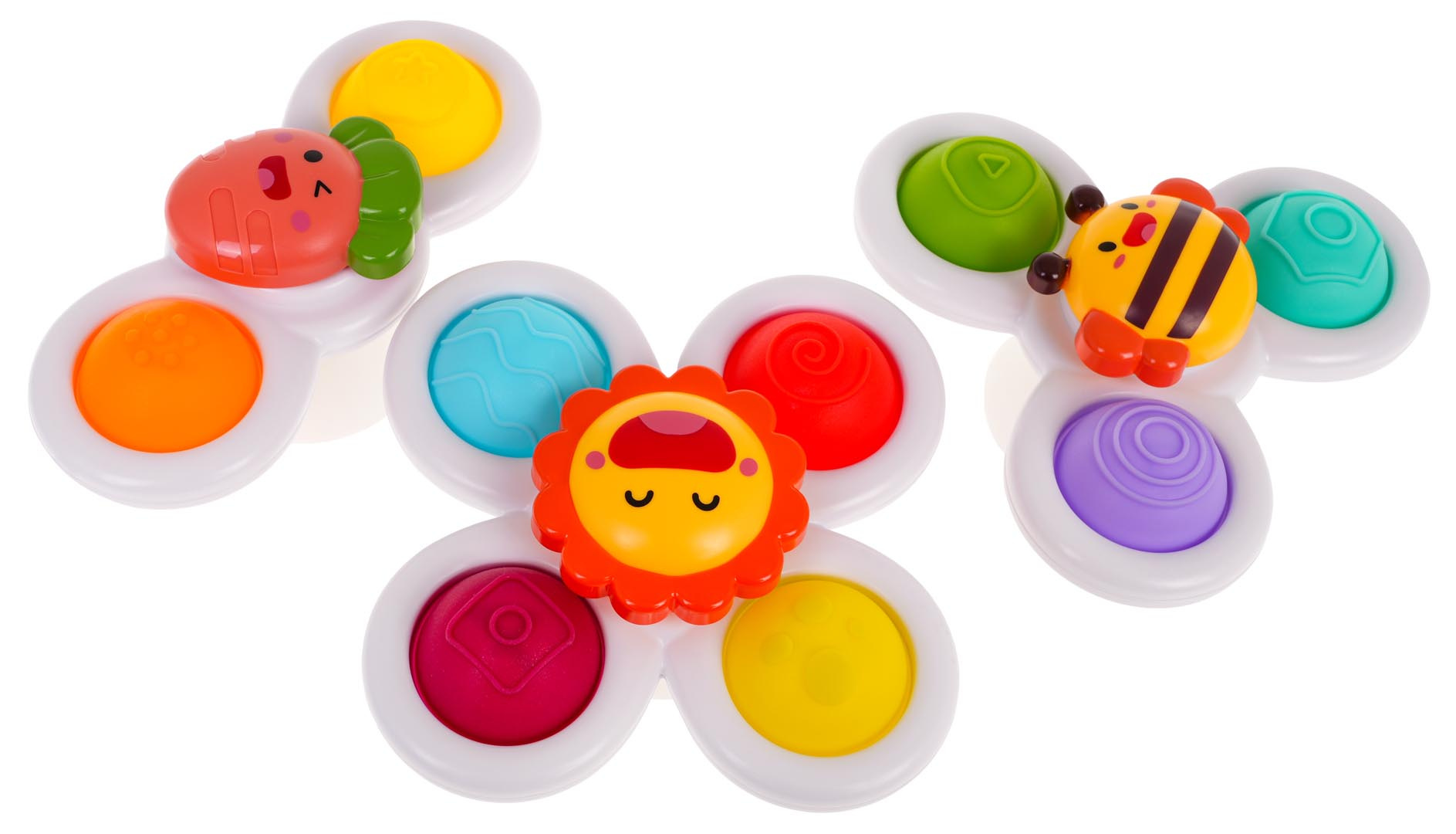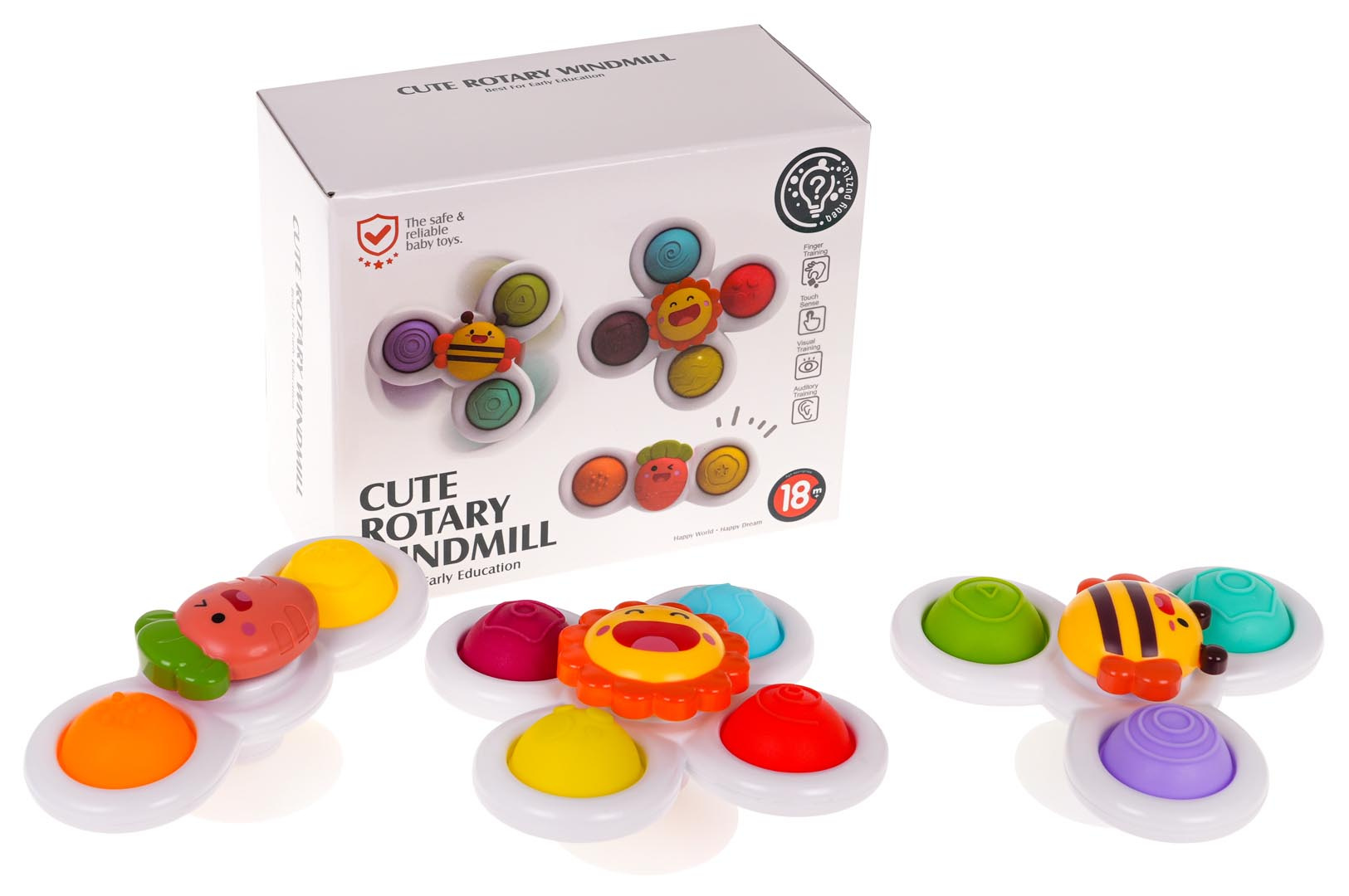 | Sada spinnerů s přísavkami, pro nejmenší od 18 měsíců věku. Sada se skládá ze spinneru se sluníčkem, včelkou a mrkví. Na zadní části hračky se nachází silná přísavka, díky které lze hračku připevnit k různým povrchům, např. na skle, vaně nebo stolku. Hračka je vodotěsná, lze ji používat během koupele, odolná ložiska zajišťují dlouhotrvající a plynulý otáčení. Díky gumovým prvkům k mačkání dítě stimuluje smysly a zároveň se uvolňuje. Hračky vyrobené z vysoce kvalitních materiálů, v živých barvách.