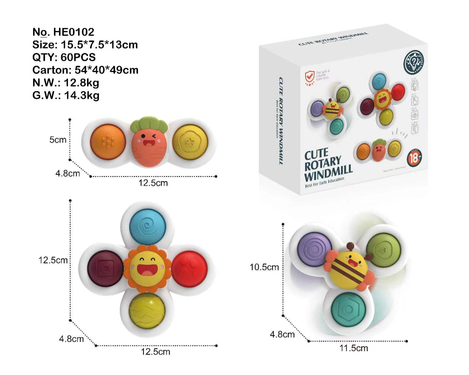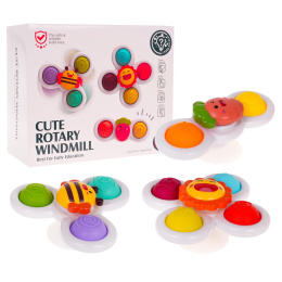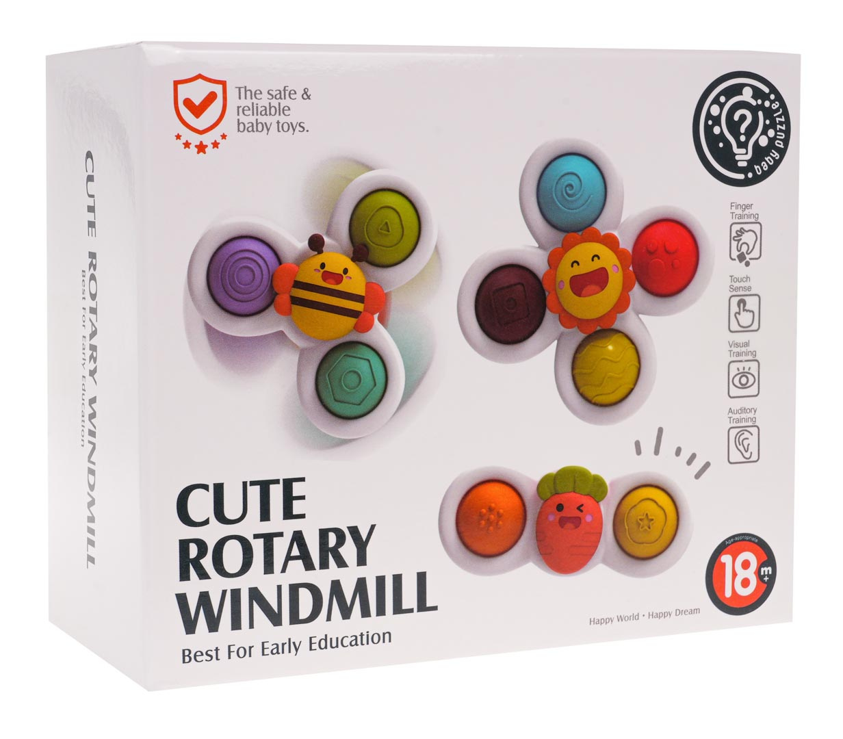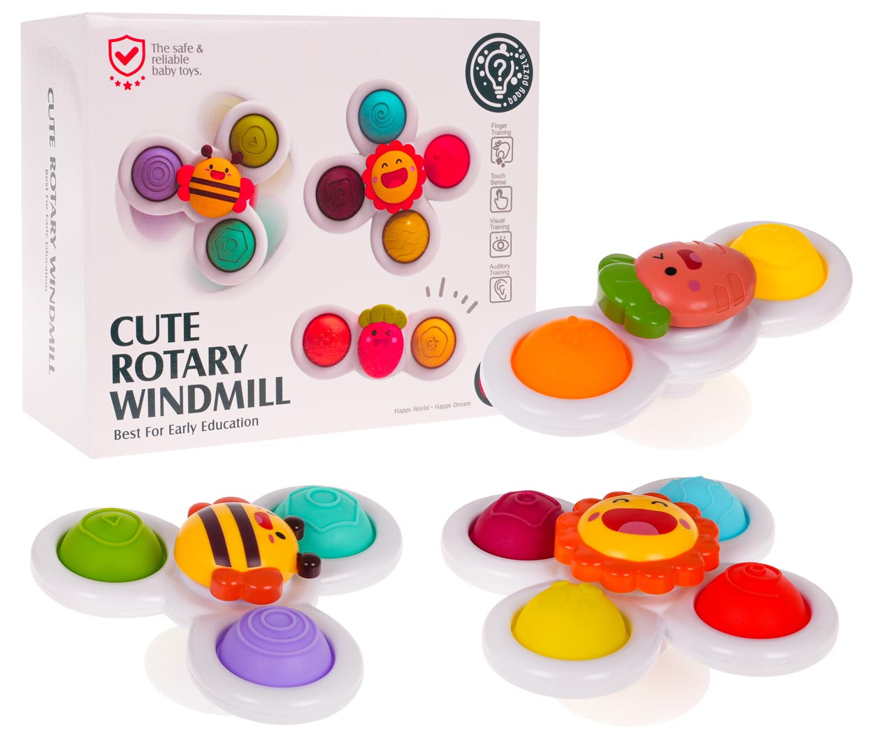 | Sada spinnerů s přísavkami, pro nejmenší od 18 měsíců věku. Sada se skládá ze spinneru se sluníčkem, včelkou a mrkví. Na zadní části hračky se nachází silná přísavka, díky které lze hračku připevnit k různým povrchům, např. na skle, vaně nebo stolku. Hračka je vodotěsná, lze ji používat během koupele, odolná ložiska zajišťují dlouhotrvající a plynulý otáčení. Díky gumovým prvkům k mačkání dítě stimuluje smysly a zároveň se uvolňuje. Hračky vyrobené z vysoce kvalitních materiálů, v živých barvách.