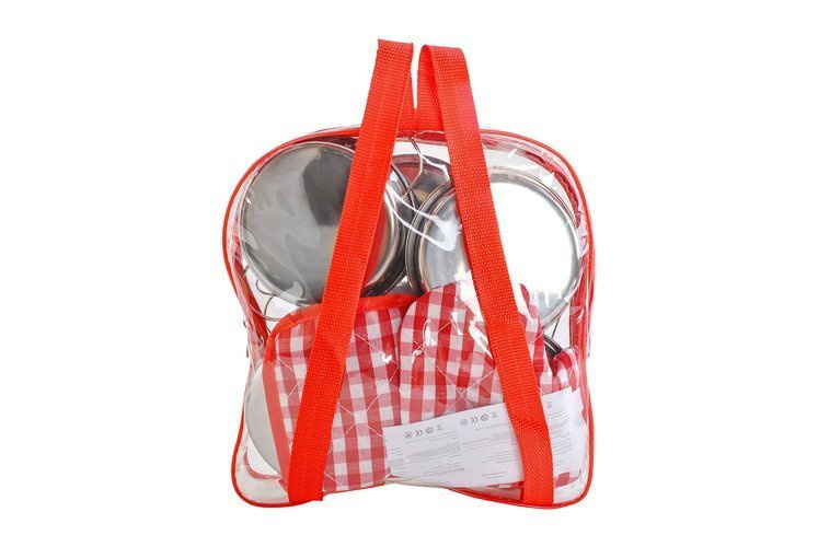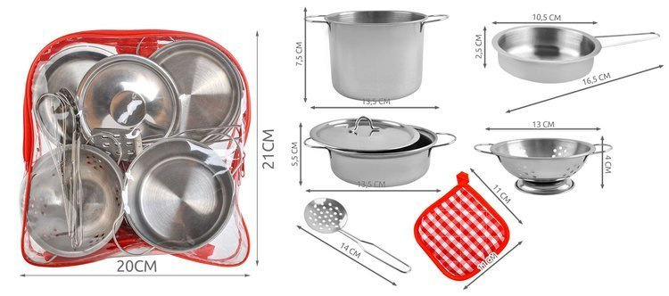 13 POLOŽEK - sada obsahuje 13 prvků, tzn. vše, co je potřeba pro malého kuchaře : 2 hrnce, pánev, cedník, poklička (vejde na každý hrnec), sada různých lžic, batoha materiálová podložka s rukavicí .
