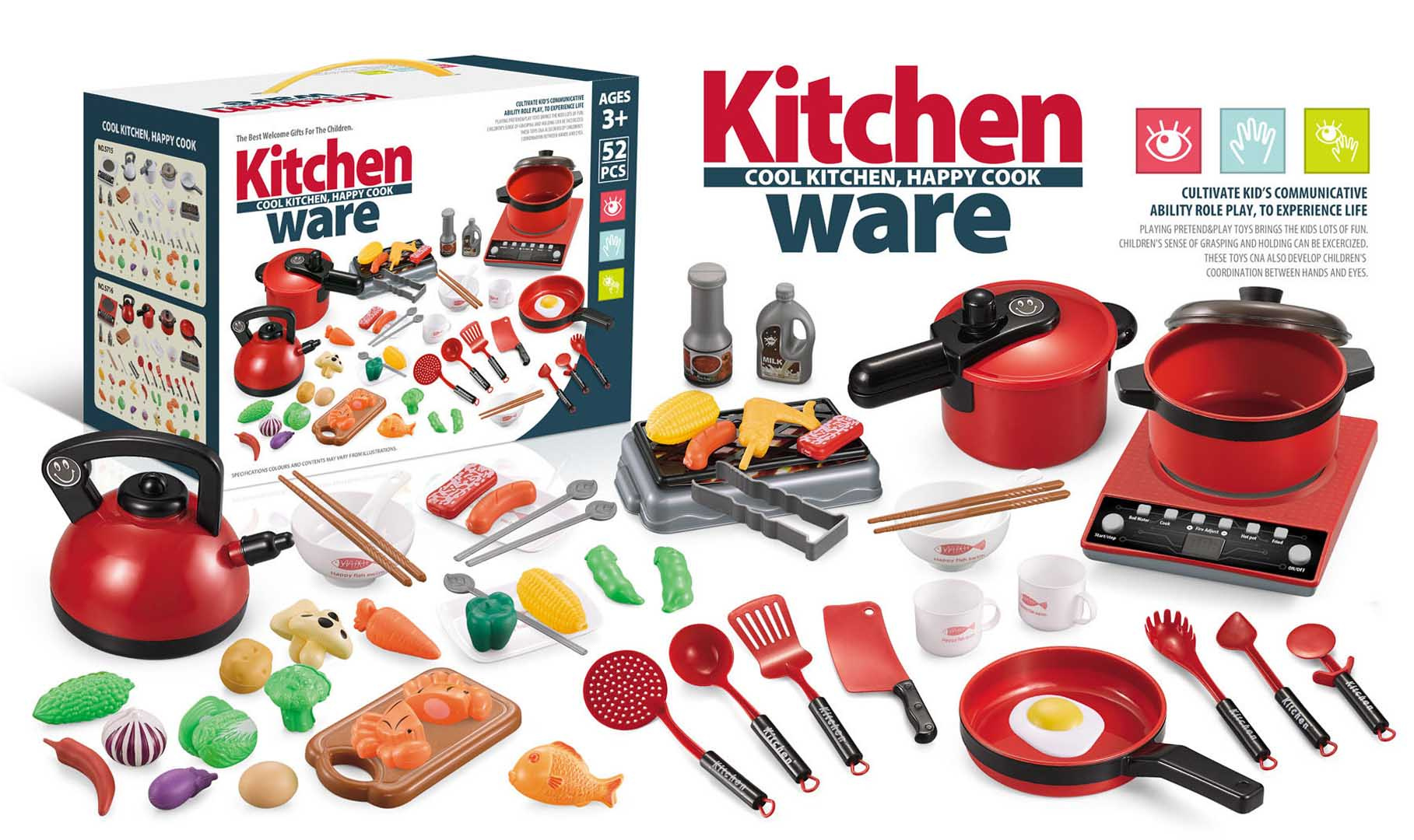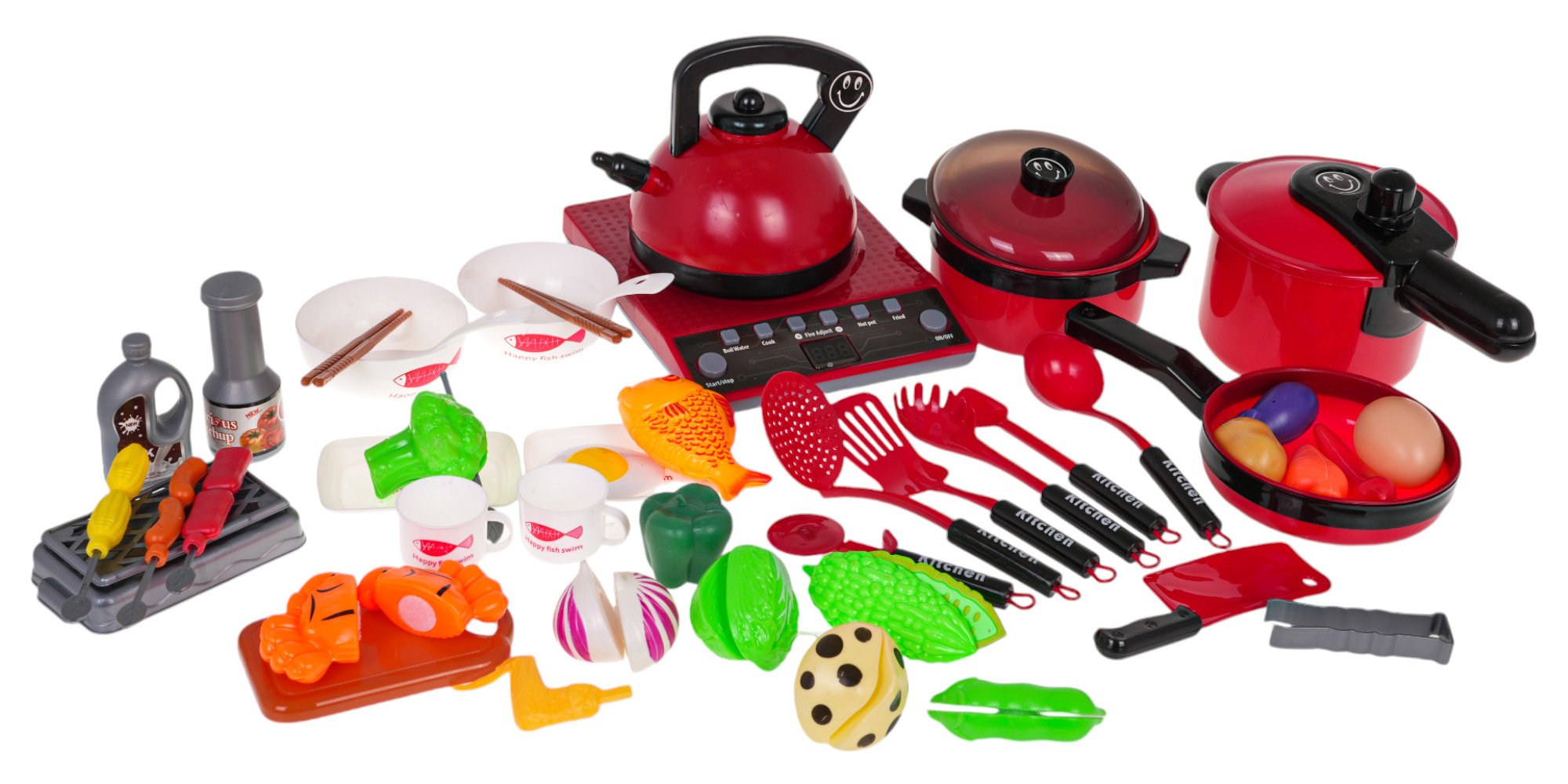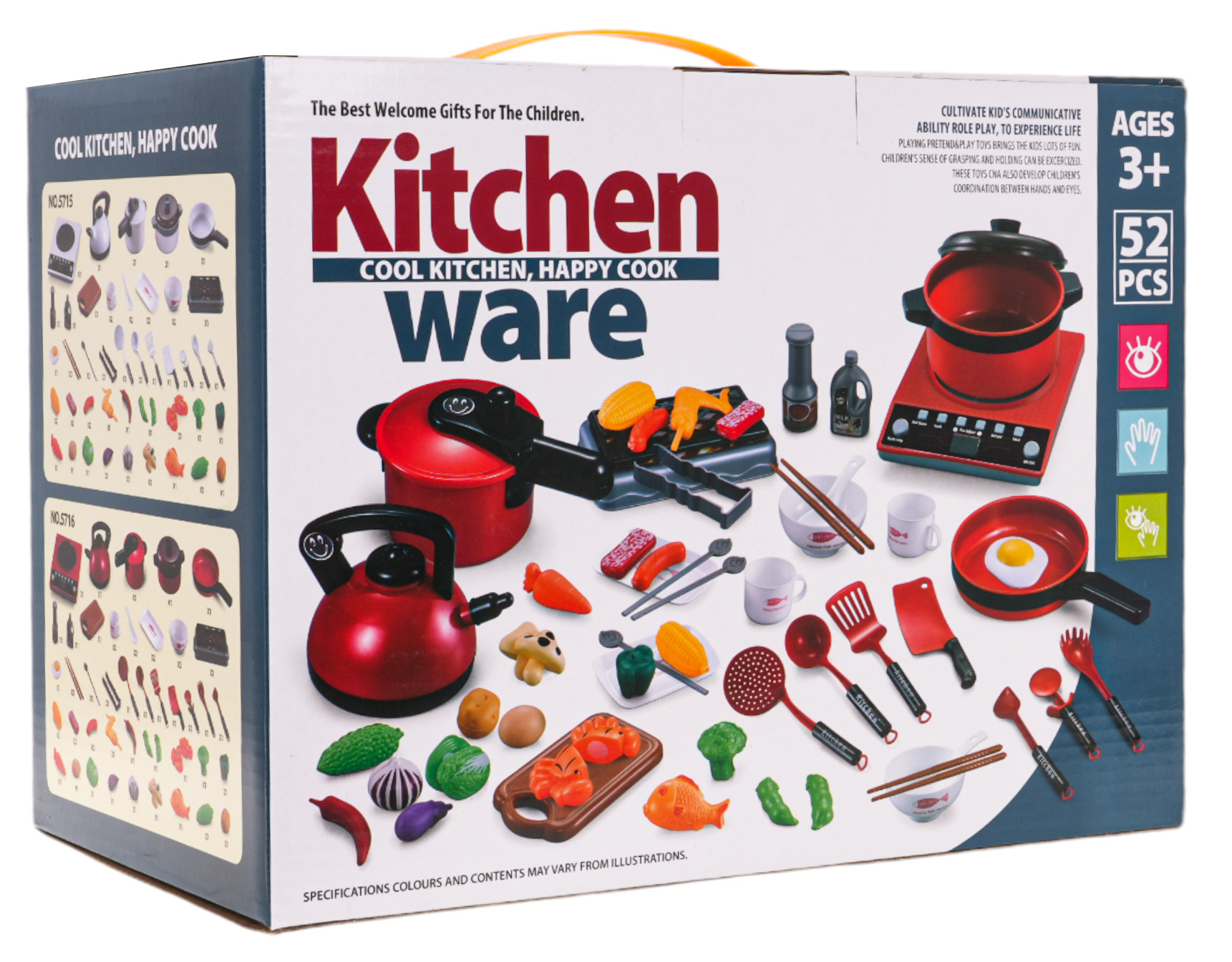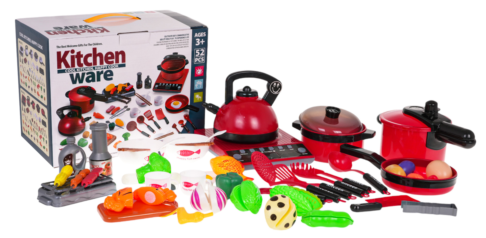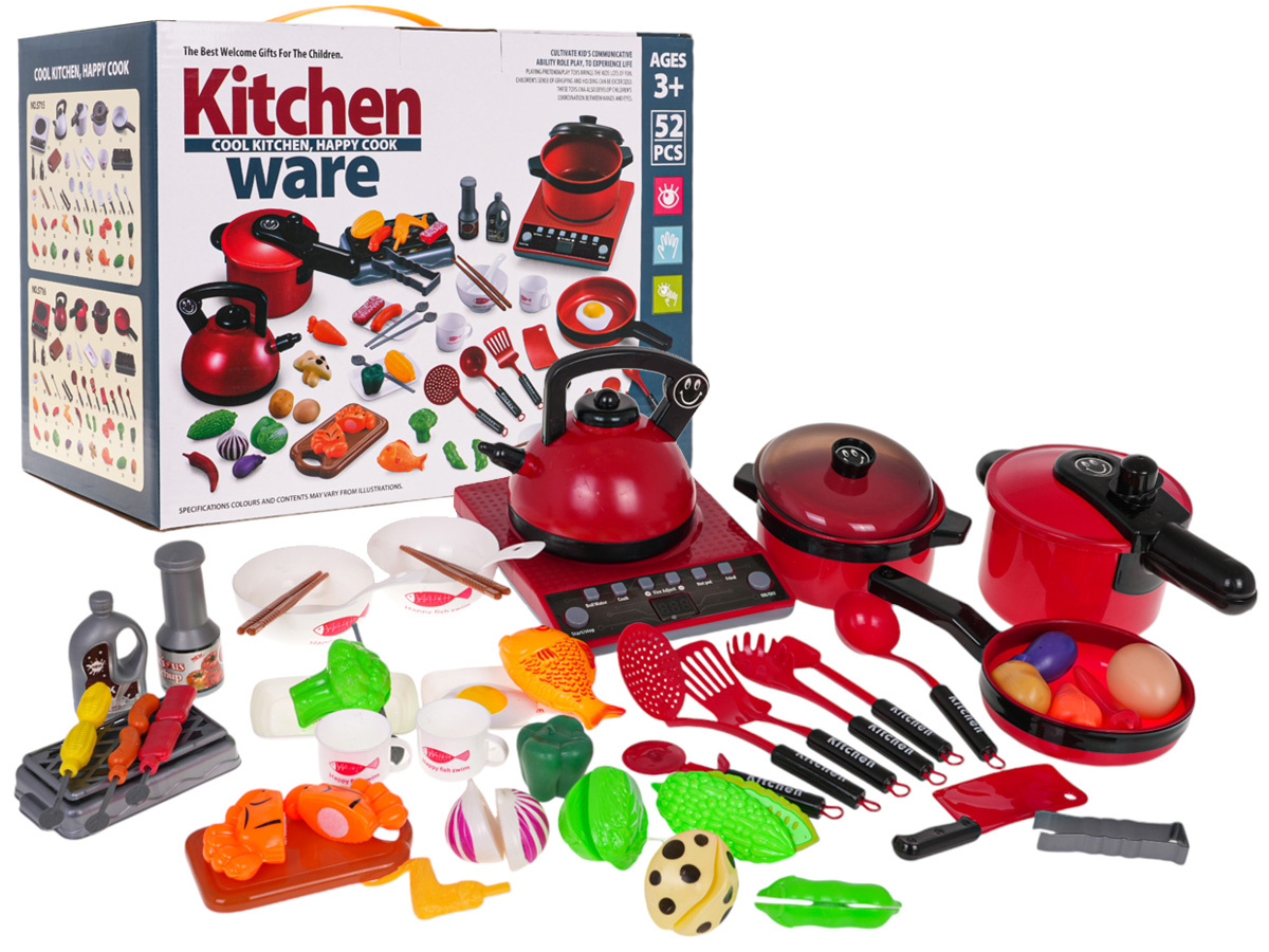 Bohatě vybavená kuchyňská sada pro děti od 3 let. Sada obsahuje 52 prvků: interaktivní sporák, tlakový hrnec, konvici, hrnec s pokličkou, pánev a spoustu kuchyňských nástrojů a atrapy potravin. Sporák je napájen bateriemi typu 3 x AA 1,5 V (nejsou součástí balení), má zvuky smažení a vaření a podsvícený hořák. Na displeji máme také uvedený výkon ohřevu, který můžeme regulovat. Sada byla vyrobena s důrazem na detaily v živých barvách.