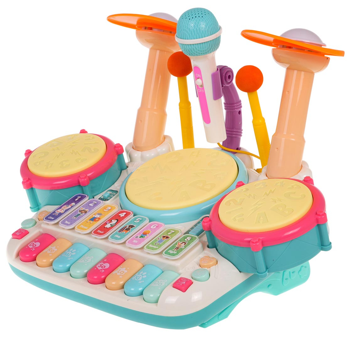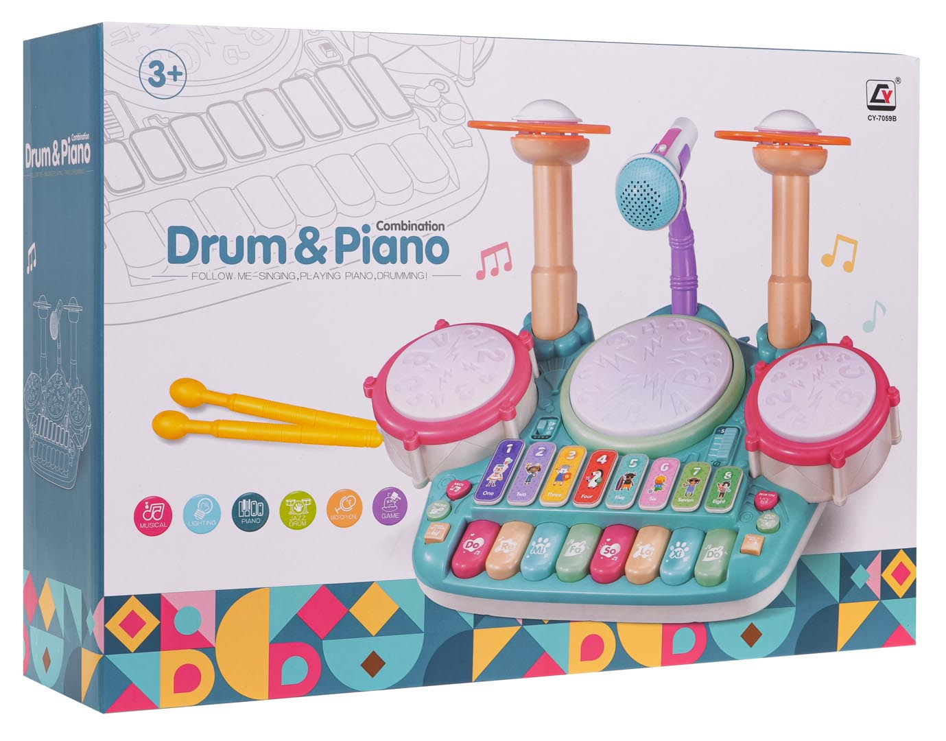 Interaktivní hudební sada, piánko s bicími pro děti od 3 let. Hudební hračka byla vyrobena z nejkvalitnějšího plastu v živých barvách, které dítě povzbuzují ke hře a učení se hrát na nástroje. Hračka kombinuje bicí a piánko, je také vybavena mikrofonem s ozvučením. Klávesy generují zvuk klavíru, trubky, kytary, zvuky zvířátek, názvy číslic. 3 bubny a činely se rozsvítí při každém úderu paličkami. Máme také režim učení, ve kterém se rozsvěcují světla na bubnech (jedno světlo, dvojité, trojité - s různou rychlostí), učící dítě vyťukávat rytmy. Hudební hračka má regulaci hlasitosti a vstup pro mikrofon přiložený k sadě. Hračka je napájena bateriemi typu 4 x AA 1,5 V (nejsou součástí balení).
