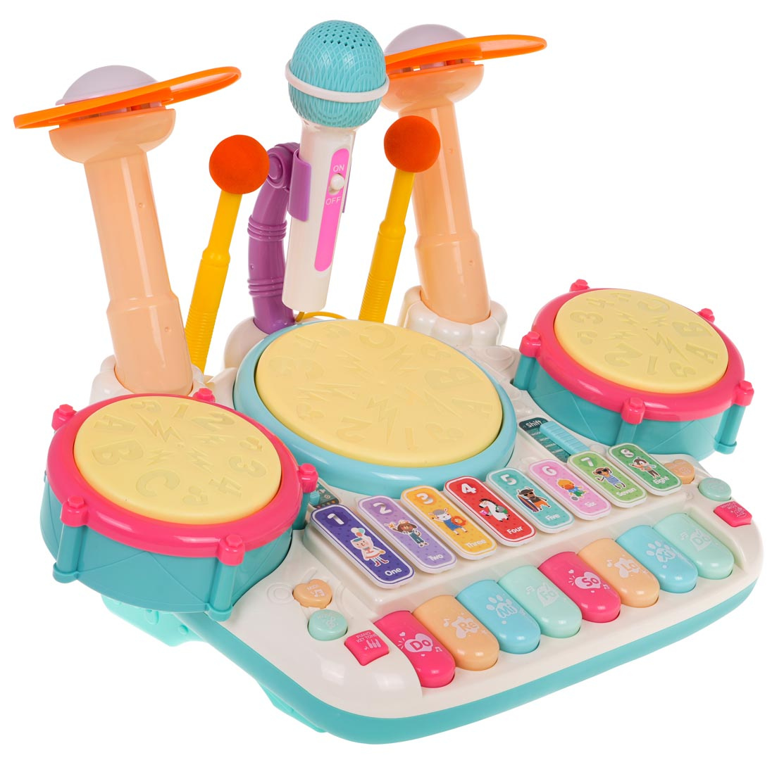 Interaktivní hudební sada, piánko s bicími pro děti od 3 let. Hudební hračka byla vyrobena z nejkvalitnějšího plastu v živých barvách, které dítě povzbuzují ke hře a učení se hrát na nástroje. Hračka kombinuje bicí a piánko, je také vybavena mikrofonem s ozvučením. Klávesy generují zvuk klavíru, trubky, kytary, zvuky zvířátek, názvy číslic. 3 bubny a činely se rozsvítí při každém úderu paličkami. Máme také režim učení, ve kterém se rozsvěcují světla na bubnech (jedno světlo, dvojité, trojité - s různou rychlostí), učící dítě vyťukávat rytmy. Hudební hračka má regulaci hlasitosti a vstup pro mikrofon přiložený k sadě. Hračka je napájena bateriemi typu 4 x AA 1,5 V (nejsou součástí balení).Celý popis