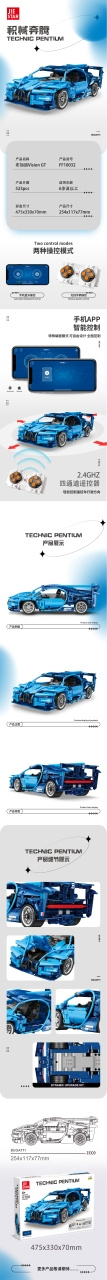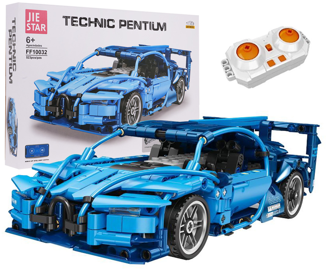 Sada 523 stavebních kostek pro vlastní sestavení modrého sportovního auta s funkcí dálkového ovládání. Hračka určená pro děti od 6 let. Kostky a části autíčka jsou vyrobeny z vysoce kvalitního plastu. Auto má pohyblivé prvky, jako jsou otevírací dveře a kapota.