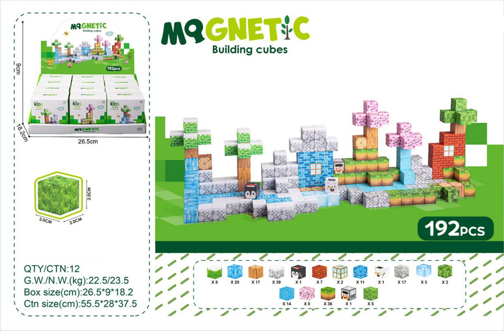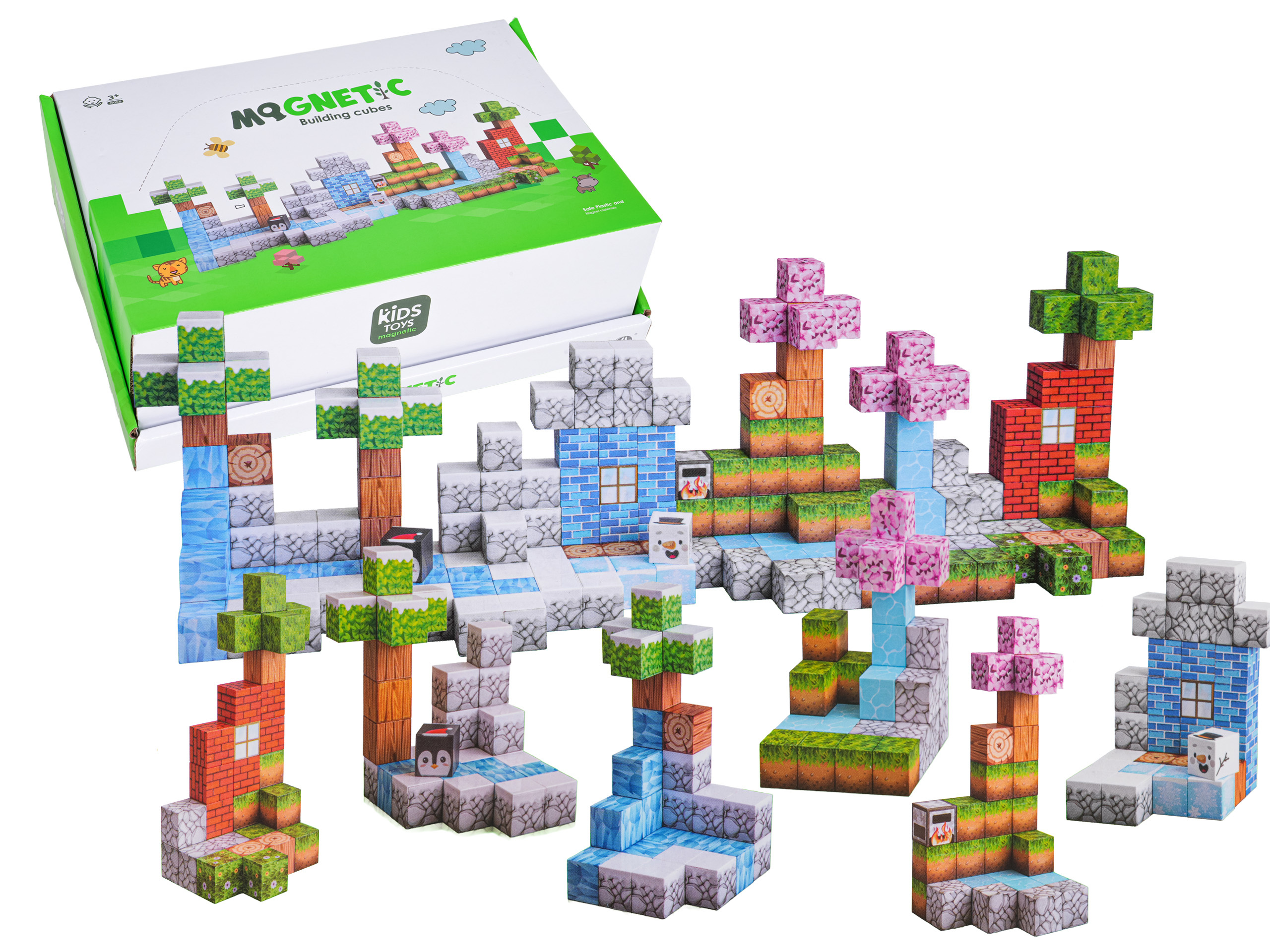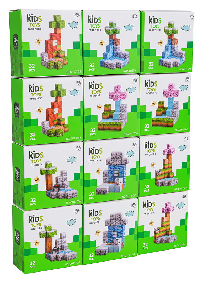 Sada 384 barevných kostek, magnetických 3D kostek pro děti od tří let. Magnetické kostky jsou vyrobeny z nejkvalitnějších materiálů v živých barvách. Lze z nich postavit různé konstrukce. Neodymové magnety velmi pevně drží, vytvářejí stabilní konstrukci. Skládání kostek učí logickému myšlení a procvičuje ruce dětí. V sadě se nachází 12 krabiček, a v každé 32 kostek pro stavbu různých konstrukcí.