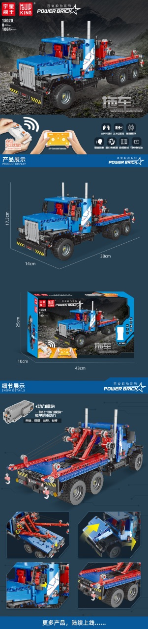 Nákladní auto má mnoho pohyblivých prvků, jako je otevírací kapota a dveře do kabiny řidiče a pohyblivá zrcátka. Dále je možnost zvedání a spouštění výložníků a tažného háku. V sadě je přiložen obrazový návod. Skládání stavebních kostek rozvíjí u dětí manuální dovednosti, prostorovou představivost a trpělivost. Bolid je napájen akumulátorem 3,7V (v balení), ovladač je napájen bateriemi 2 x AAA 1,5V (nejsou součástí balení).