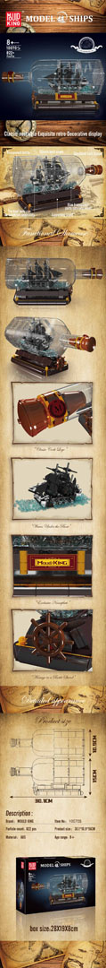 Vysoce kvalitní stavební kostky Mould King pro děti od osmi let. Sada se skládá ze 792 prvků, ze kterých lze postavit pirátskou loď v láhvi. Tento skvělý model jistě upoutá pozornost svými detaily.