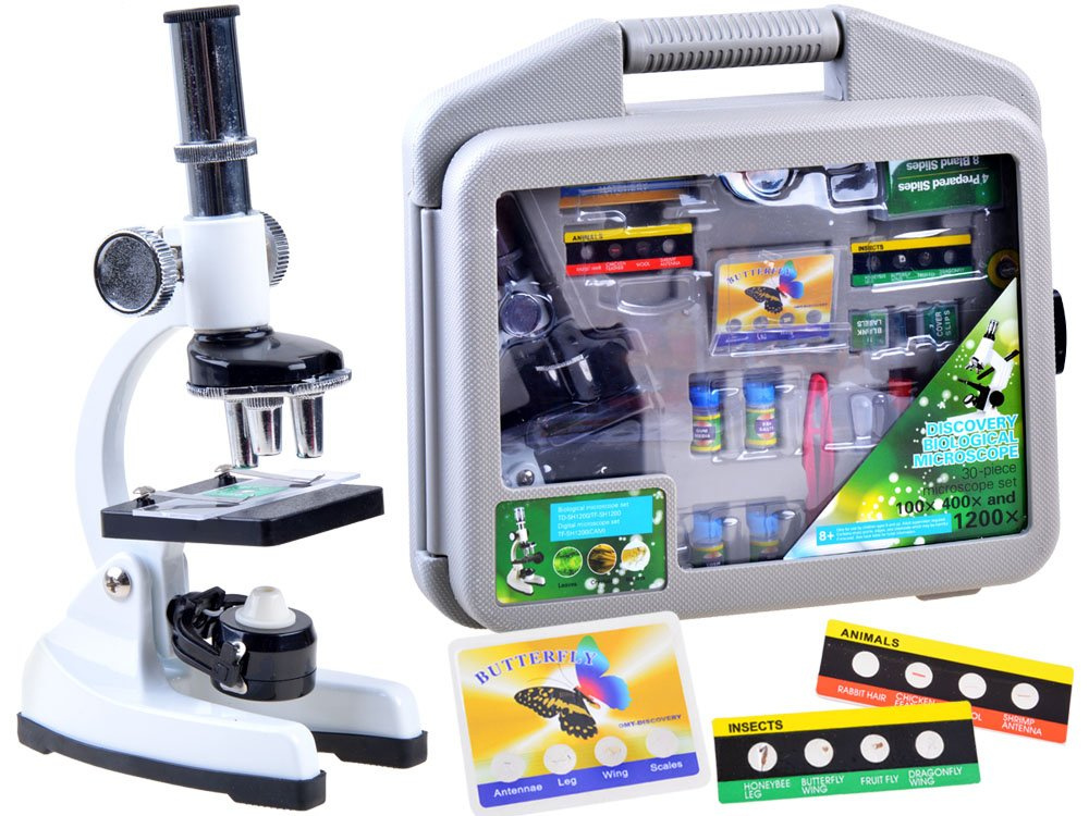 Vzdělávací sada pro malé vědce, která se skládá z mikroskopu s příslušenstvím, je skvělým způsobem, jak dítě seznámit se světem vědy a přírody. Umožní vám vidět to, co pouhým okem vidět nelze. Mikroskop je vyroben z kovu v kombinaci s plastem velmi pečlivě a s důrazem na detail. Mikroskop má otočnou hlavu se třemi objektivy, které umožňují zvětšení 100x/600x/1200x, a vestavěnou žárovku pro osvětlení prohlížených vzorků.
