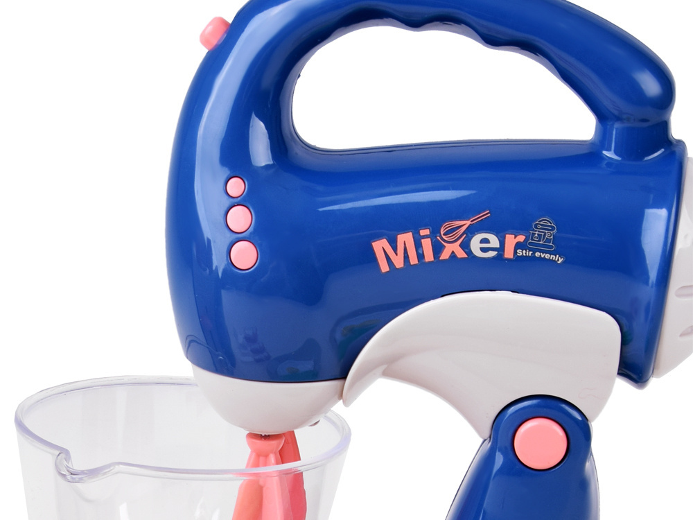 Mixér je stejně jako topinkovač vyroben výhradně z plastu, v příjemné jemné barvě, která se jistě hodí do každé kuchyně, je napájen z baterií (prostor pro baterie najdeme v mixéru na spodní straně po vyjmutí ze stojanu). Během provozu se rozsvítí kontrolka LED signalizující, že zařízení pracuje. Hračky vydávají realistický zvuk. Mixér je dodáván s podstavcem, takže se malí pečovatelé budou moci odtrhnout, když si náhodou začnou připalovat toasty.