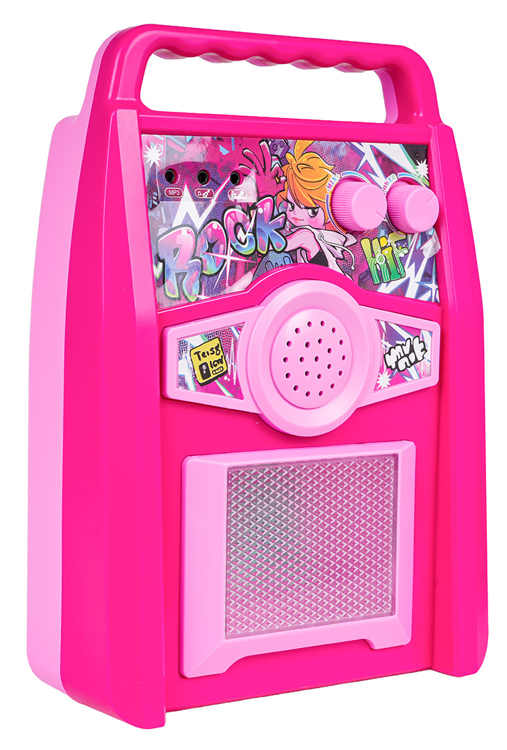 | Elektrická kytara se zesilovačem a mikrofonem na stojanu, pro děti od třetího roku života. Kytara má regulaci hlasitosti, různé rytmy, zvukové efekty a osm hotových melodií. Hračka je napájena bateriemi typu 3 x AA 1,5 V (nejsou součástí balení). Zesilovač umožňuje připojení kytary, mikrofonu, lze také připojit zařízení s nahranými melodiemi MP3. Na zesilovači se nacházejí knoflíky pro regulaci hlasitosti kytary a hlasu v mikrofonu, ve spodní části blikají v rytmu melodie barevná světýlka. Zesilovač je napájen bateriemi typu 3 x AA 1,5 V (nejsou součástí balení). Stojan na mikrofon můžeme regulovat nahoru a dolů.