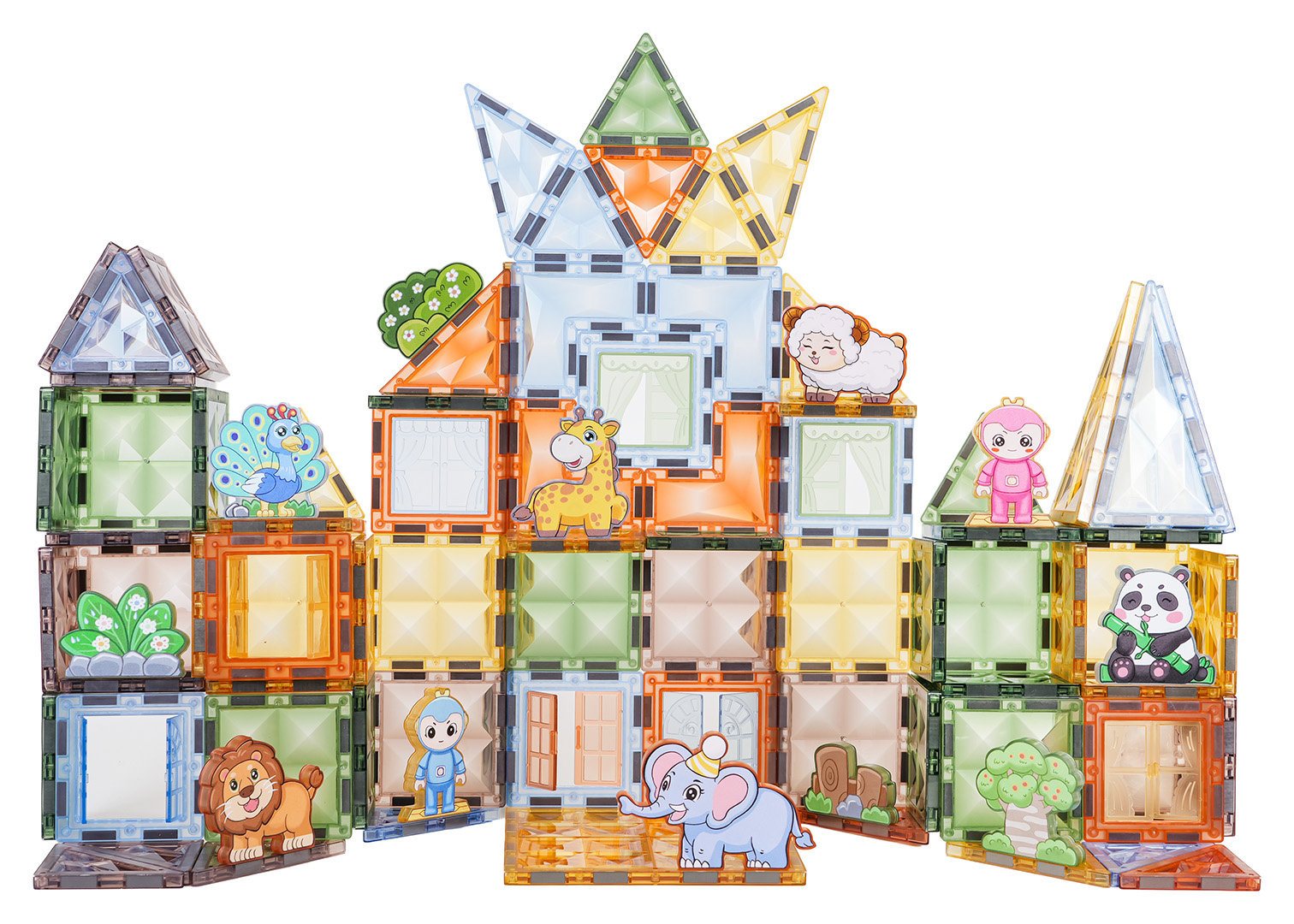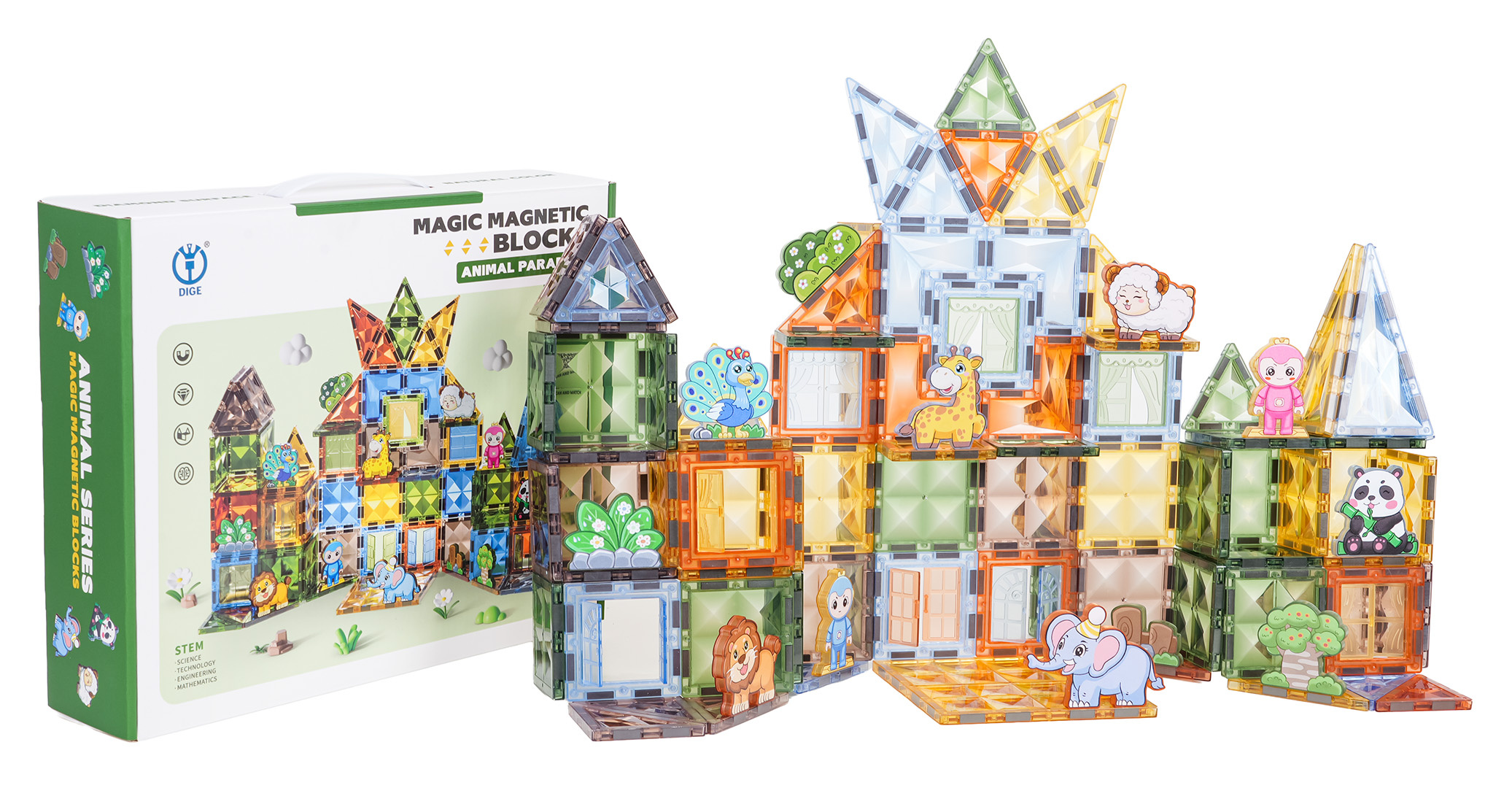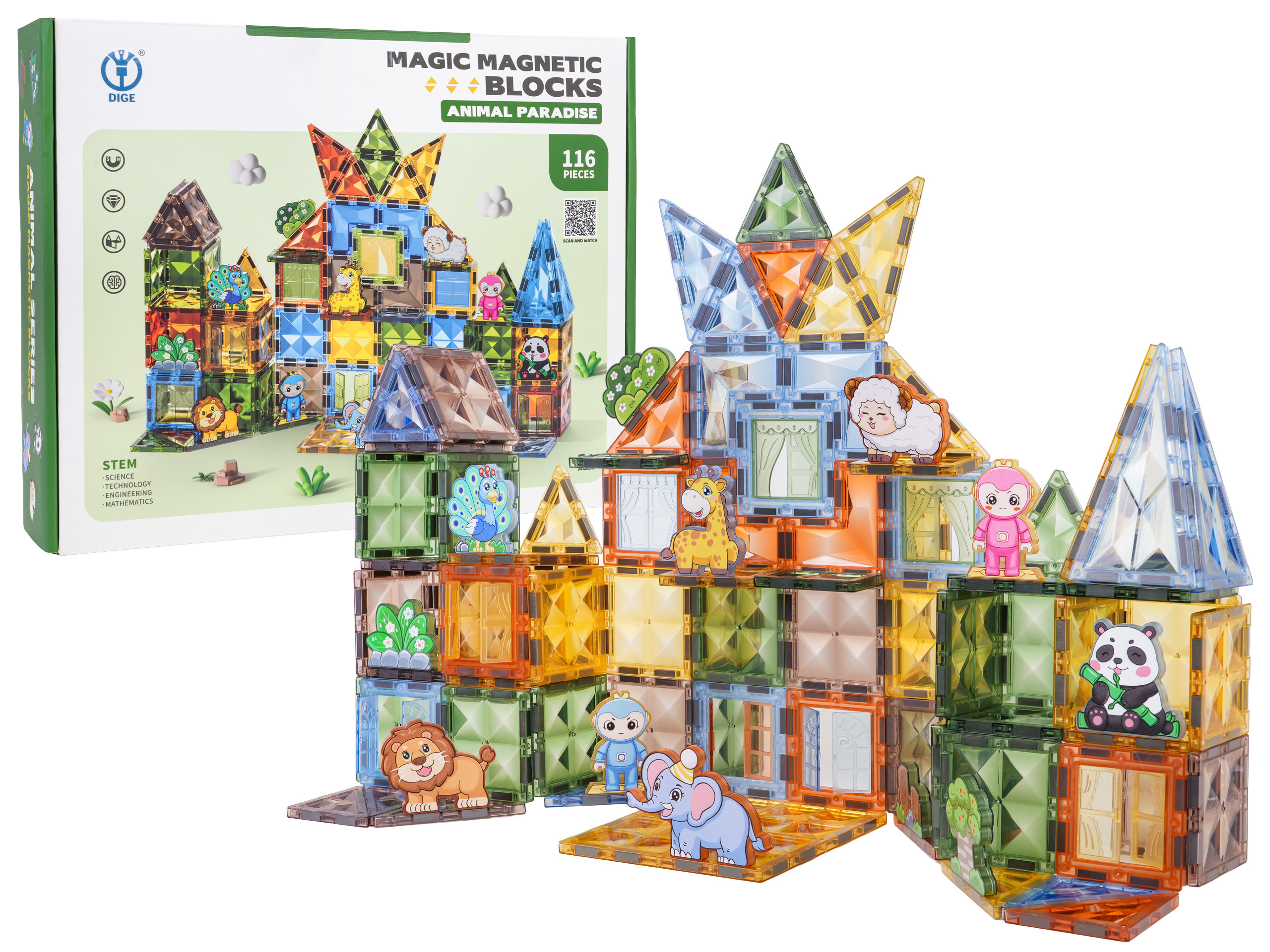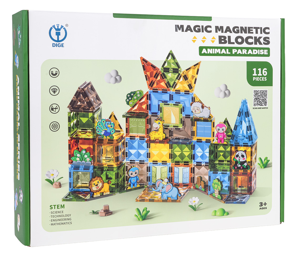 | Bohatě vybavená sada magnetických kostek se zvířátky pro děti od tří let. Sada se skládá z magnetických kostek, konstrukčních prvků a postaviček se zvířátky (lev, slon, panda, ovečka, páv). Kostky byly vyrobeny z nejkvalitnějších materiálů, pevně drží, jsou barevné a figurky s postavami navíc dodávají celému setu na půvabu. Skládání kostek pozitivně ovlivňuje rozvoj kreativity, učí trpělivosti a soustředění.