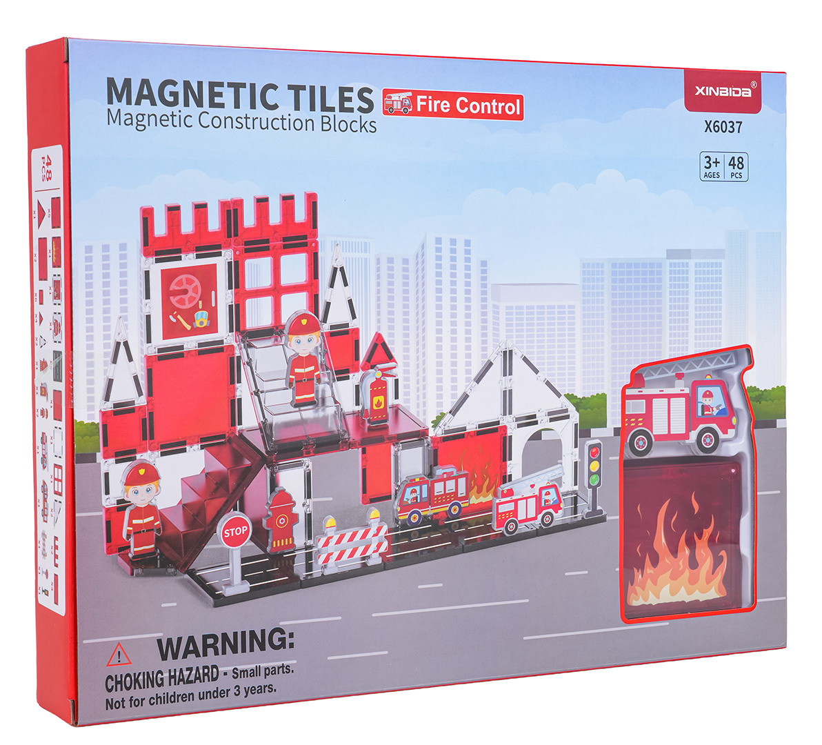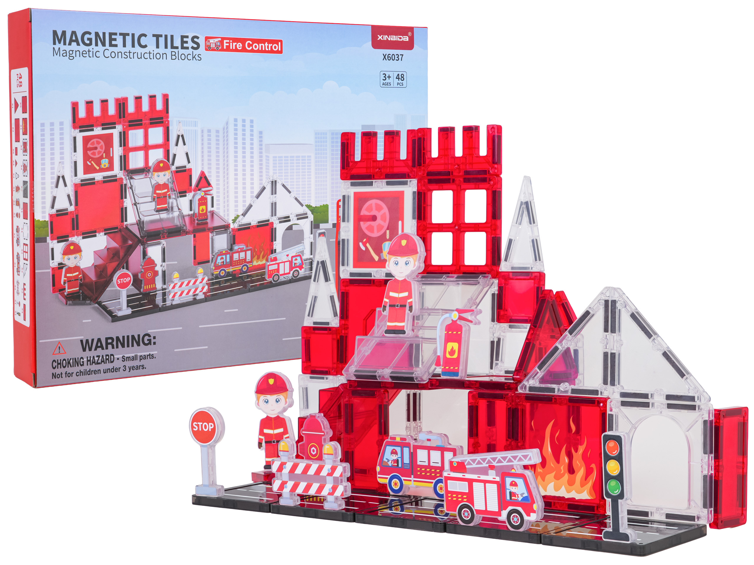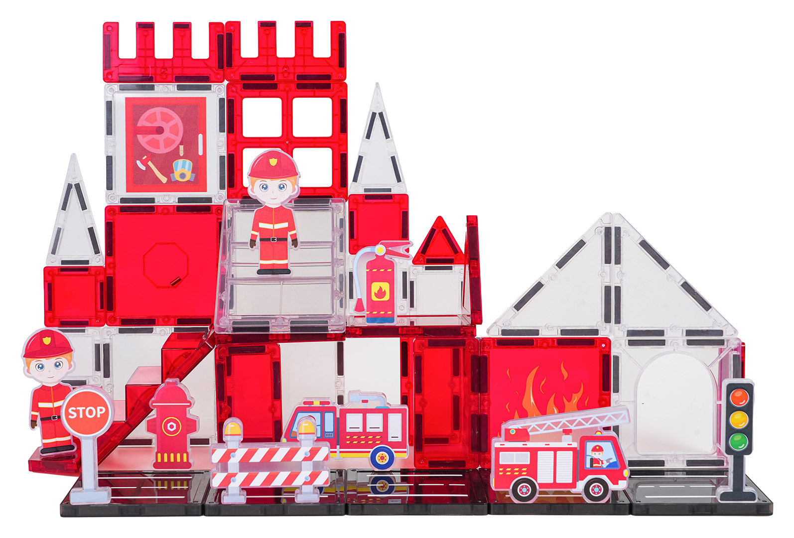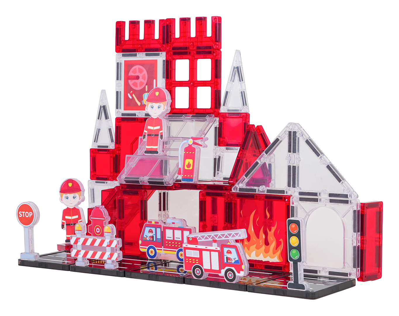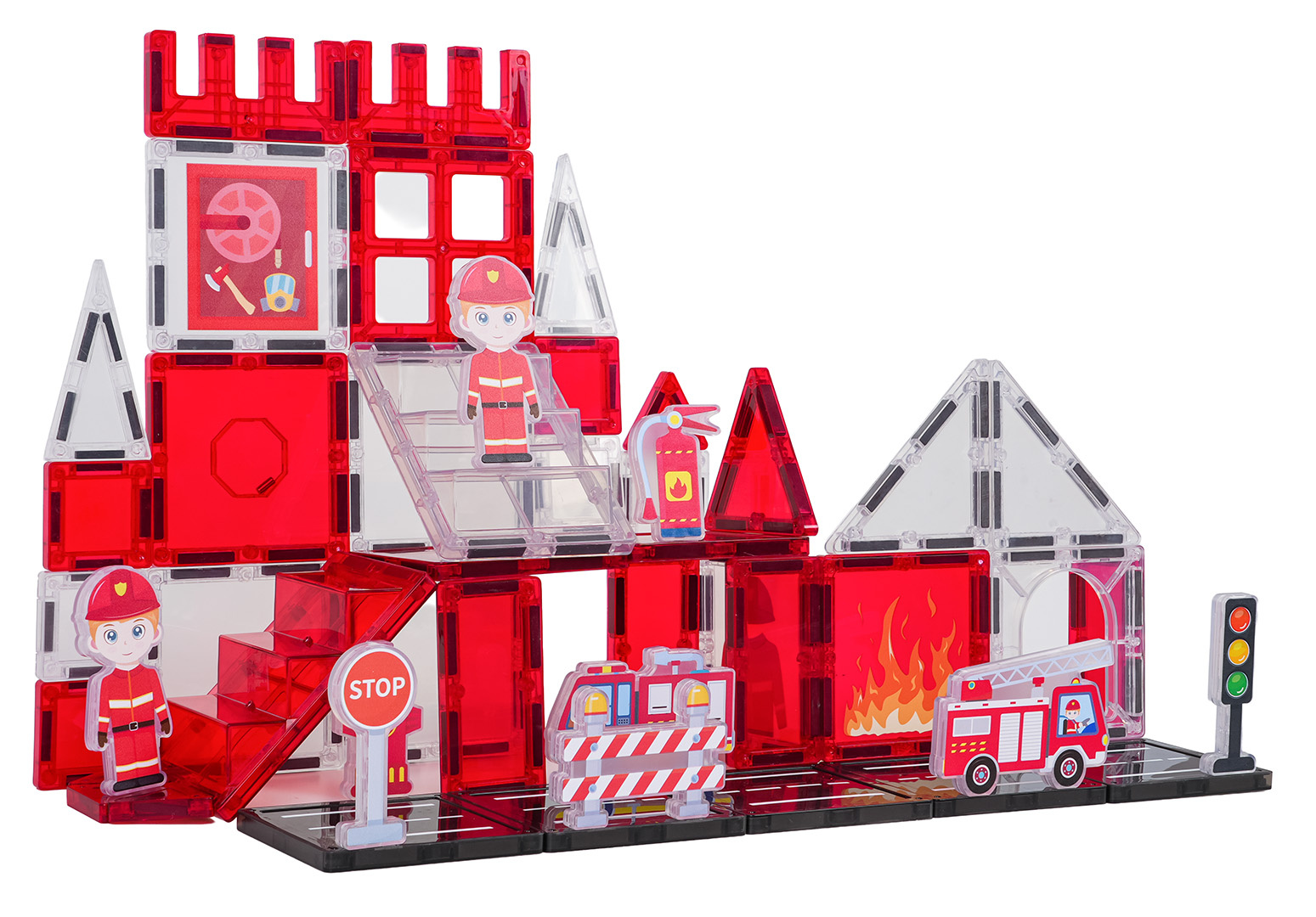 Sada magnetických kostek pro stavbu hasičské stanice pro děti od tří let. Sada se skládá z 48 prvků, magnetických kostek, postaviček hasičů, vozidel a hasičských rekvizit a značek. Magnetické kostky jsou vyrobeny z odolného plastu. Spojují se pomocí neodymových magnetů. Skládání kostek pozitivně ovlivňuje rozvoj kreativity, učí trpělivosti a soustředění.