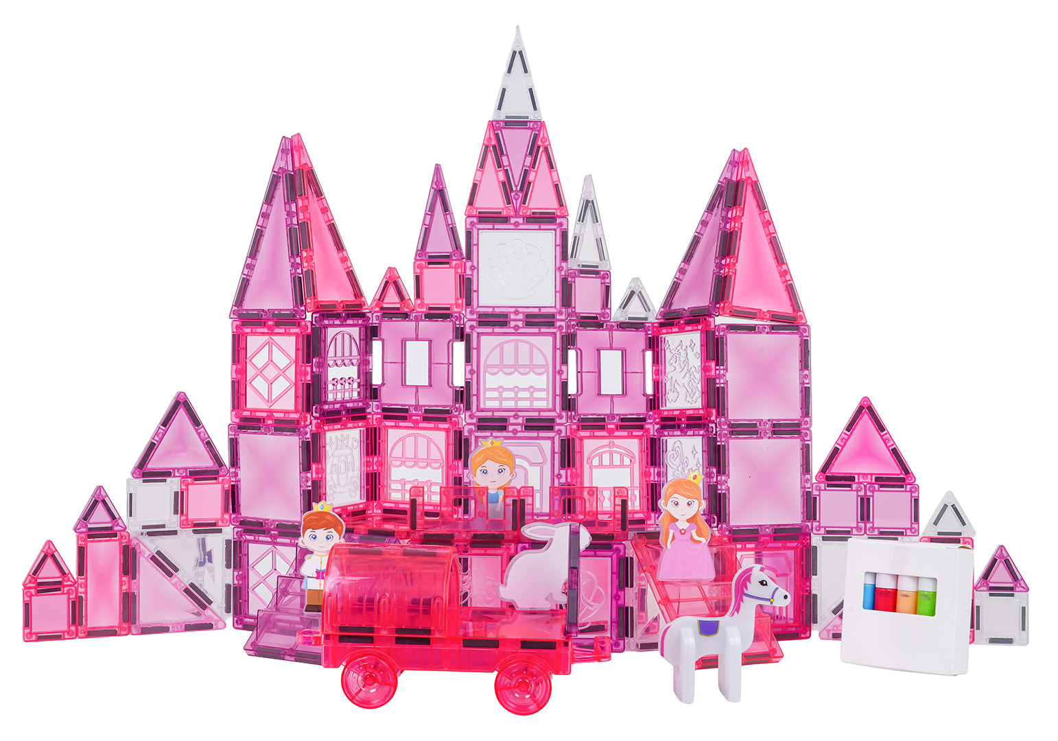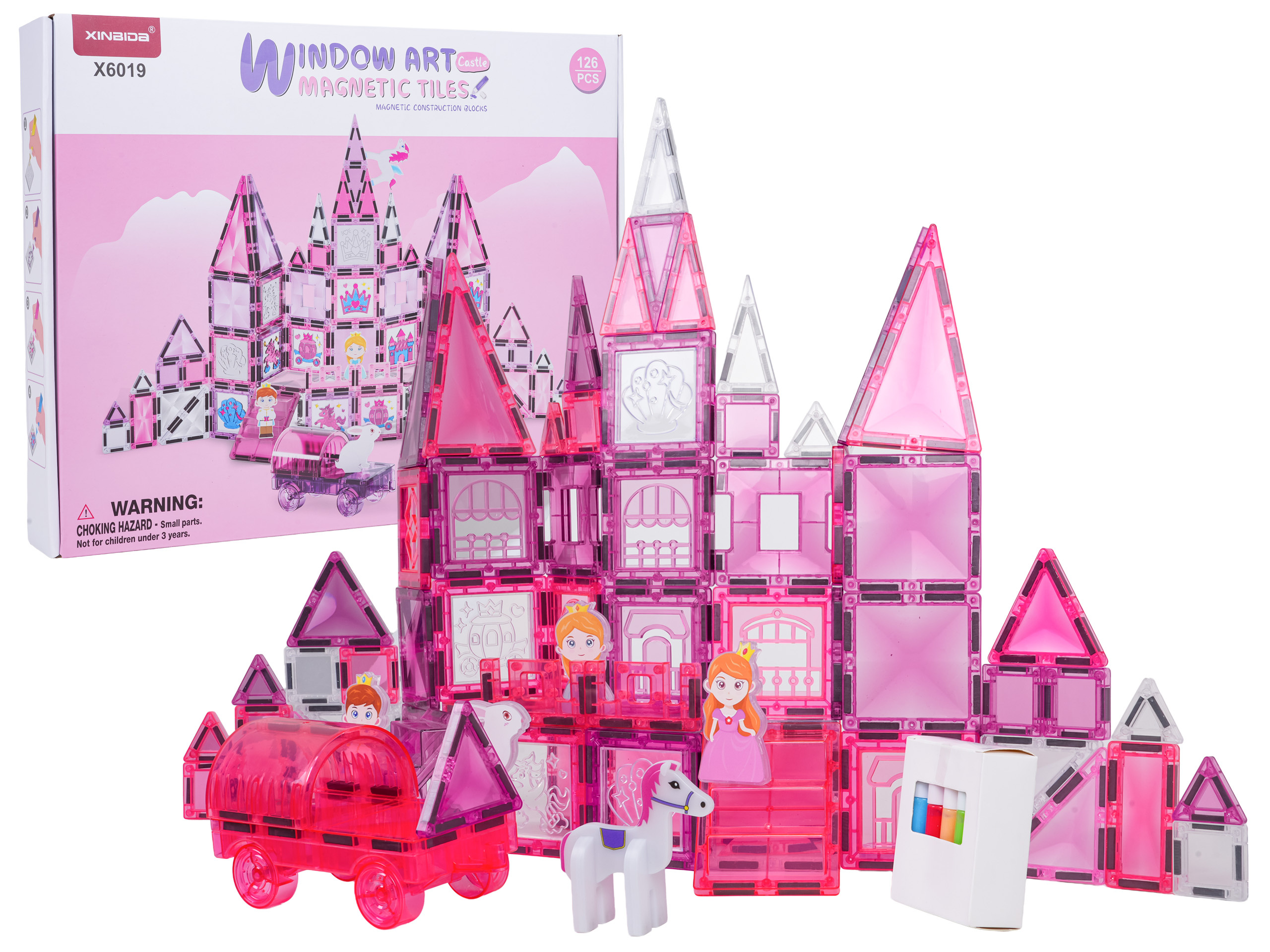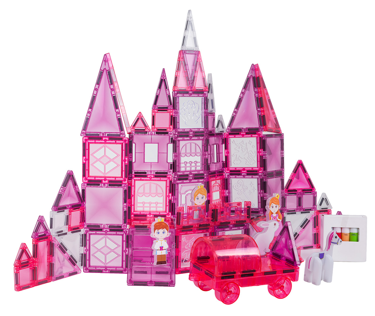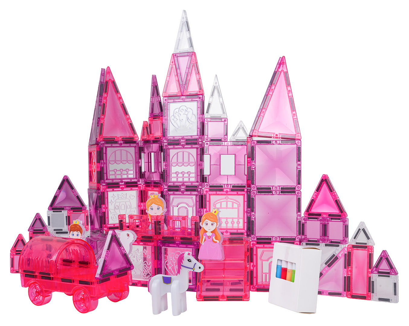 | Sada magnetických kostek s prvky na malování pro děti od tří let. Sada se skládá ze 126 prvků, magnetických kostek, postaviček s princeznami a koníky, podvozku s kolečky a magnetických prvků k malování a fixů. Magnetické kostky jsou vyrobeny z odolného plastu. Spojují se pomocí neodymových magnetů. Můžeme je spojovat v různých konfiguracích a pod různými úhly, vytvářejíc 3D konstrukce. Skládání kostek pozitivně ovlivňuje rozvoj kreativity, učí trpělivosti a soustředění.