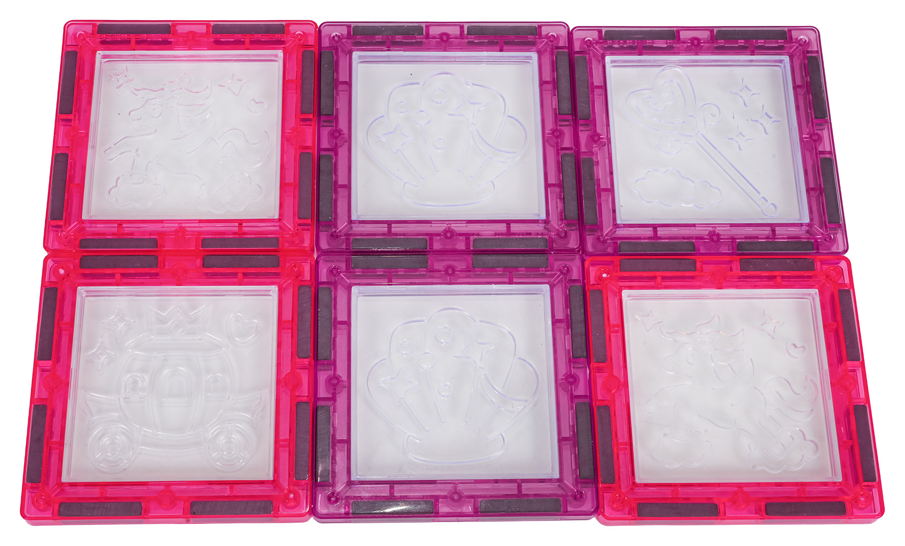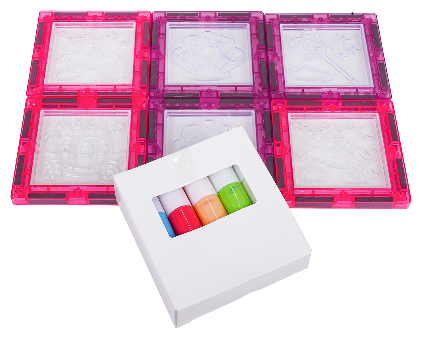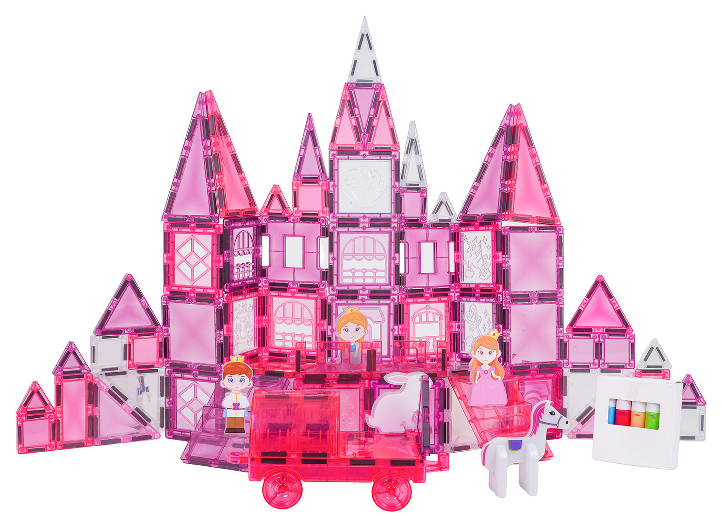 | Sada magnetických kostek s prvky na malování pro děti od tří let. Sada se skládá ze 126 prvků, magnetických kostek, postaviček s princeznami a koníky, podvozku s kolečky a magnetických prvků k malování a fixů. Magnetické kostky jsou vyrobeny z odolného plastu. Spojují se pomocí neodymových magnetů. Můžeme je spojovat v různých konfiguracích a pod různými úhly, vytvářejíc 3D konstrukce. Skládání kostek pozitivně ovlivňuje rozvoj kreativity, učí trpělivosti a soustředění.