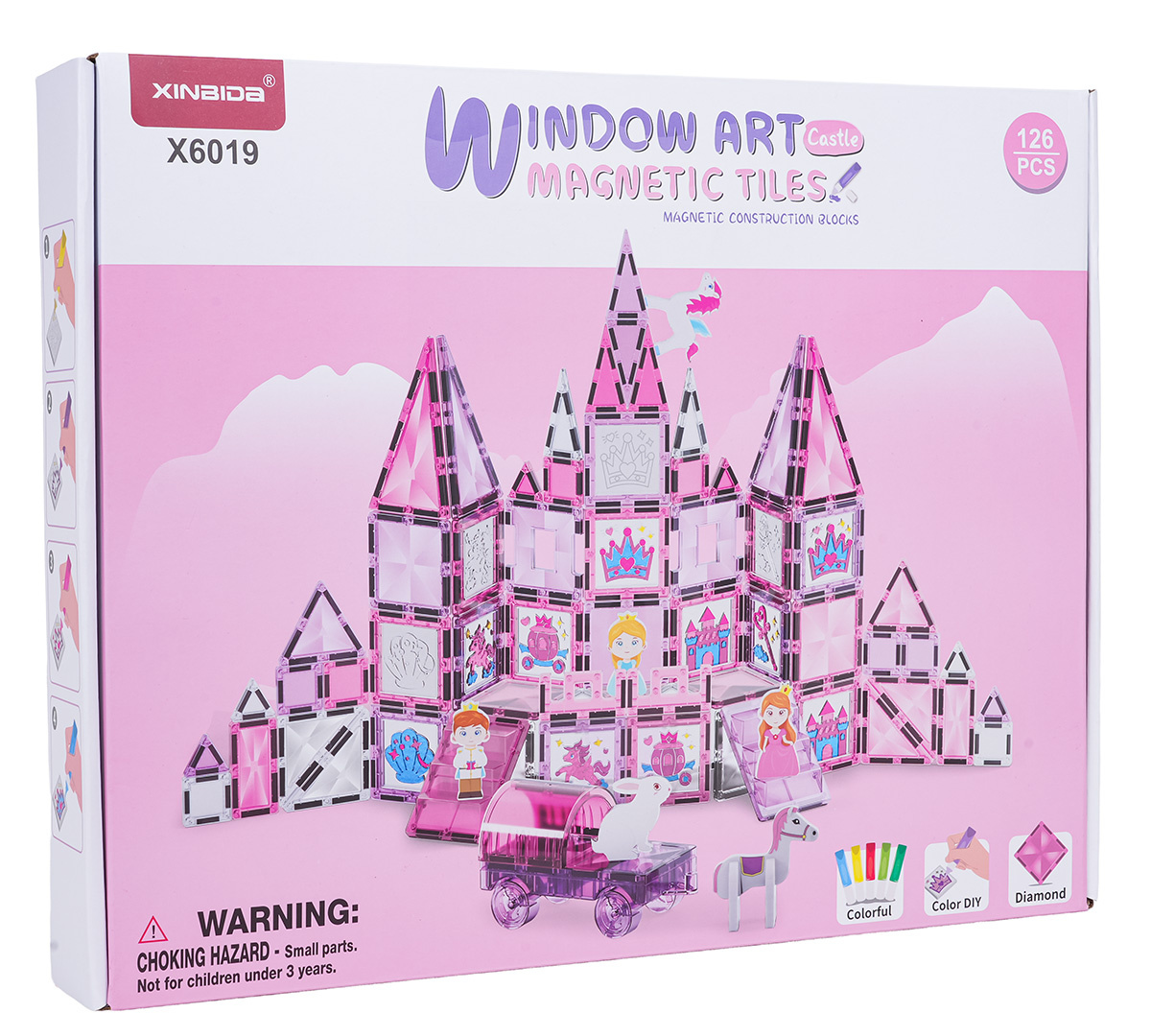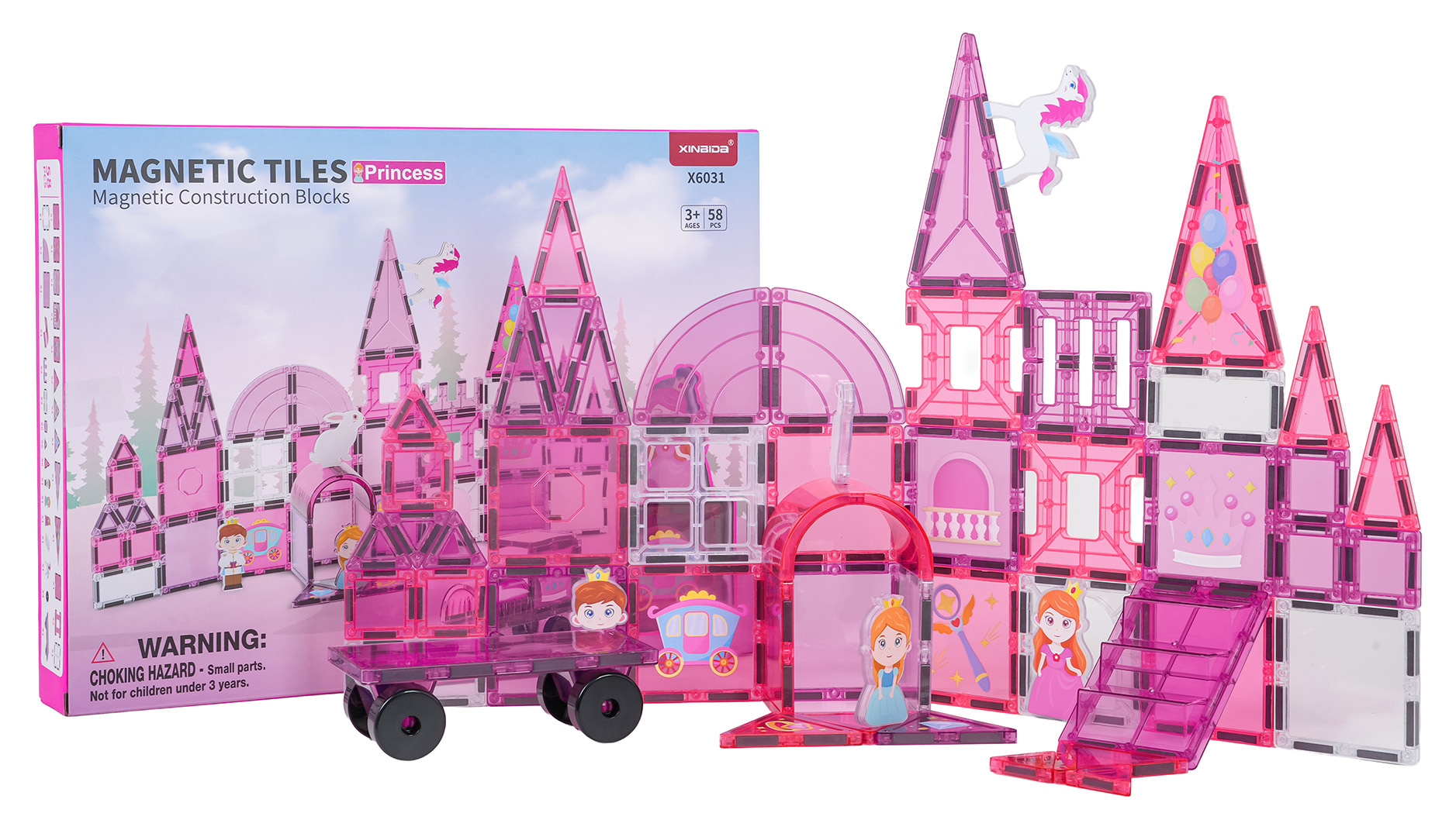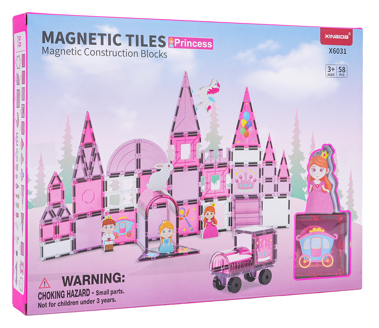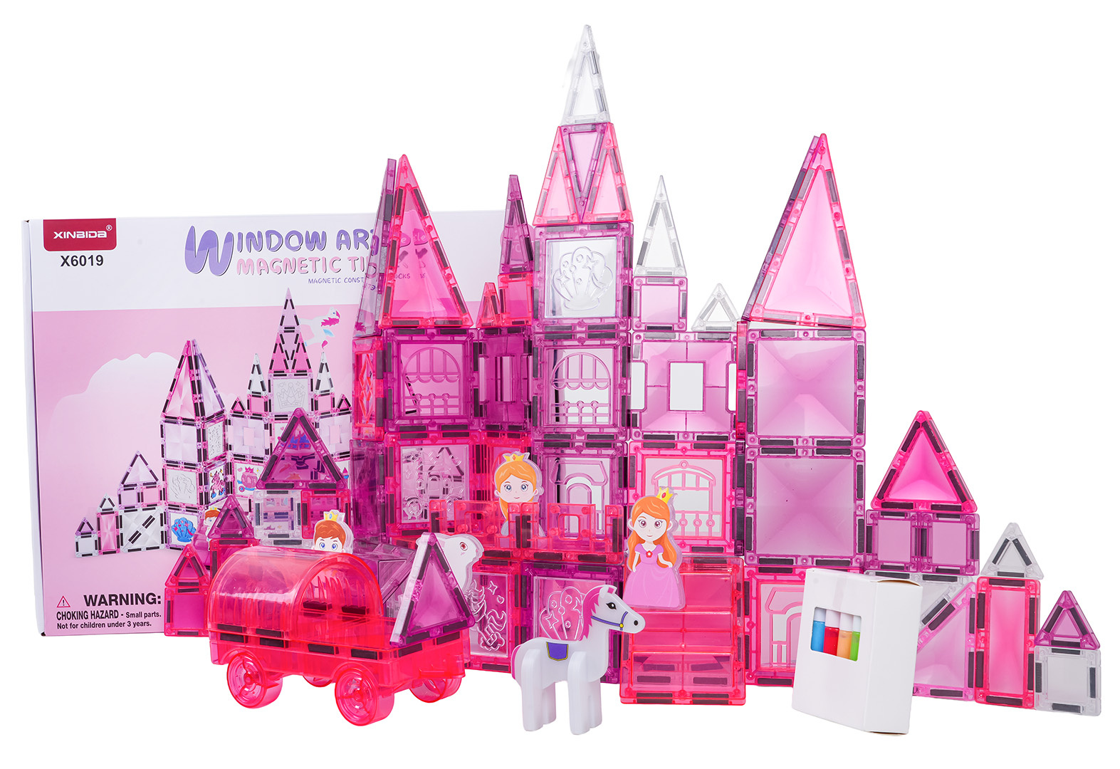 | Sada magnetických kostek s prvky na malování pro děti od tří let. Sada se skládá ze 126 prvků, magnetických kostek, postaviček s princeznami a koníky, podvozku s kolečky a magnetických prvků k malování a fixů. Magnetické kostky jsou vyrobeny z odolného plastu. Spojují se pomocí neodymových magnetů. Můžeme je spojovat v různých konfiguracích a pod různými úhly, vytvářejíc 3D konstrukce. Skládání kostek pozitivně ovlivňuje rozvoj kreativity, učí trpělivosti a soustředění.