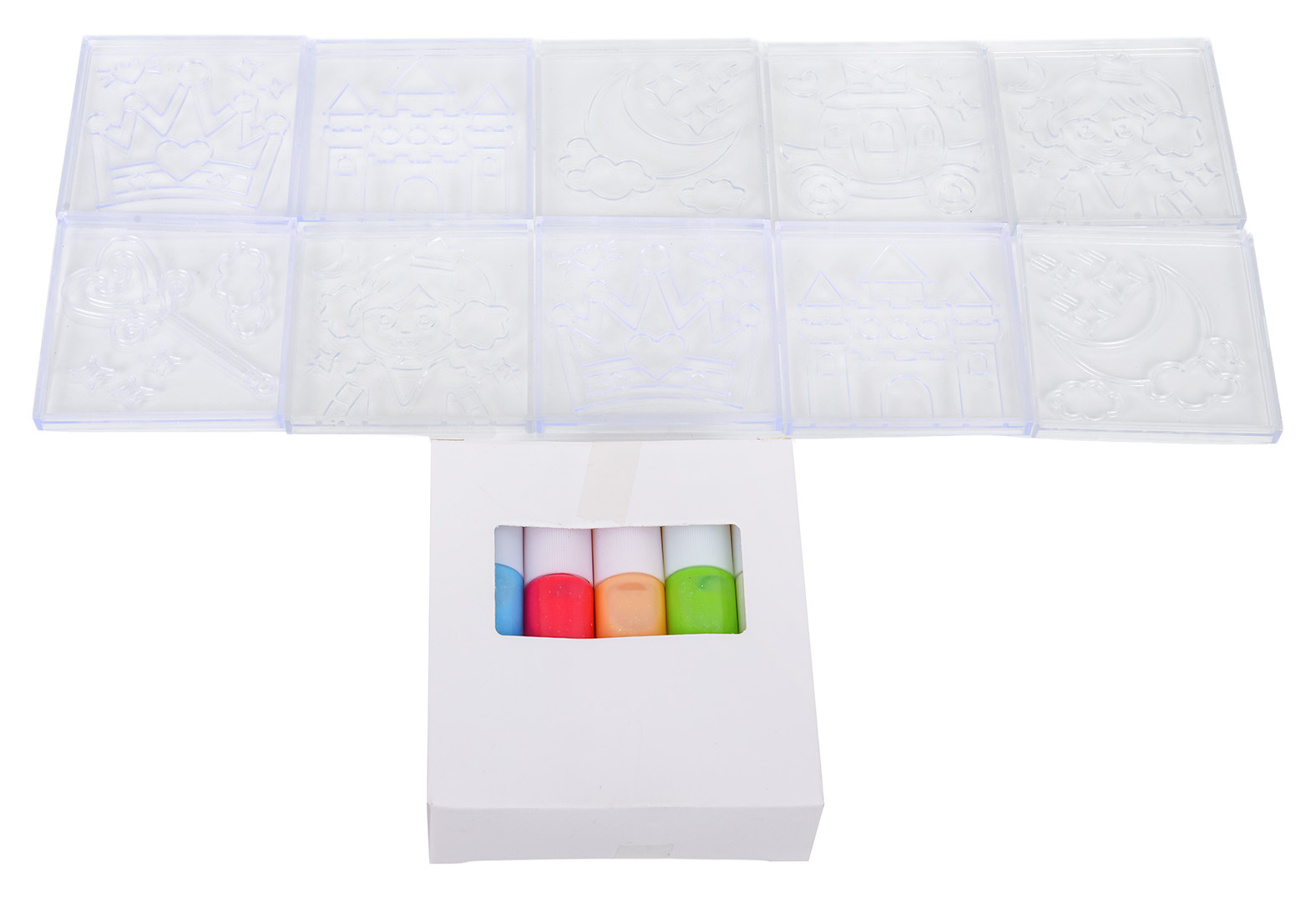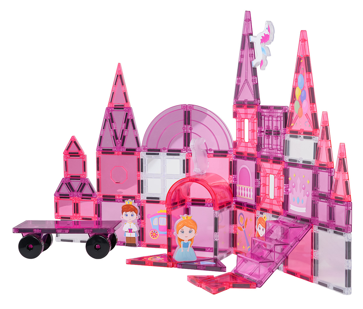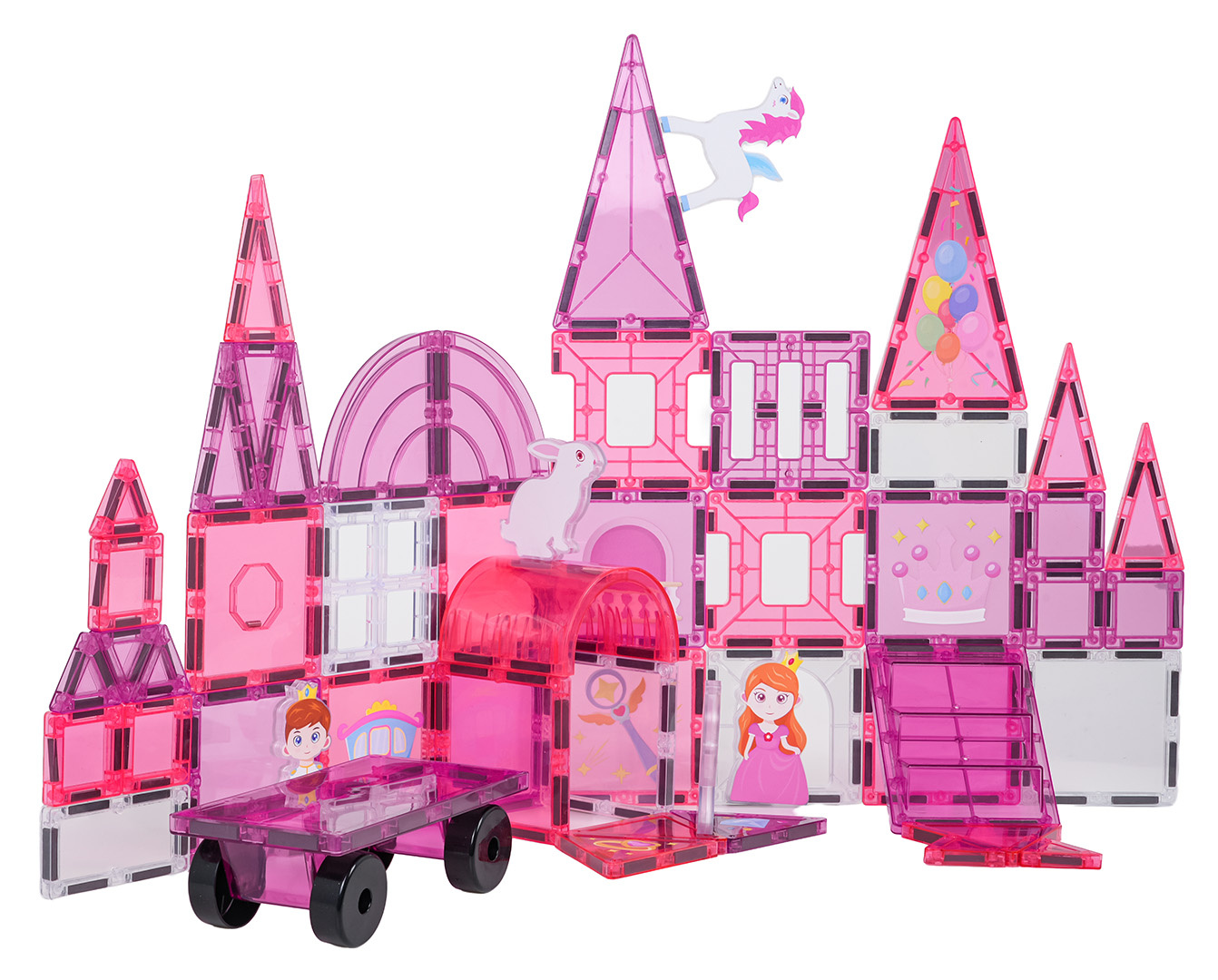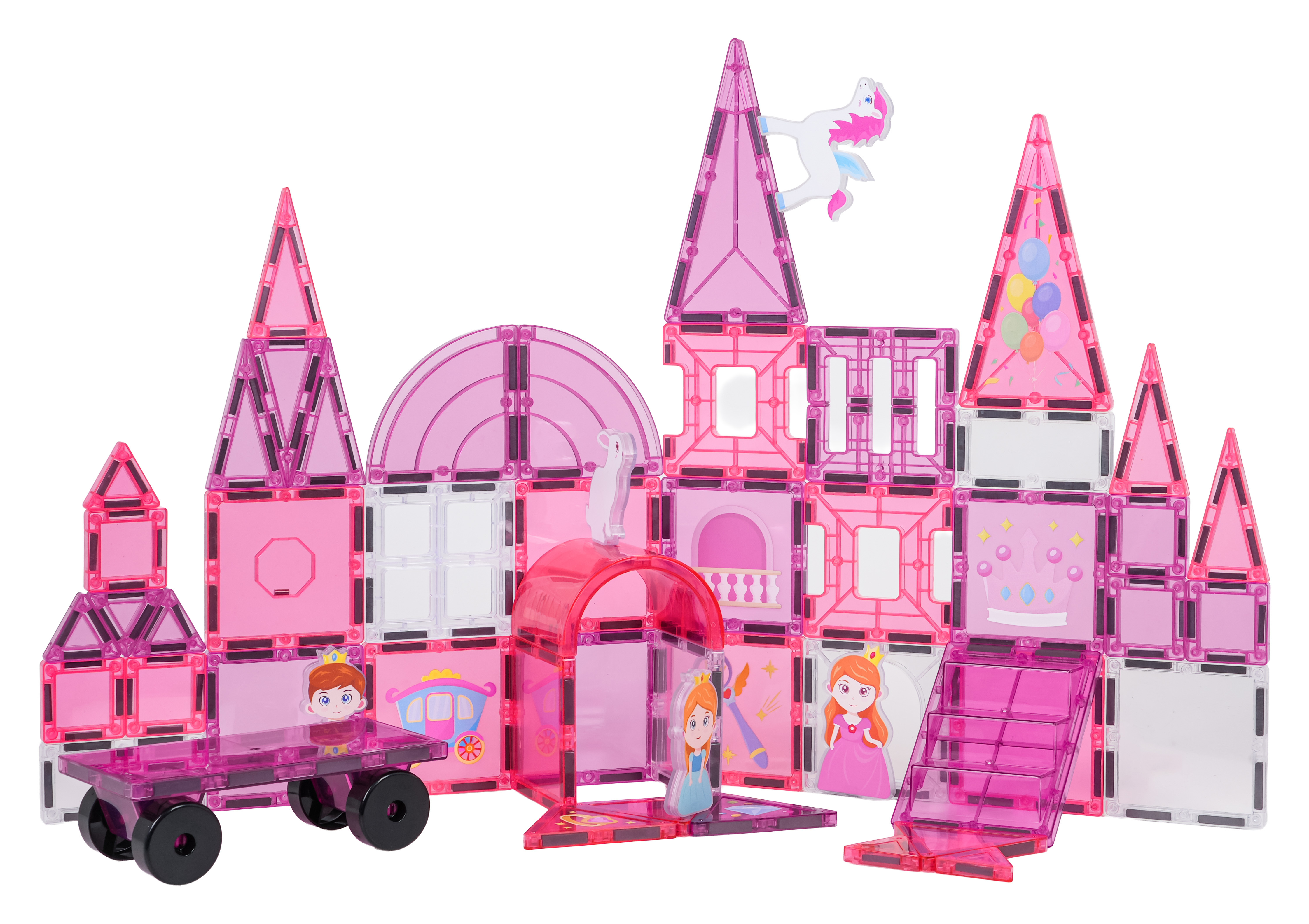 | - magnetické kostky, - figurka princátka, 2 x princezna, jednorožec, koník, zajíček, - podvozek s kolečky, - magnetické prvky k natření, - 10 x gelový fix, - návod k montáži. |