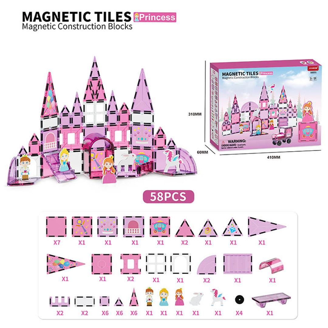 Sada magnetických kostek pro stavbu princeznina hradu, pro děti od tří let. Sada se skládá z 58 prvků, magnetických kostek a magnetických postaviček prince, královen, jednorožce a zajíčka. Magnetické kostky jsou vyrobeny z odolného plastu. Spojují se pomocí neodymových magnetů. Můžeme je spojovat v různých konfiguracích a pod různými úhly, vytvářejíc 3D konstrukce. Skládání kostek pozitivně ovlivňuje rozvoj kreativity, učí trpělivosti a soustředění.