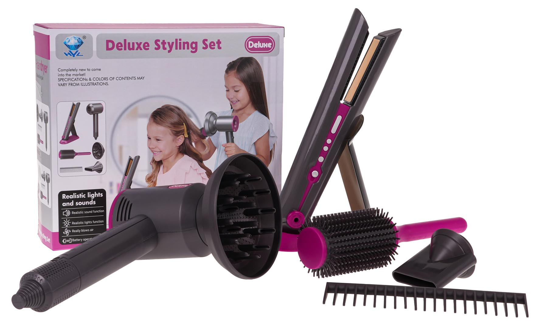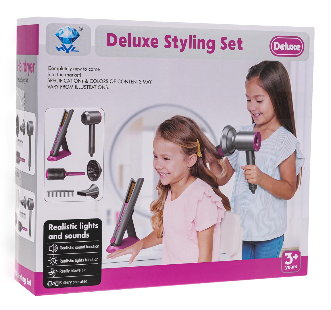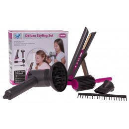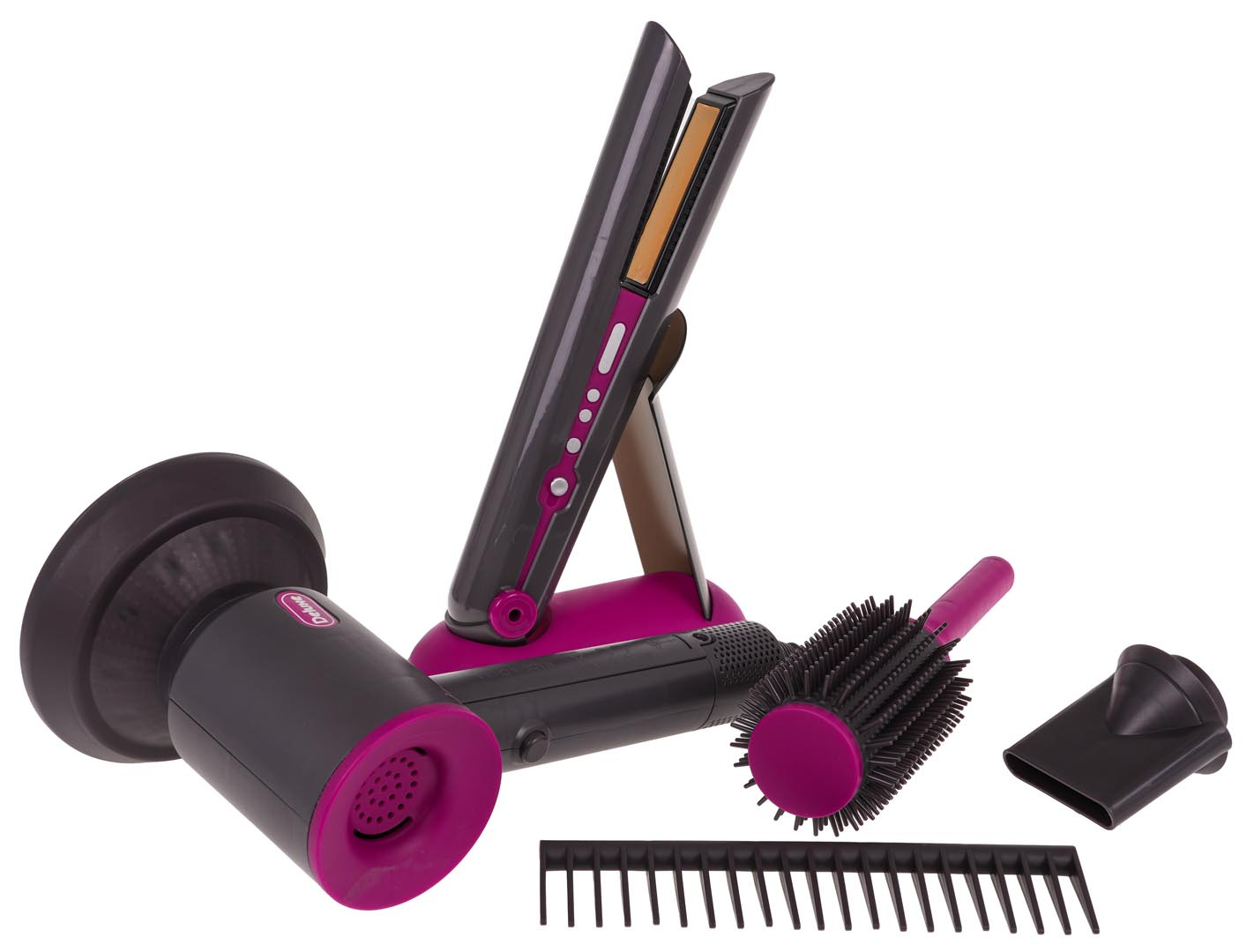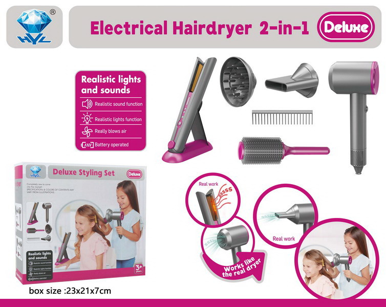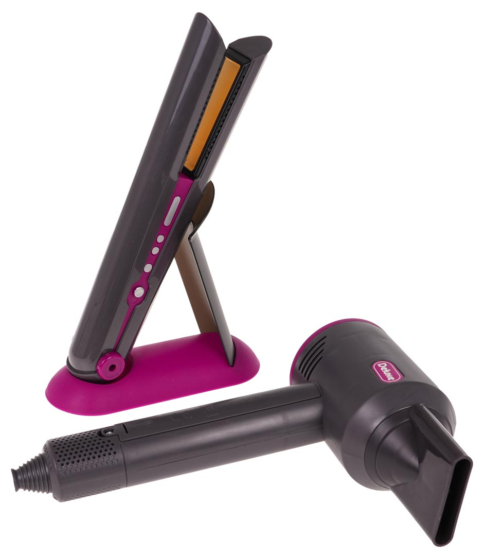 Fén vydává charakteristické zvuky sušení , které napodobují skutečný spotřebič, a také se vyznačuje jemným a bezpečným prouděním vzduchu . Sada obsahuje také žehličku na vlasy se zvukovými efekty a světly na destičkách, které napodobují skutečné zahřívání žehličky.