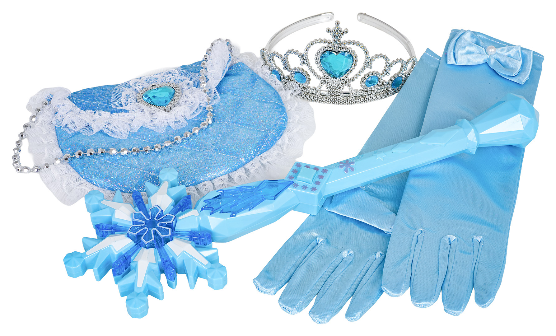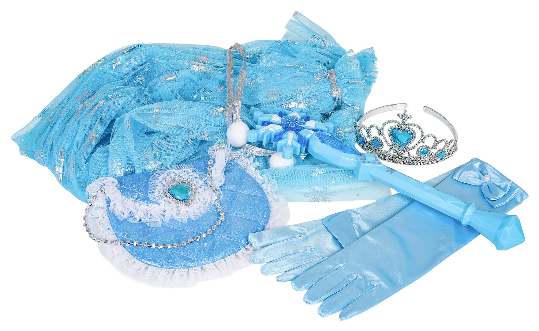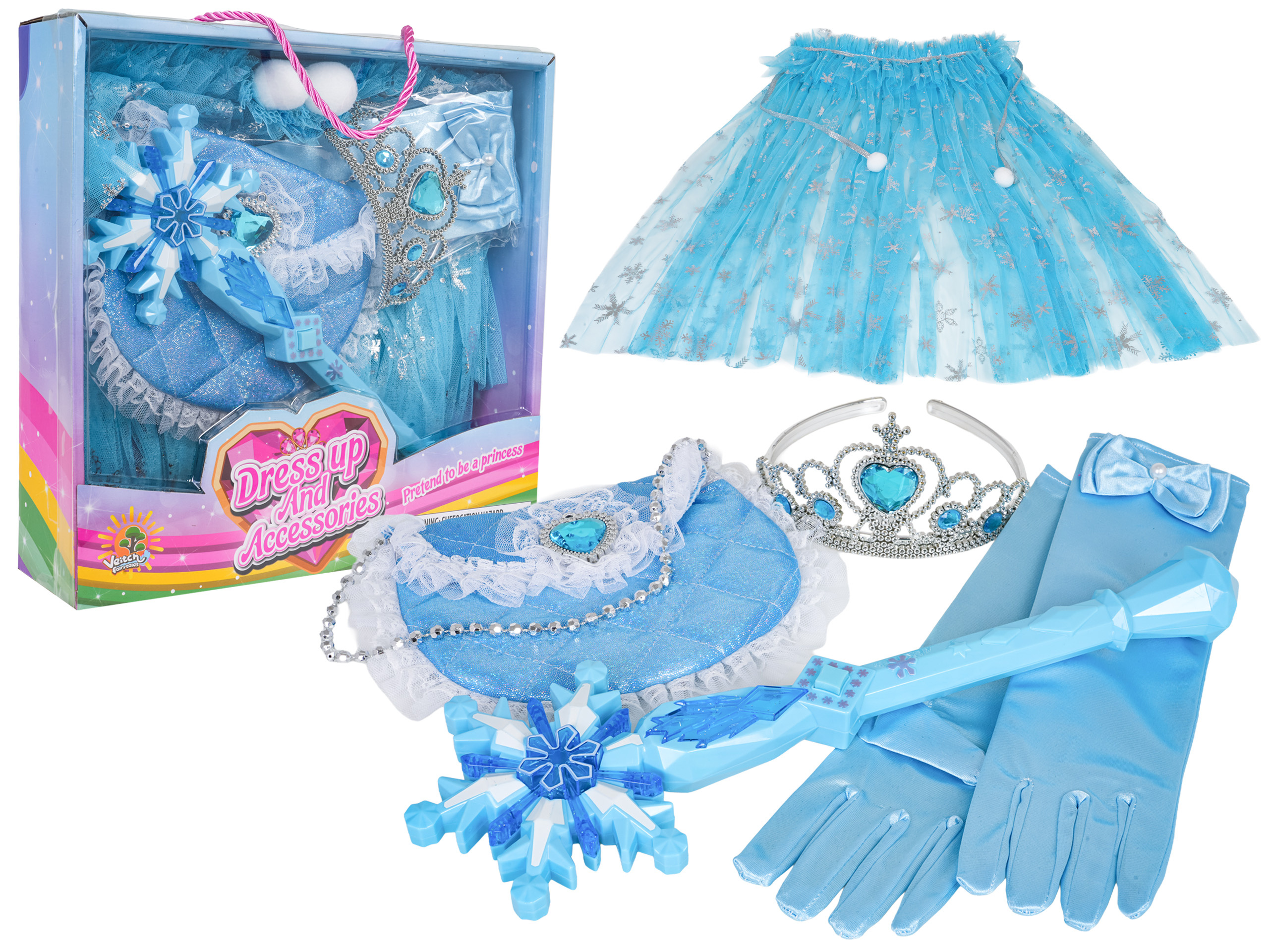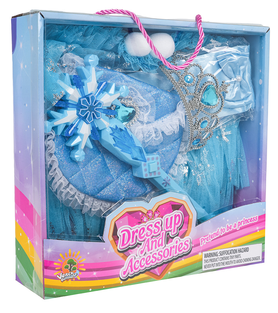 Sada malé princezny pro děti od tří let. Sada byla vyrobena s důrazem na detaily v krásné safírové barvě a ozdobena modrými kameny. Sada obsahuje plášť vyrobený z tylu, rukavice, kabelku, korunu a kouzelnou hůlku se zvukovými a světelnými efekty. Ideální sada na ples, představení nebo pro každodenní zábavu. Magická hůlka je napájena bateriemi typu 2 x AAA 1,5 V (nejsou součástí balení).
