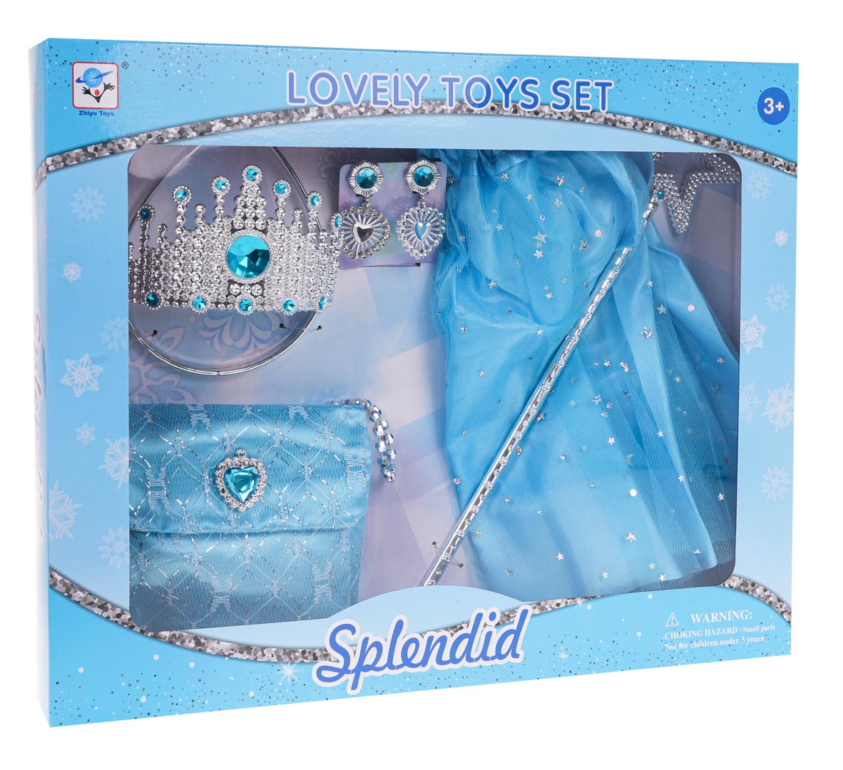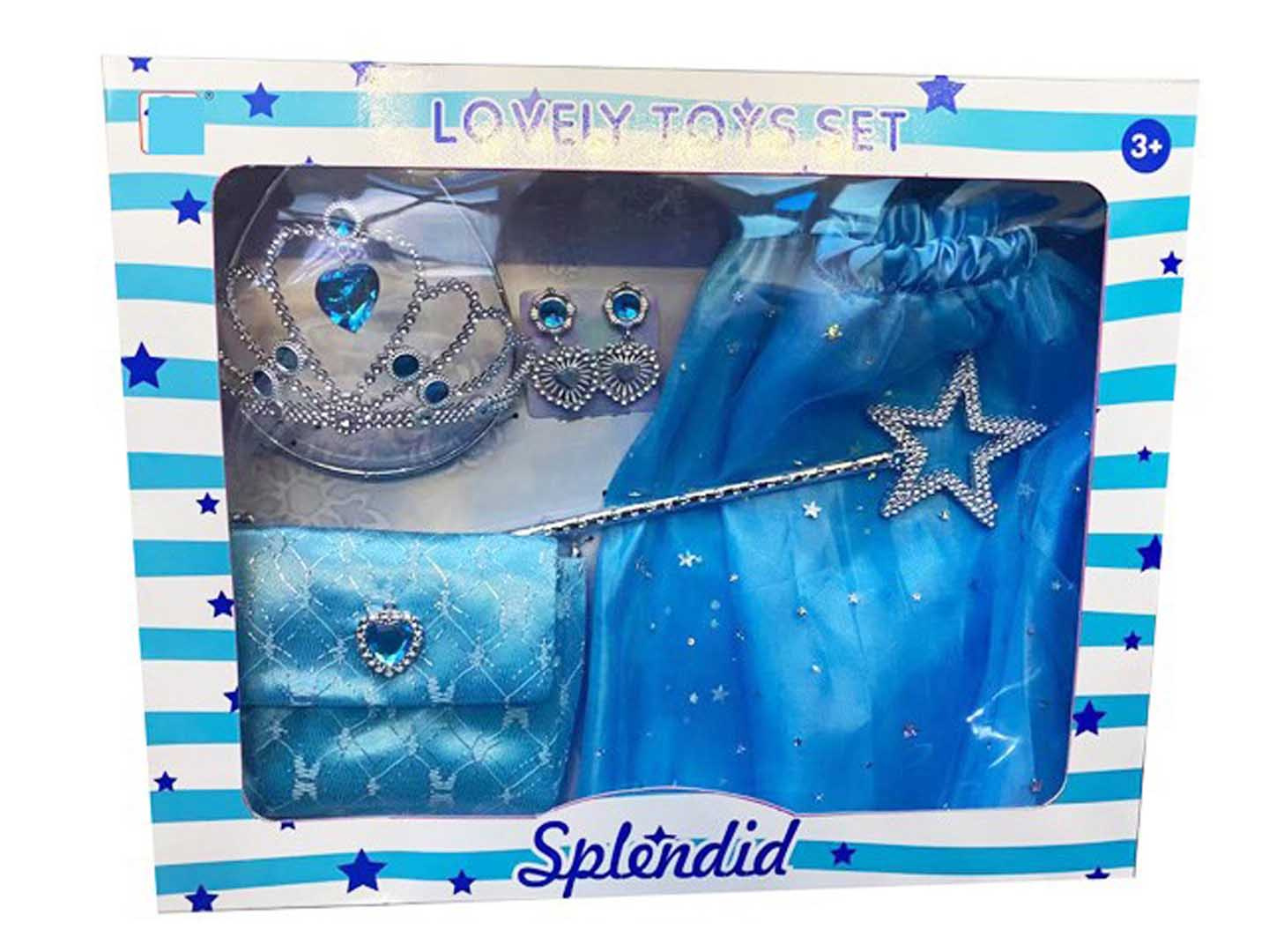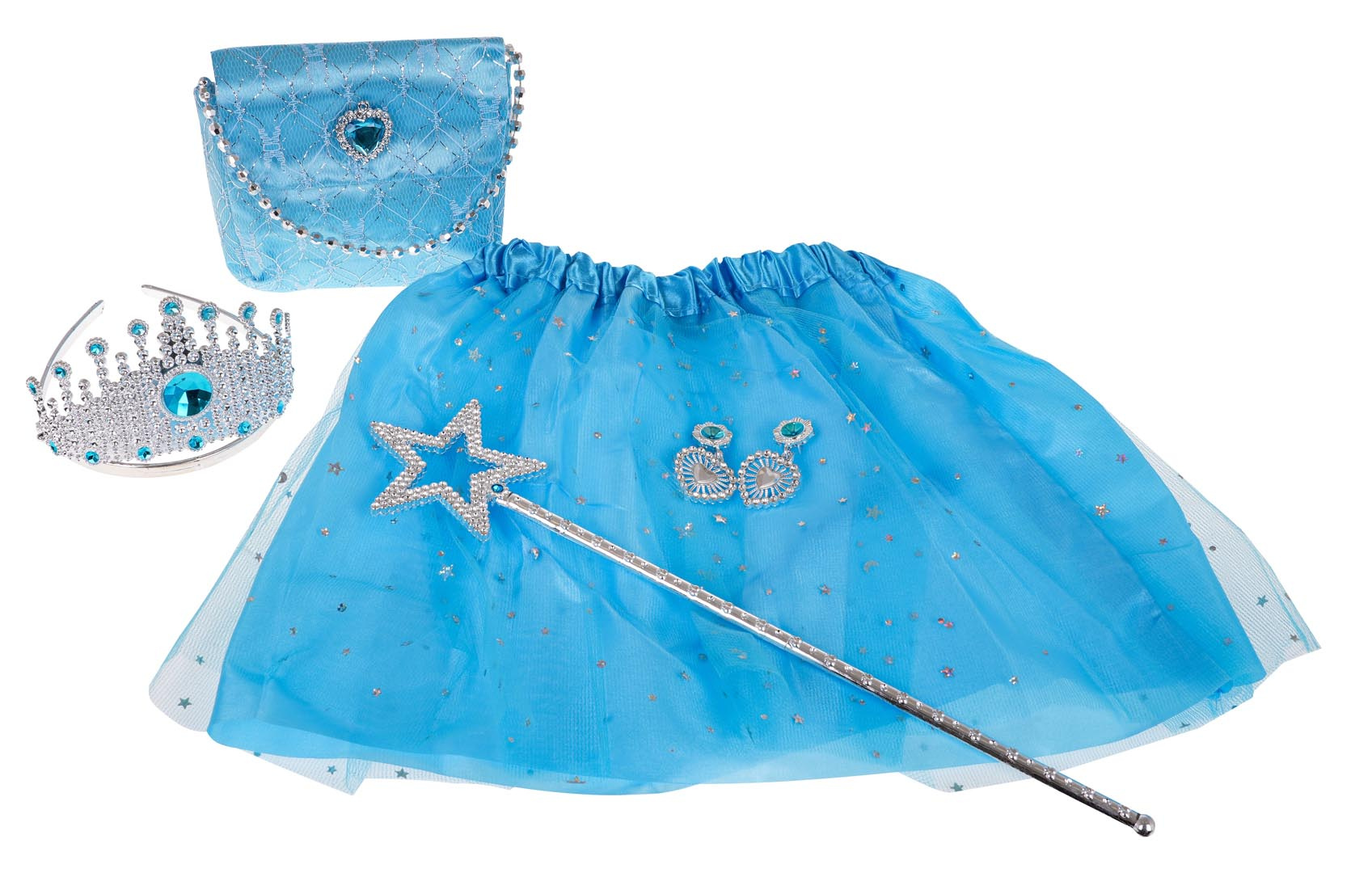 Skvělá sada, oblečení pro malou princeznu od 3 let. Součástí sady je tiára, kouzelná hůlka, náušnice, kabelka a sukýnka. Sada byla vyrobena s důrazem na detaily v krásné modré barvě.