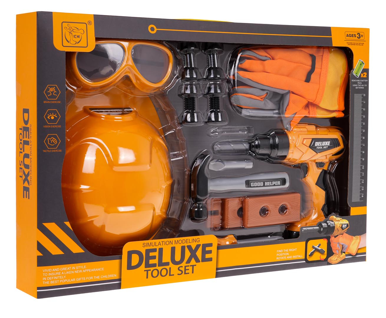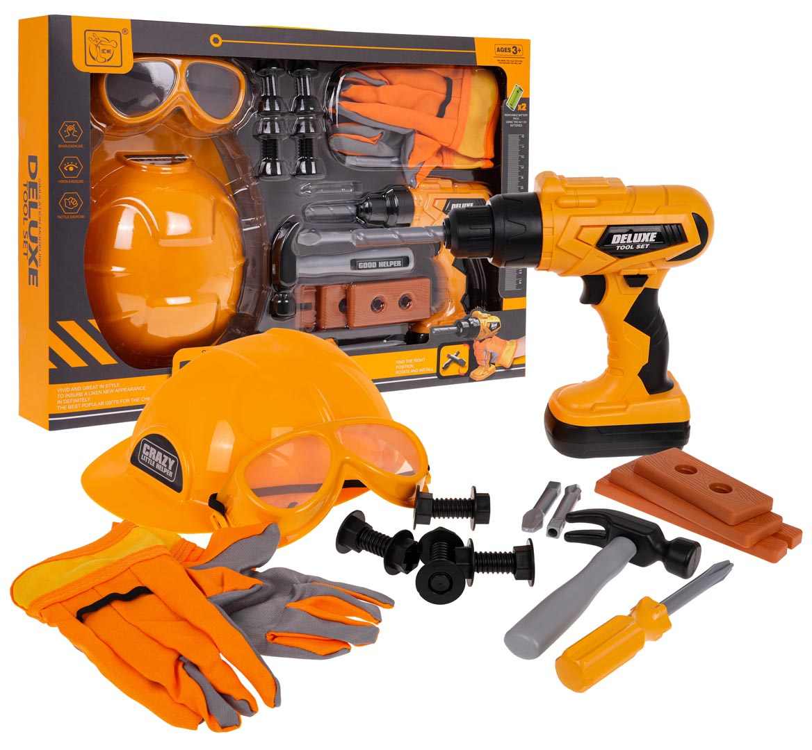 Sada obsahuje i další nástroje, jako je šroubovák, kladivo, dřevo na šroubování a nástavce, které dítěti umožňují provádět různé „opravy“. Sadu doplňují bezpečnostní doplňky, jako je helma a ochranné brýle, které hře dodávají nádech realismu.