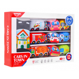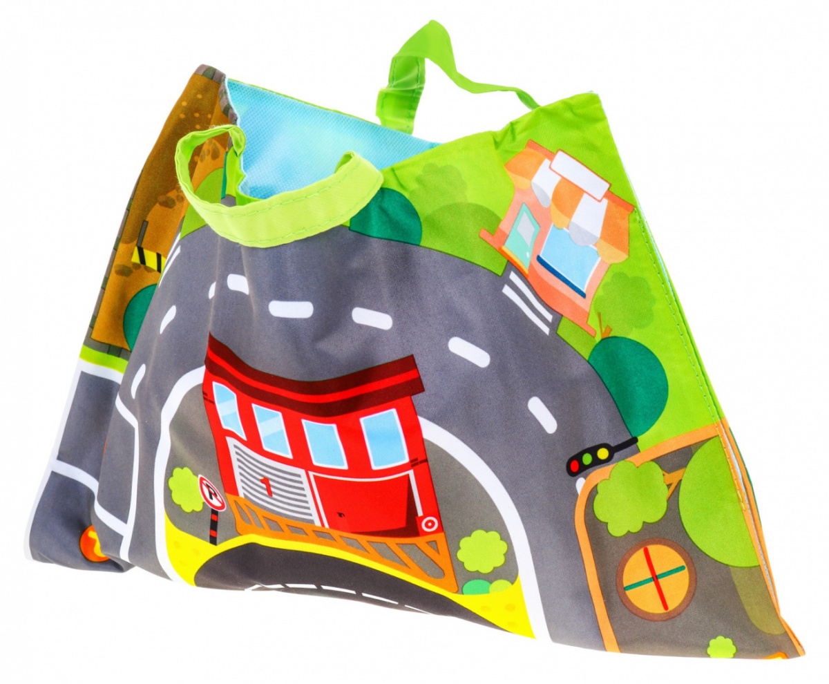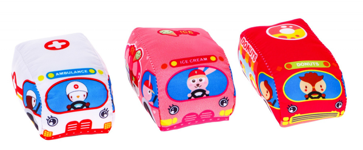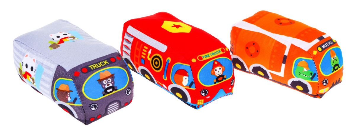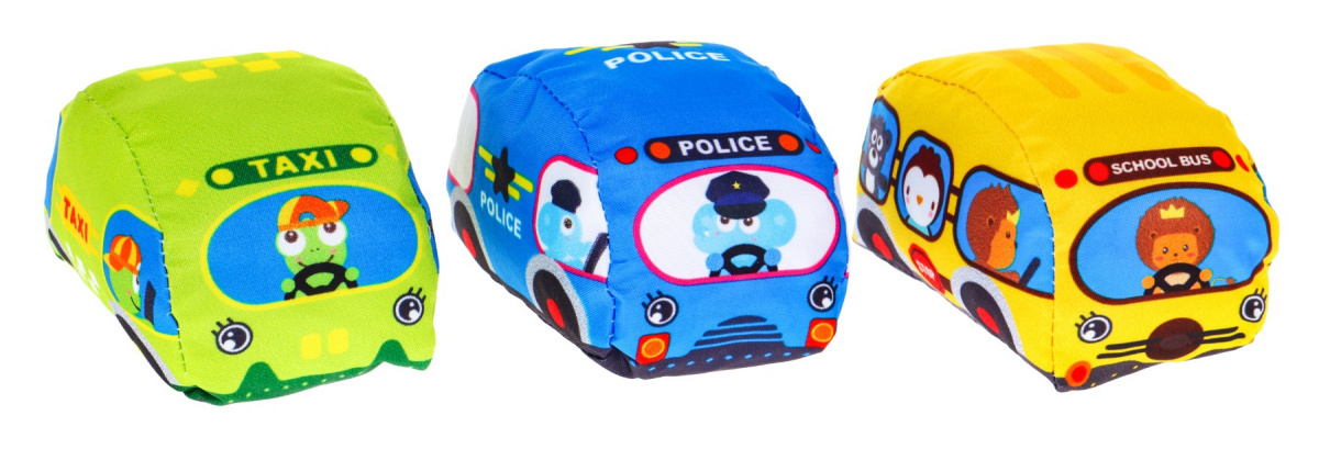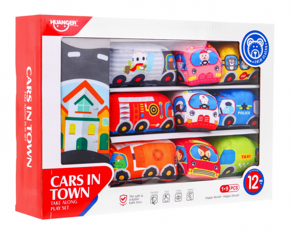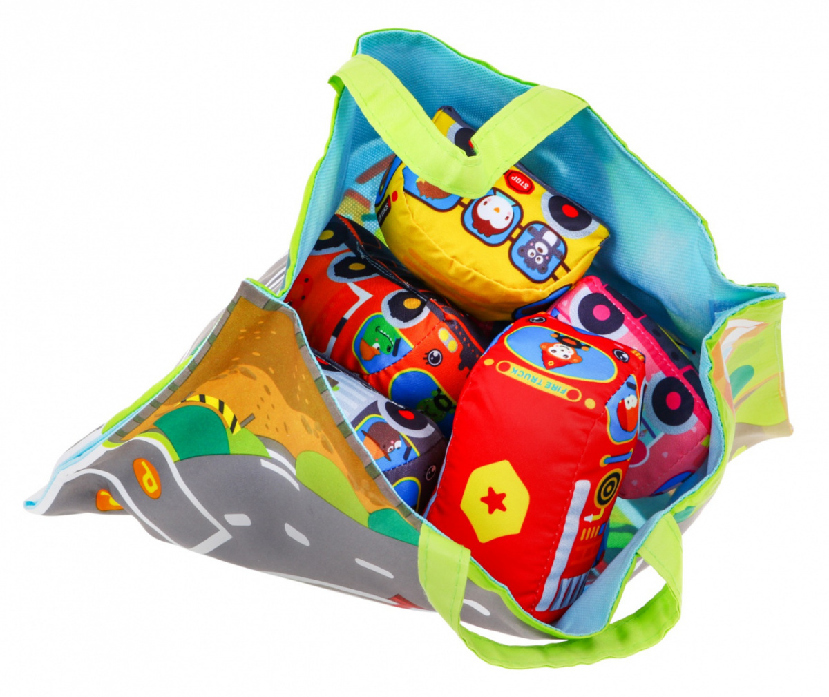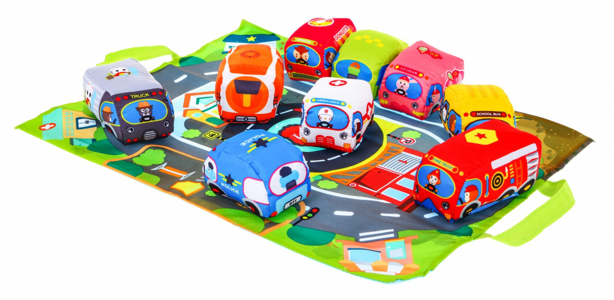 Tato sada je určena pro batolata od 12 měsíců věku. Určitě se bude líbit každému malému fanouškovi autíček. Skládá se z 9 barevných, hmatatelných a bezpečných autíček a barevné měkké podložky s ulicemi a budovami. Tři auta při dotyku zašustí, tři zazvoní a tři zaskřípou. Hračka rozvíjí kreativitu a představivost dítěte. Druhá strana podložky je opatřena suchým zipem, takže ji lze použít jako tašku pro uložení a přenášení autíček. Podložku a auta lze prát v pračce při nízké teplotě a snadno se čistí.
