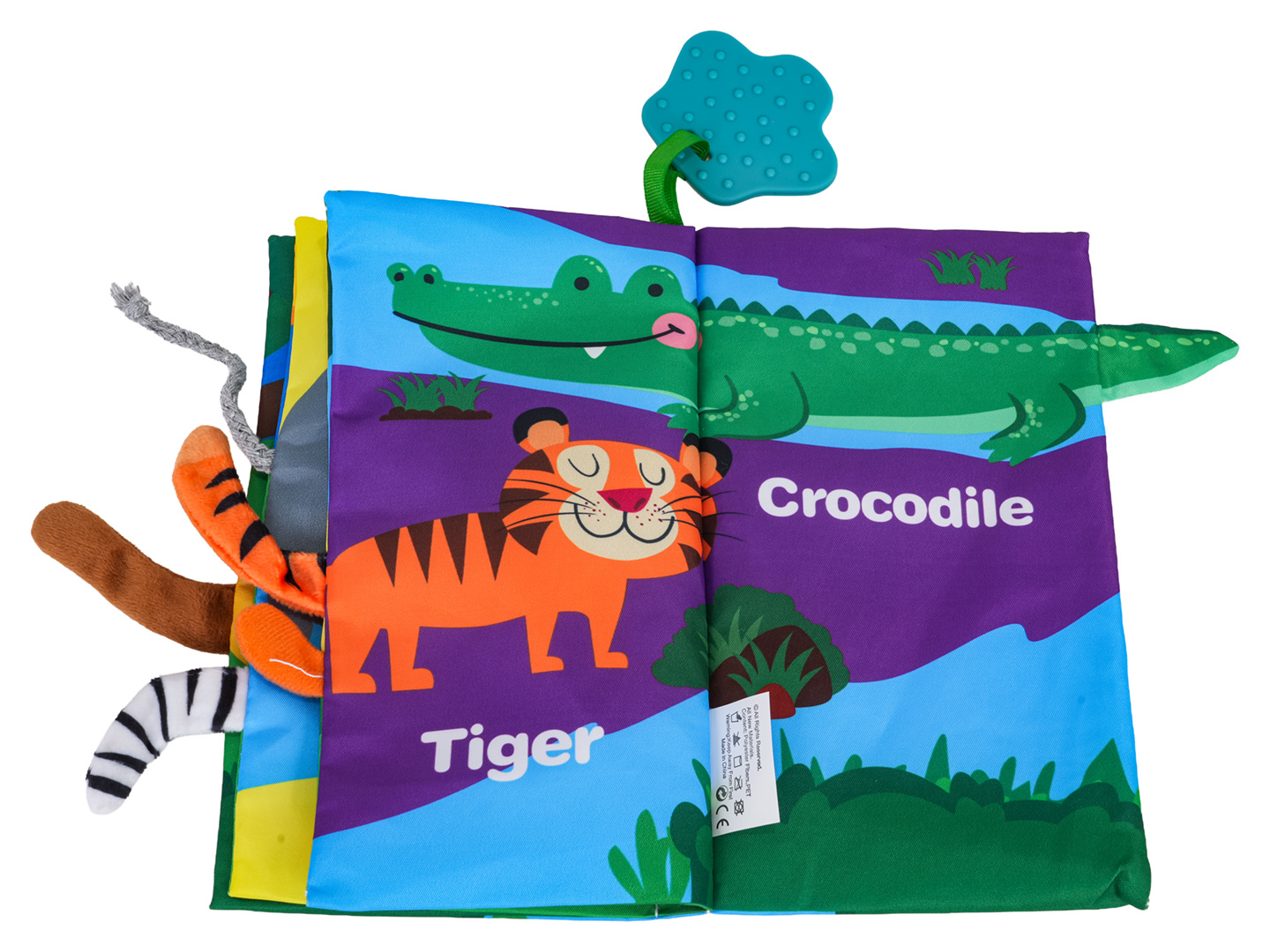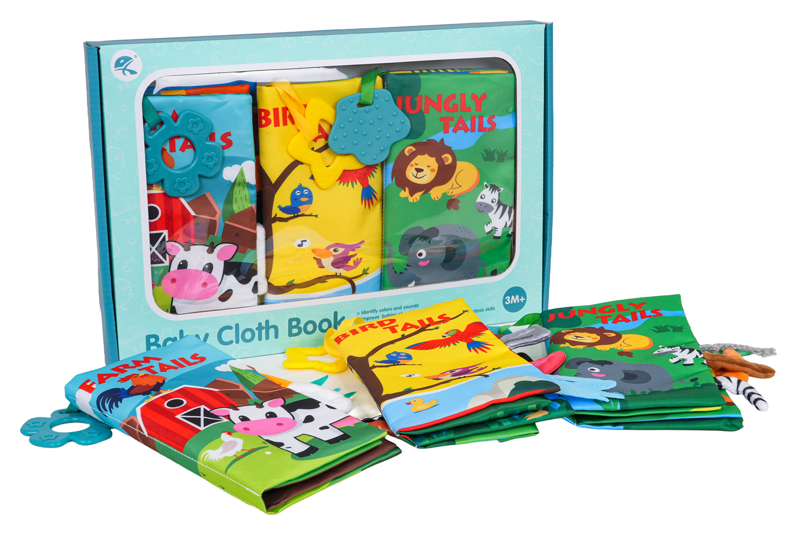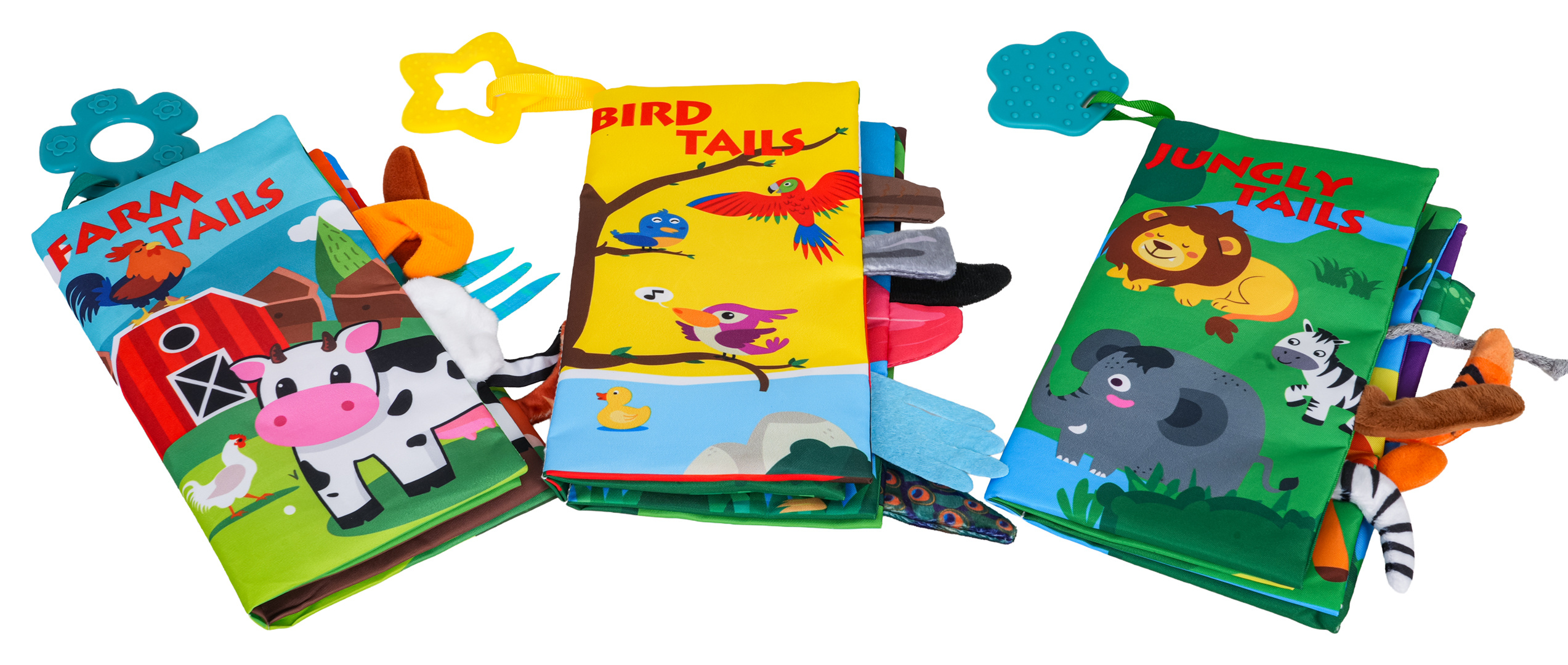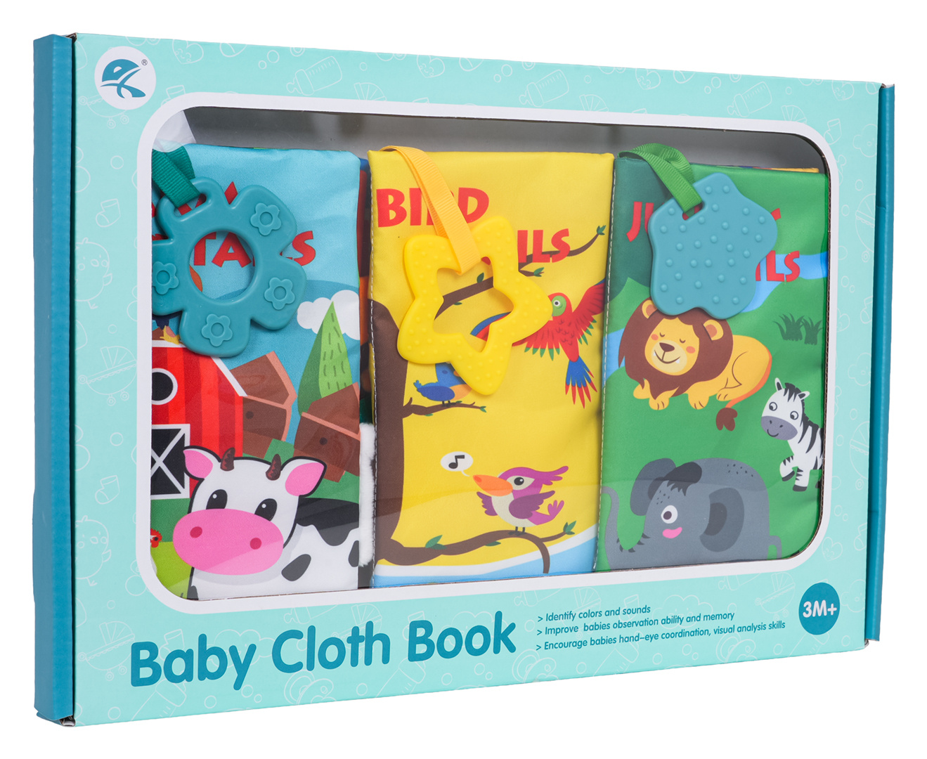 Sada měkkých senzorických knížek pro miminko od třetího měsíce života. Sada byla vyrobena z nejkvalitnějších materiálů bezpečných pro malé děti. Šustící, pískající a na dotek měkké stránky stimulují smysly miminka na mnoha úrovních. Živé barvy přitahují pozornost dítěte a povzbuzují k vzdělávací hře. Na měkkých stránkách se nacházejí obrázky mnoha zvířátek. První knížka představuje zvířátka safari, druhá zvířátka na farmě a třetí různé ptáky. Každé zvířátko je označeno v angličtině. Z každé strany vyčnívají ocásky, navíc ke každé knize je připojen kousátko. Knížečky jsou voděodolné a snadno se čistí.