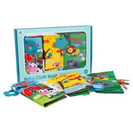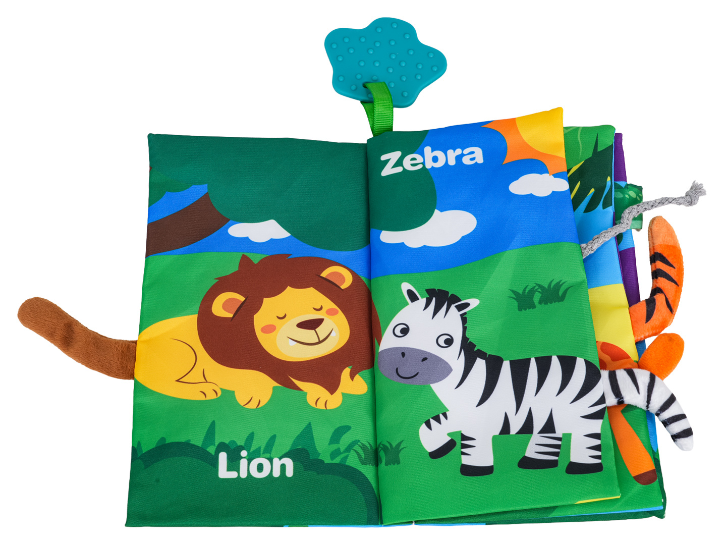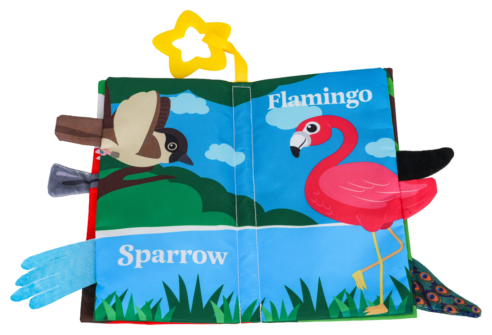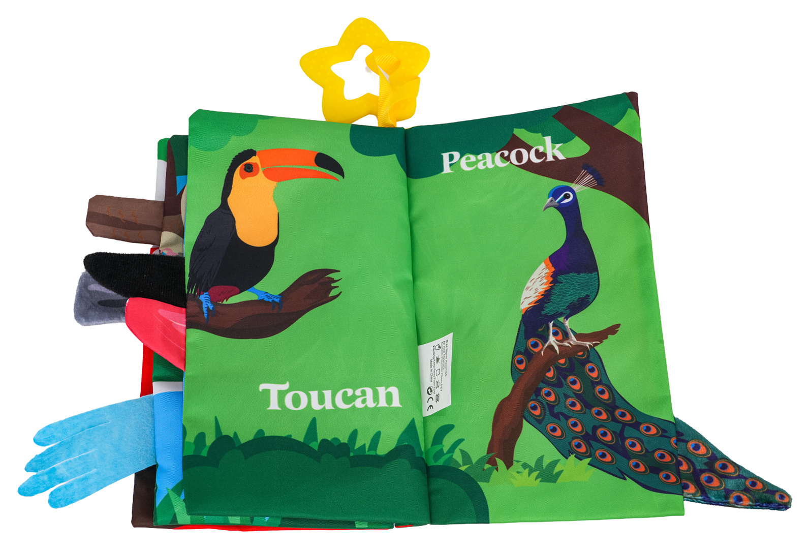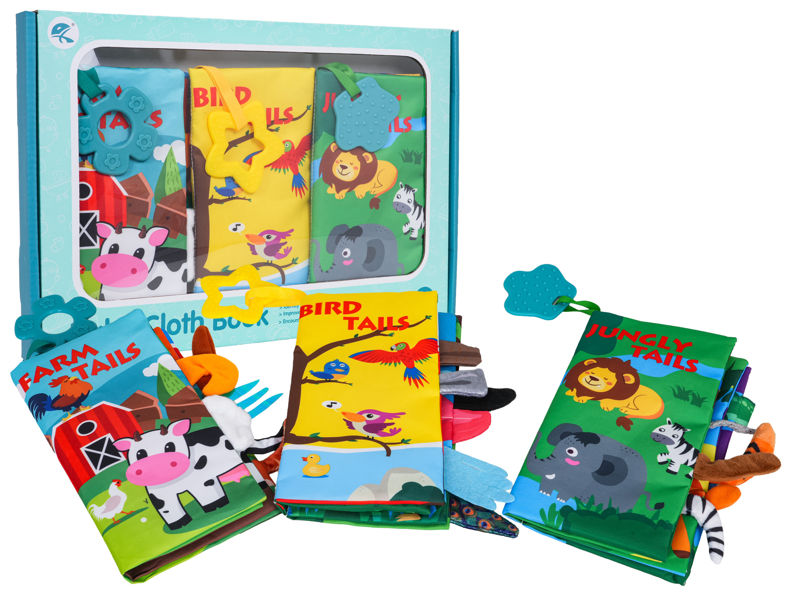 Sada měkkých senzorických knížek pro miminko od třetího měsíce života. Sada byla vyrobena z nejkvalitnějších materiálů bezpečných pro malé děti. Šustící, pískající a na dotek měkké stránky stimulují smysly miminka na mnoha úrovních. Živé barvy přitahují pozornost dítěte a povzbuzují k vzdělávací hře. Na měkkých stránkách se nacházejí obrázky mnoha zvířátek. První knížka představuje zvířátka safari, druhá zvířátka na farmě a třetí různé ptáky. Každé zvířátko je označeno v angličtině. Z každé strany vyčnívají ocásky, navíc ke každé knize je připojen kousátko. Knížečky jsou voděodolné a snadno se čistí.