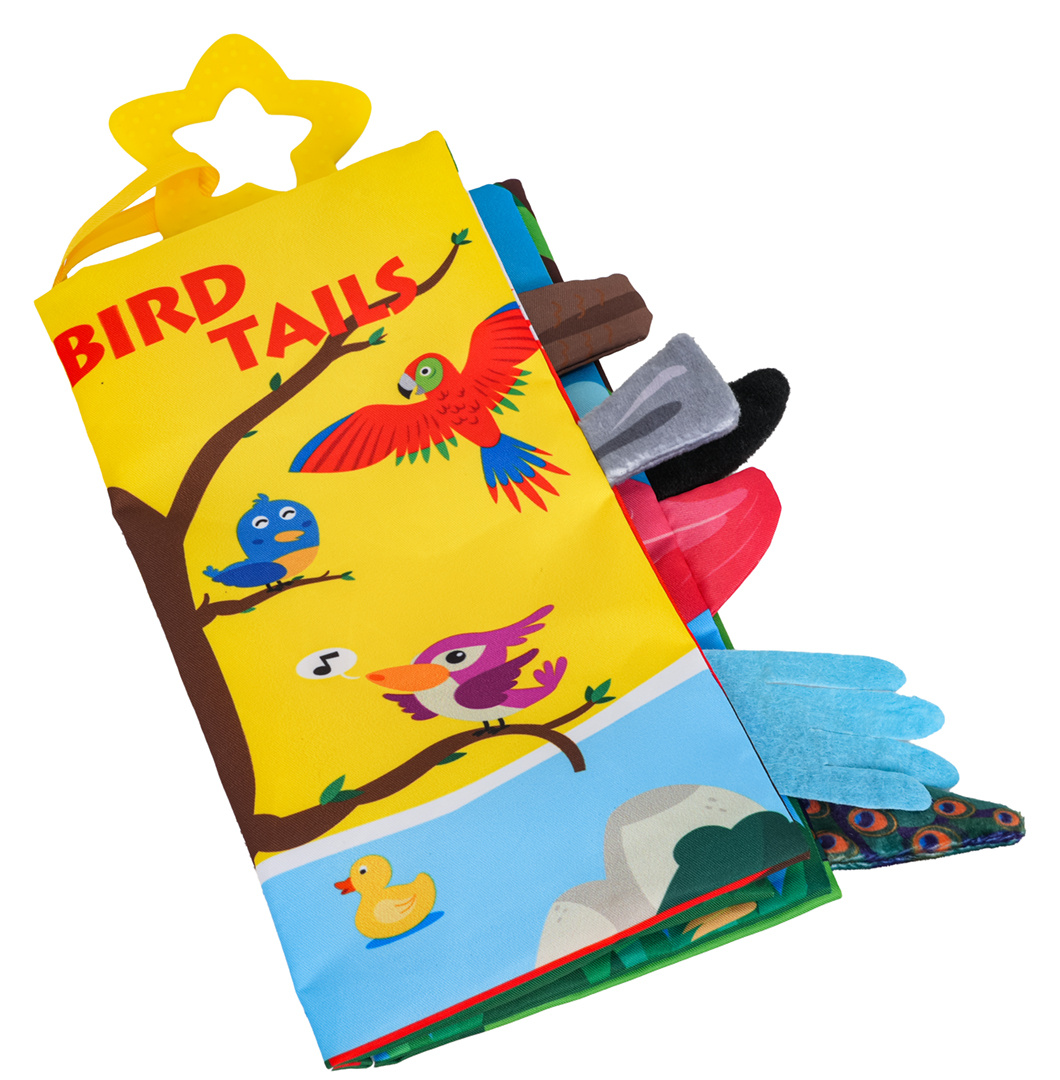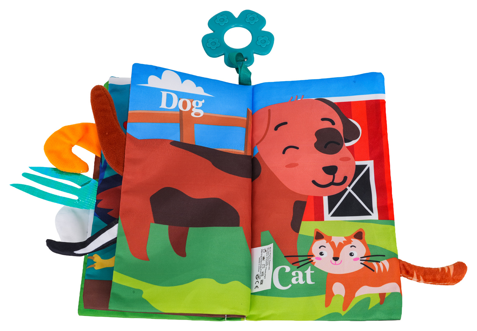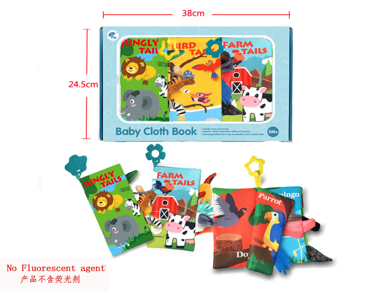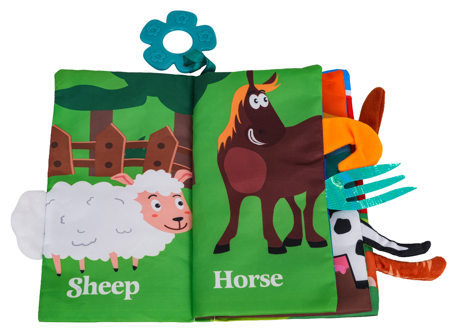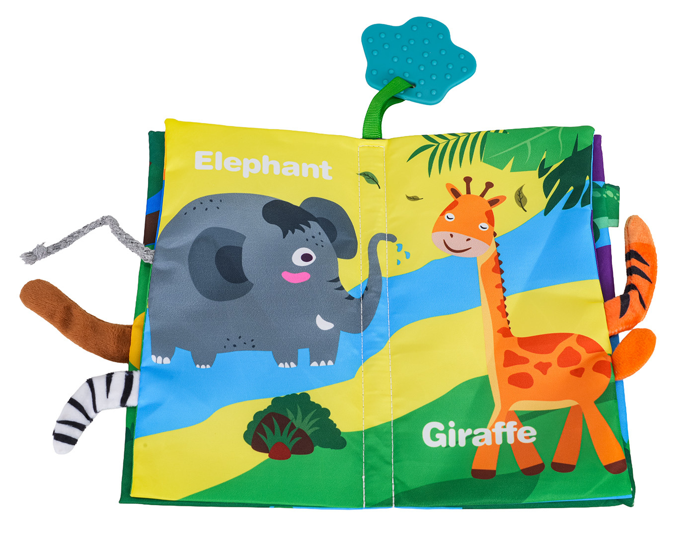 Sada měkkých senzorických knížek pro miminko od třetího měsíce života. Sada byla vyrobena z nejkvalitnějších materiálů bezpečných pro malé děti. Šustící, pískající a na dotek měkké stránky stimulují smysly miminka na mnoha úrovních. Živé barvy přitahují pozornost dítěte a povzbuzují k vzdělávací hře. Na měkkých stránkách se nacházejí obrázky mnoha zvířátek. První knížka představuje zvířátka safari, druhá zvířátka na farmě a třetí různé ptáky. Každé zvířátko je označeno v angličtině. Z každé strany vyčnívají ocásky, navíc ke každé knize je připojen kousátko. Knížečky jsou voděodolné a snadno se čistí.