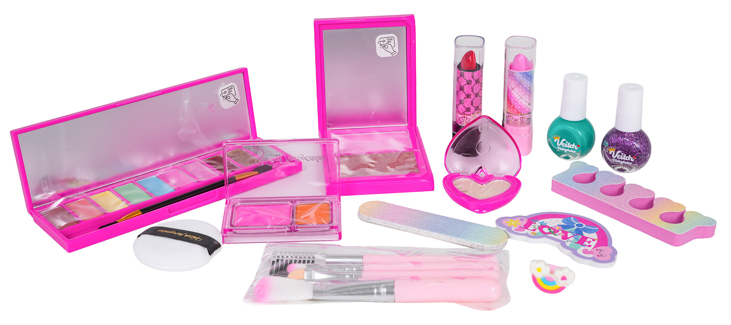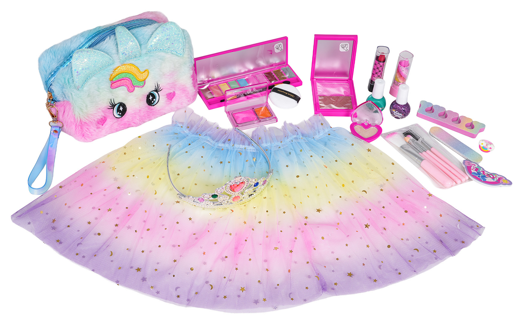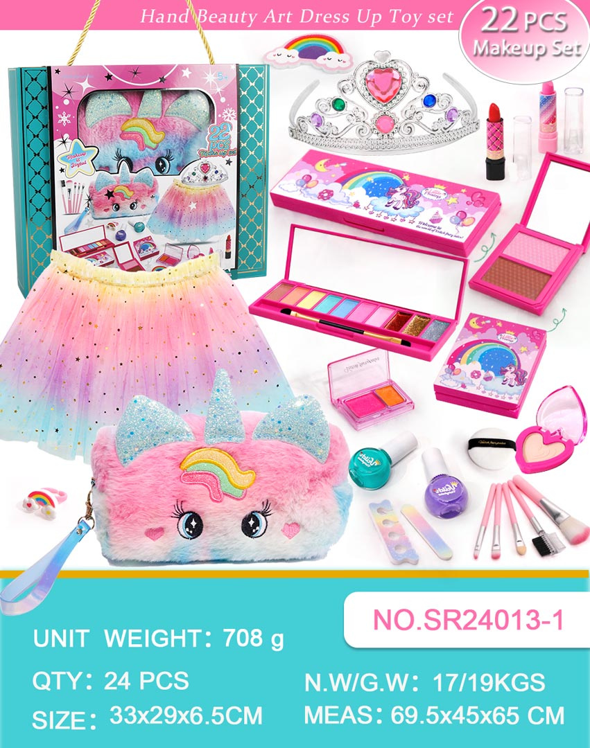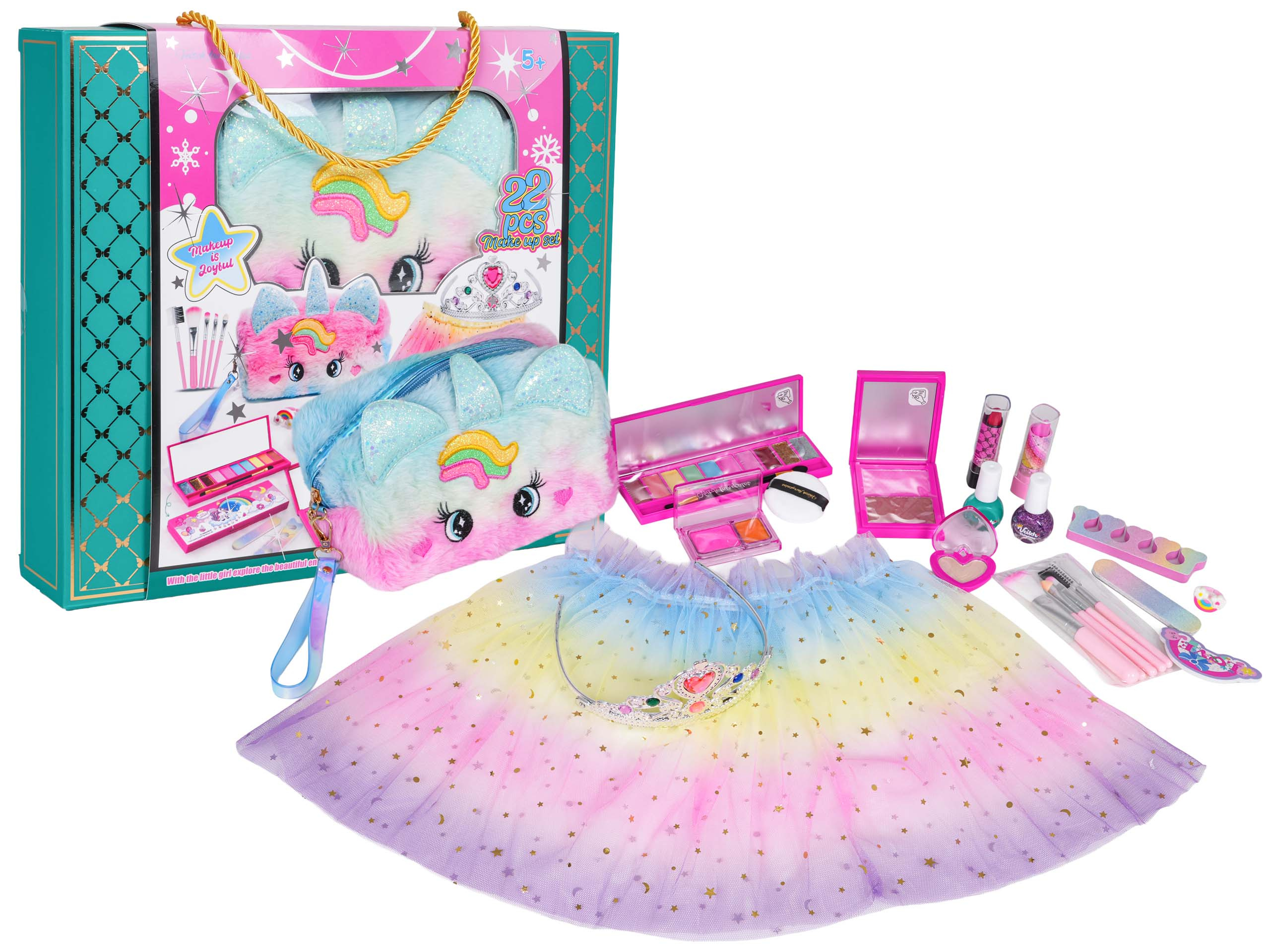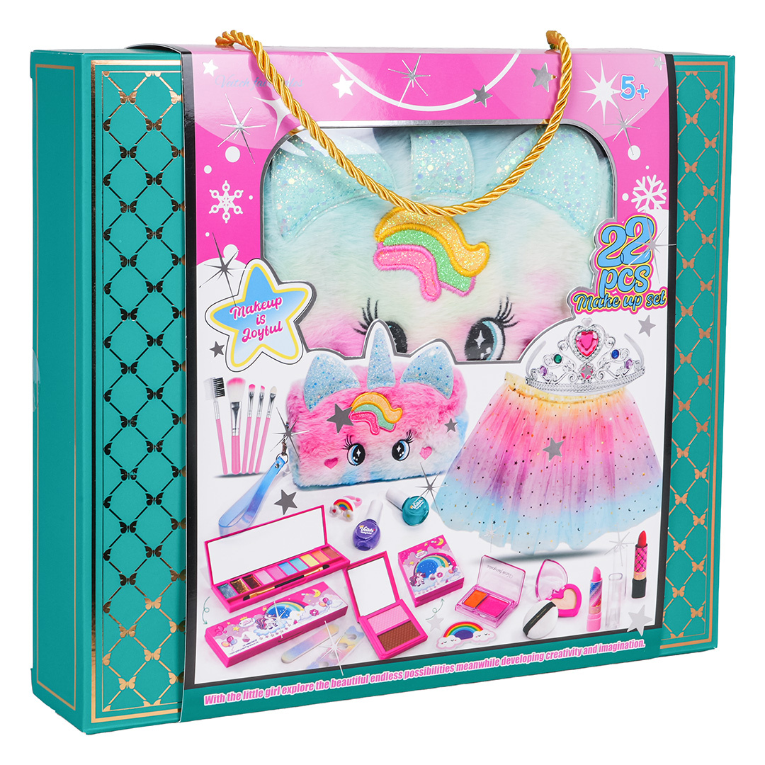 Bohatě vybavená sada se sukýnkou, kabelkou a kosmetikou pro děti od pěti let. Sada se skládá z 22 prvků a byla vyrobena s důrazem na detaily, z materiálů nejvyšší kvality. Kosmetika obsažená v sadě je bezpečná pro děti, nezpůsobuje alergie. Velmi snadno se smývá, stačí voda s přídavkem mýdla. V sadě můžeme najít takové kosmetické produkty jako paletky s očními stíny, laky na nehty, rtěnky, jsou zde také štětce na líčení, pilník na nehty, separátory na prsty. Všechny kosmetiky lze zabalit do roztomilé, chlupaté taštičky s jednorožcem. V sadě se také nachází tylová sukýnka a koruna, aby se vaše dítě mohlo vžít do role princezny.
