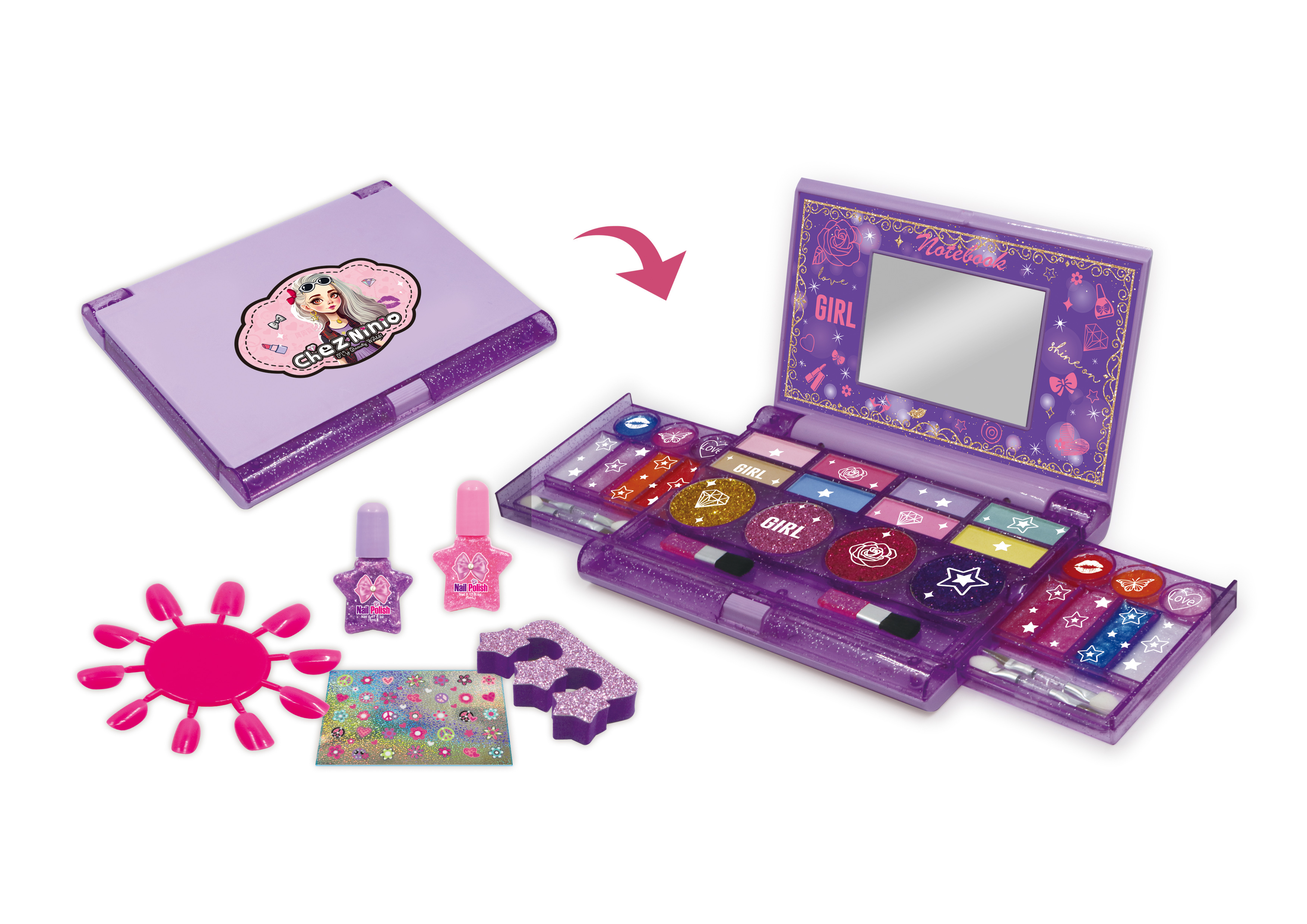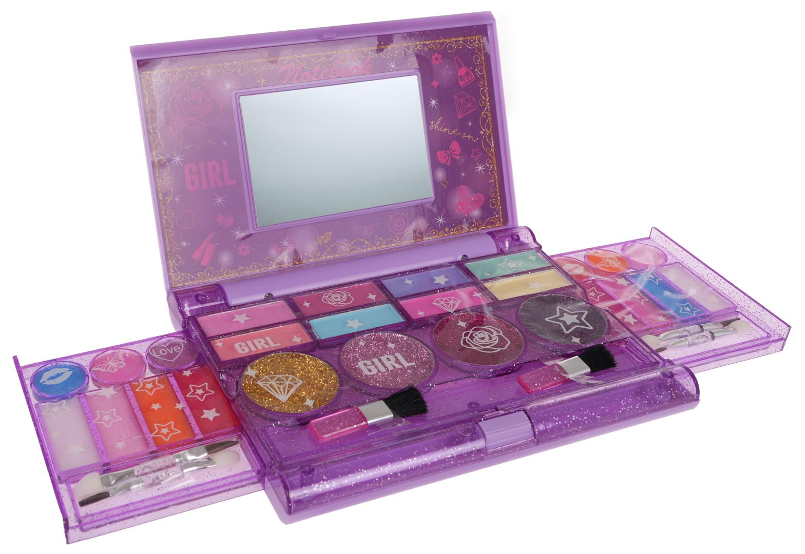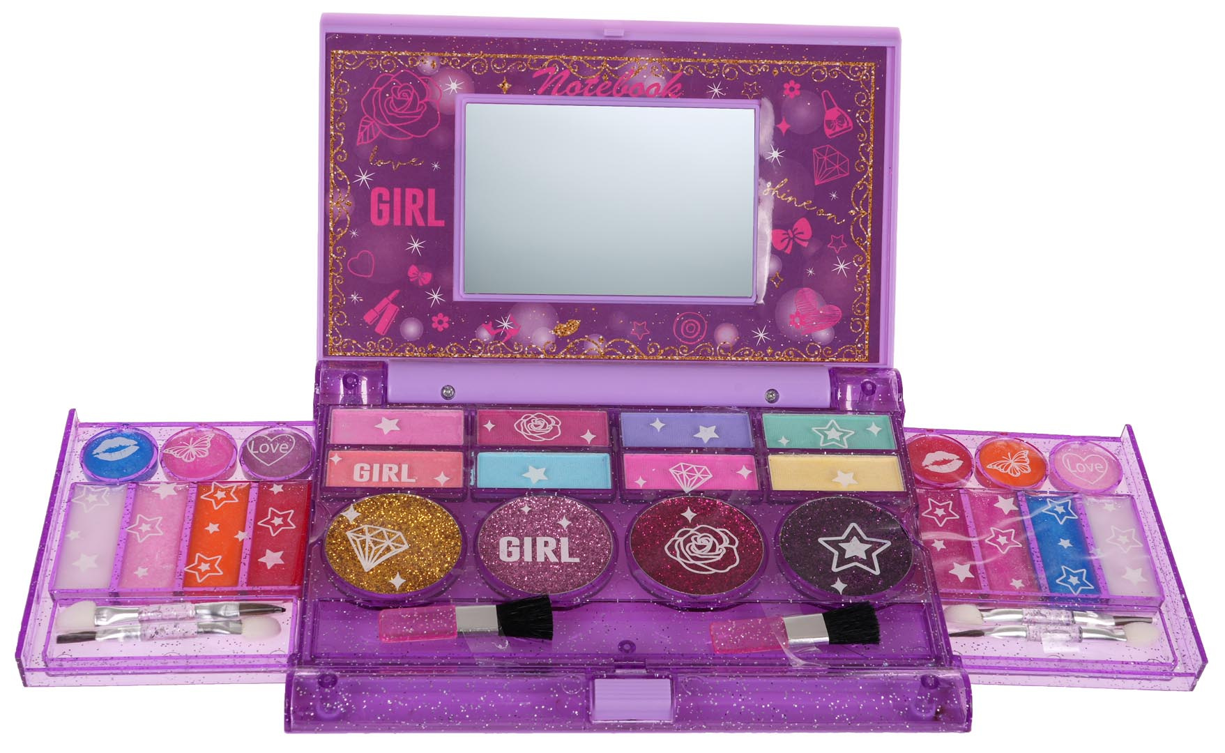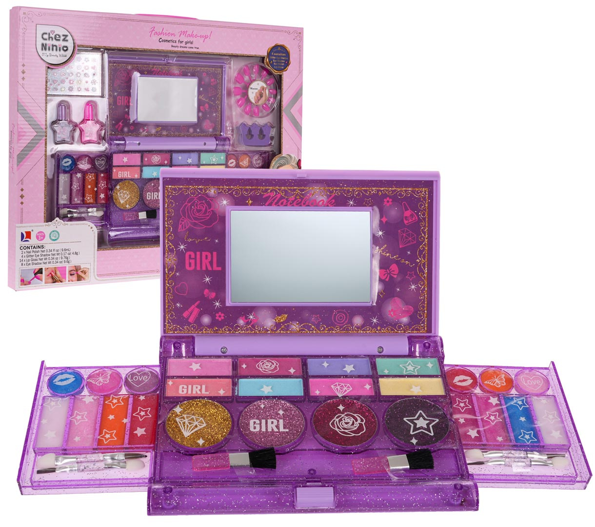 Sada na líčení pro děti s rozkládacím tabletem a zrcátkem, pro děti od 3 let. Sada obsahuje vše potřebné pro malování obličeje a nehtů. Všechny kosmetiky se vejdou na paletu v elegantním, rozkládacím tabletu, který je pohodlný na přenášení. Paleta obsahuje mnoho různobarevných očních stínů a rtěnek a také štětce na líčení. Sada je vyrobena z bezpečných materiálů.