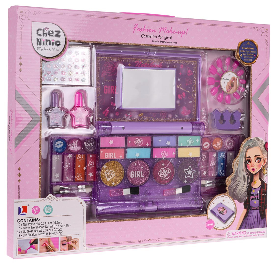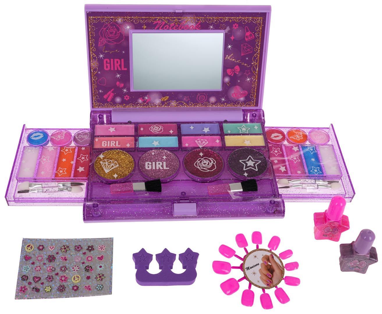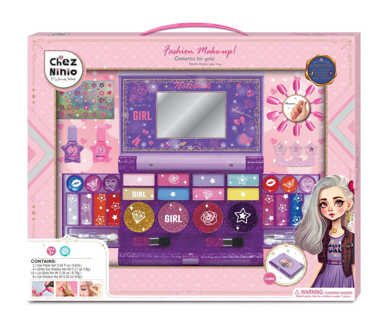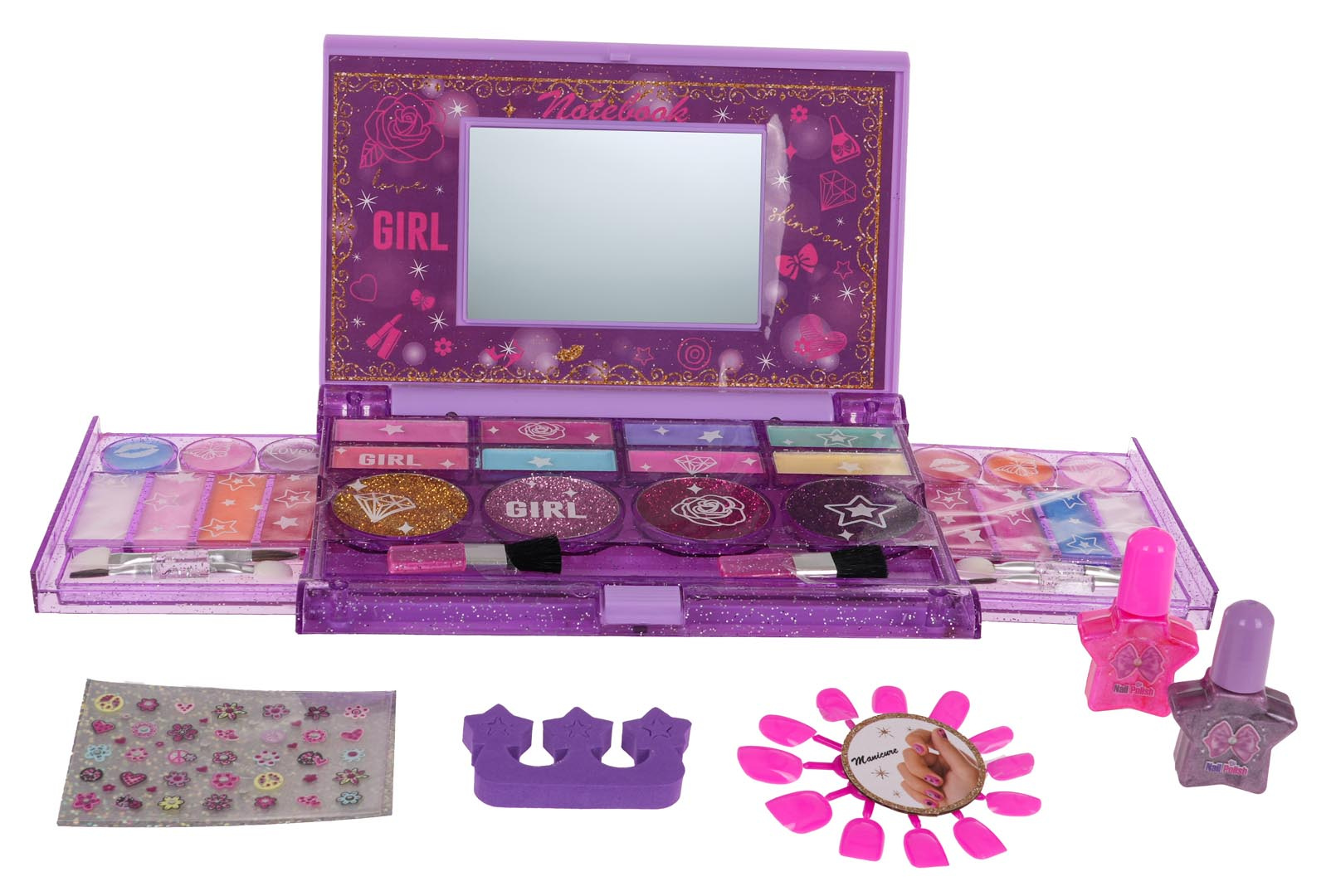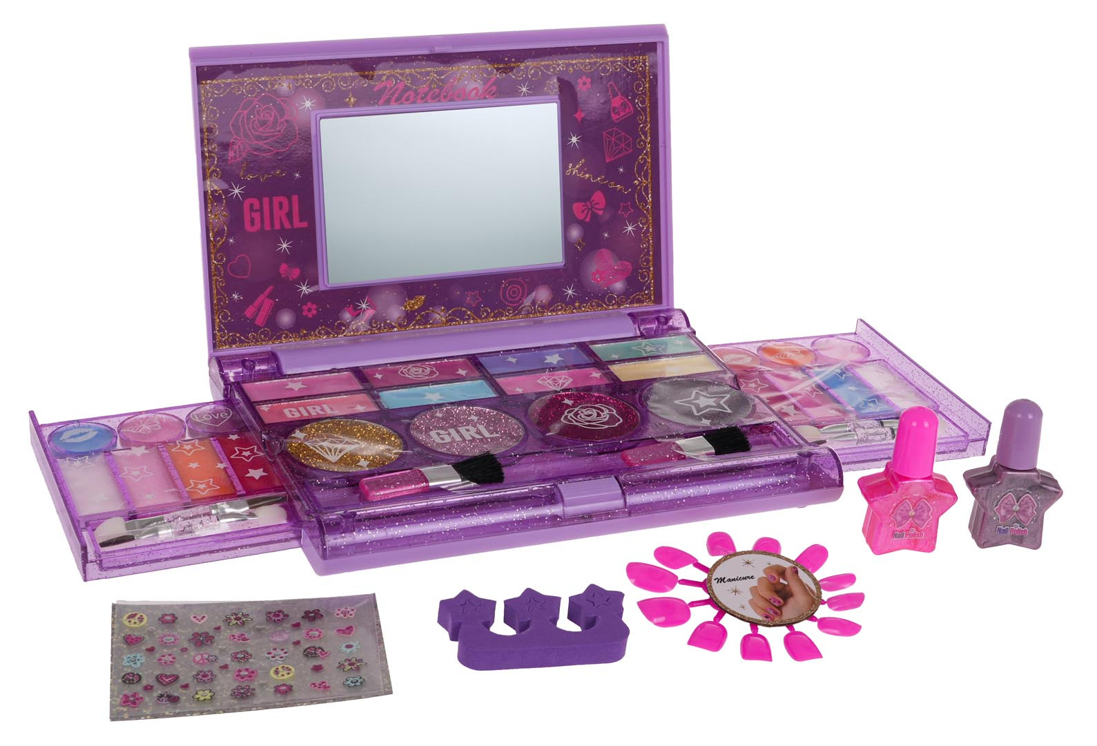 Sada na líčení pro děti s rozkládacím tabletem a zrcátkem, pro děti od 3 let. Sada obsahuje vše potřebné pro malování obličeje a nehtů. Všechny kosmetiky se vejdou na paletu v elegantním, rozkládacím tabletu, který je pohodlný na přenášení. Paleta obsahuje mnoho různobarevných očních stínů a rtěnek a také štětce na líčení. Sada je vyrobena z bezpečných materiálů.