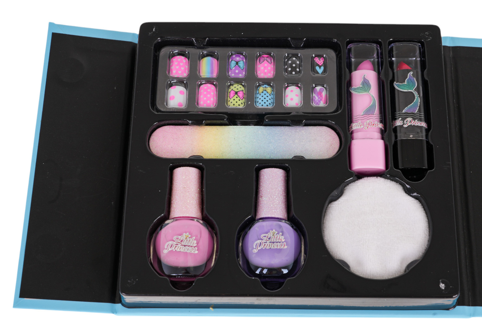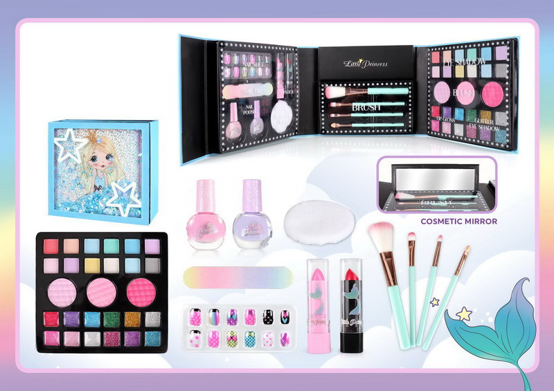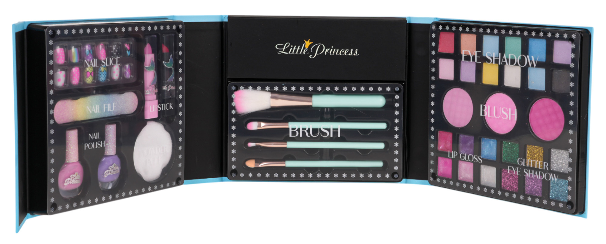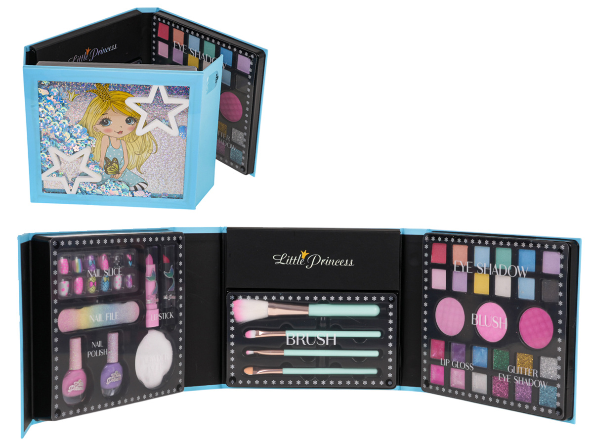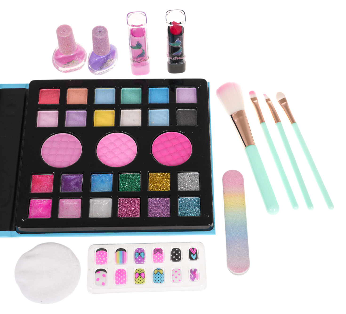 Sada obsahuje širokou škálu doplňků, jako jsou oční stíny, rtěnky, laky na nehty, tipy na nehty, štětce, pilník na nehty, zrcátko a vatový tampon na odličování. Barevná paleta očních stínů a rtěnek vám umožní vytvářet rozmanité vzhledy a zároveň rozvíjet váš estetický smysl. Všechny položky jsou uloženy ve funkční otevírací krabičce, která se rozloží a stane se elegantním kosmetickým stolkem.