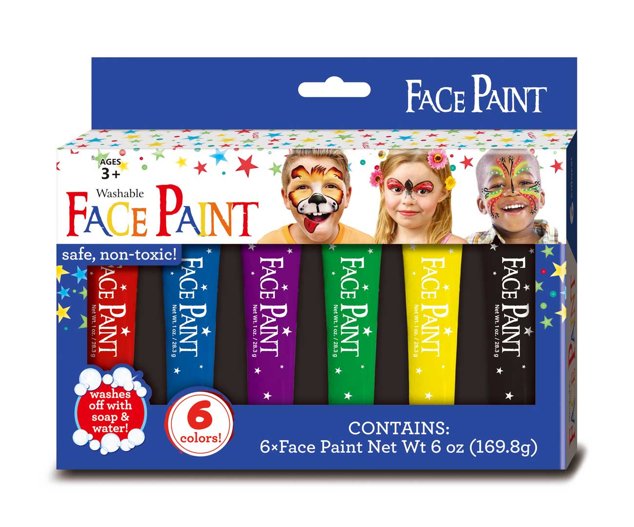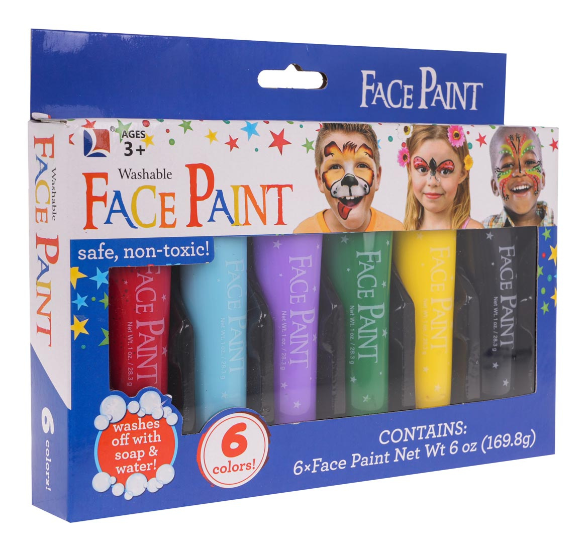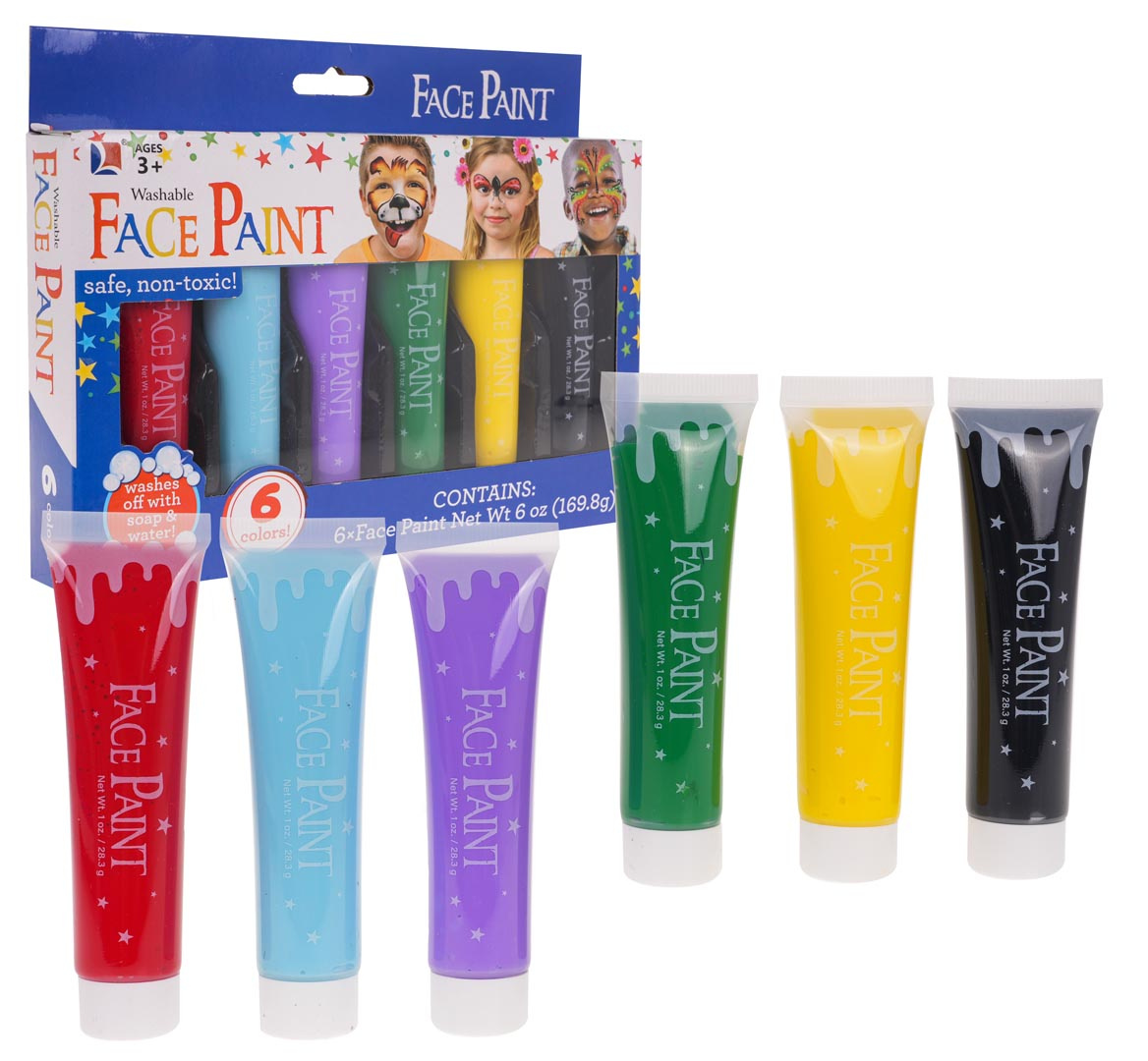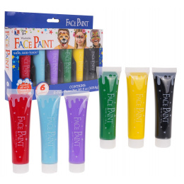 Sada barev na malování obličeje pro děti od 3 let. Barvy na obličej jsou vyrobeny z bezpečných, netoxických materiálů pro děti. Jsou snadno omyvatelné, stačí voda s mýdlem. V sadě se nachází 6 tubiček barvy na obličej v různých barvách.