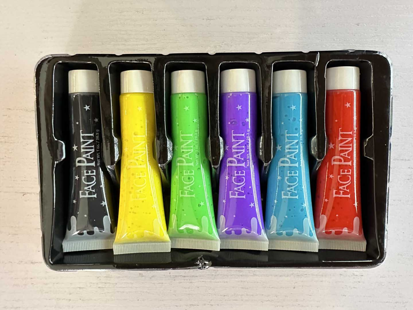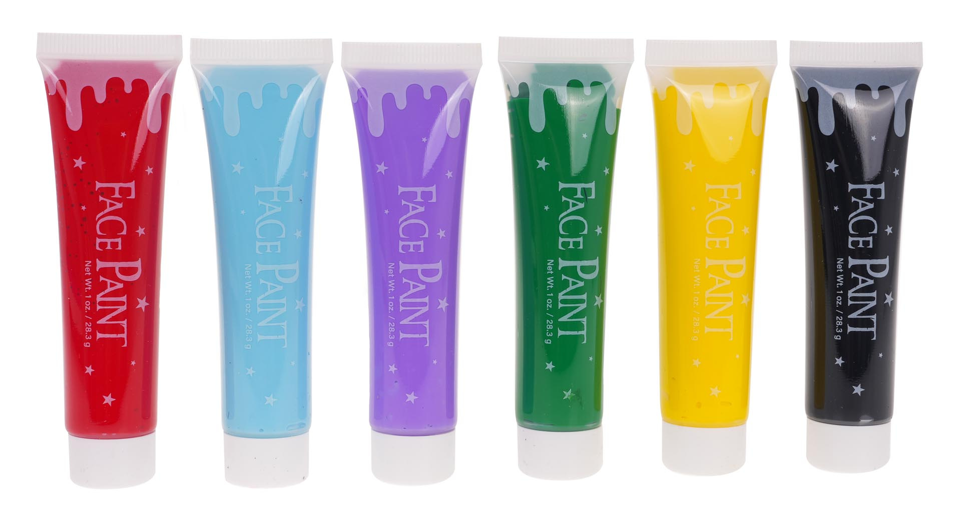 - 6 x barva na obličej v tubě (černá, žlutá, zelená, fialová, modrá, červená).