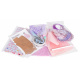 | - 5 x figurína, - 3 x pravítko, - nůžky, - oboustranná páska, - 3 x bambule na sponce, - pastelka, - dekorativní nálepky, - role pásky, - 7 x stuha z tylu, - 4 x volán z materiálu, - 4 sáčky s různými kousky materiálů, - 2 x instrukce |