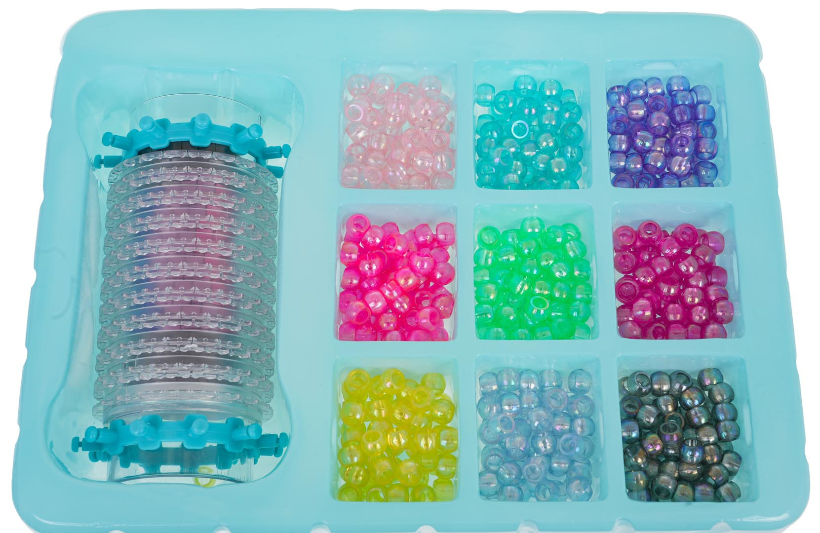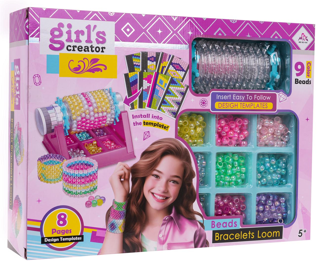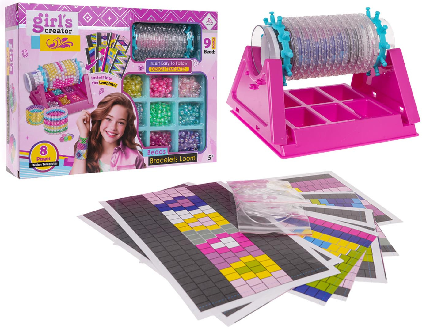 Sada na výrobu náramků s tkalcovským stavem a doplňky pro děti od 5 let. V sadě se nachází tkalcovský stav, 8 šablon a 540 korálků v 9 barvách. Použití stavu na náramky je jednoduché, stačí nasadit plastovou trubku na stojánek. Do přihrádky nasypat korálky, každý barevný do samostatné přihrádky, aby to bylo jednodušší. Vybereme si ze vzorníku vzor, který chceme vytvořit, nebo vyrobíme náramek podle vlastního nápadu. Umisťujeme korálky na trubičku a začínáme tkát, začínáme z pravé strany a posouváme se doleva. Nitku provlékáme střídavě nahoru, dolů. Opakujeme činnosti na všech řadách korálků. Po dokončení tkaní opatrně sundáme náramek z tuby. Sada rozvíjí manuální dovednosti a kreativitu.