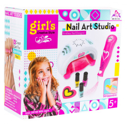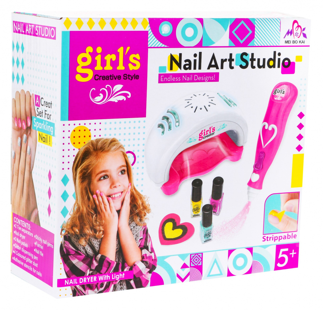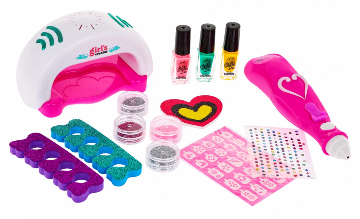 Bezpečná sada se zvukovými a světelnými efekty pro malé manikérky od pěti let. Sada obsahuje vše potřebné pro manikúru. Vysoušeč nehtů skutečně vysušuje nehty a vydává zvuky při sušení, jeho horní část je osvětlena světly, napájení - 2 x AAA 1,5 V (není součástí balení). Pomocí třpytek můžeme stříkat třpytky na nehty, napájení - 2xAAA 1,5V (není součástí balení). Lak na nehty je bezpečný a netoxický a po skončení hraní se velmi snadno odstraňuje.
