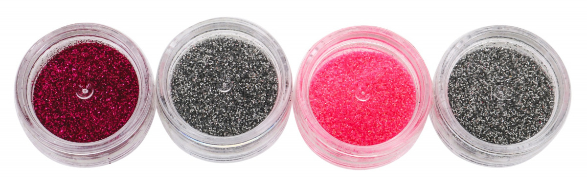 - čtyři nádobky s barevnými třpytkami,