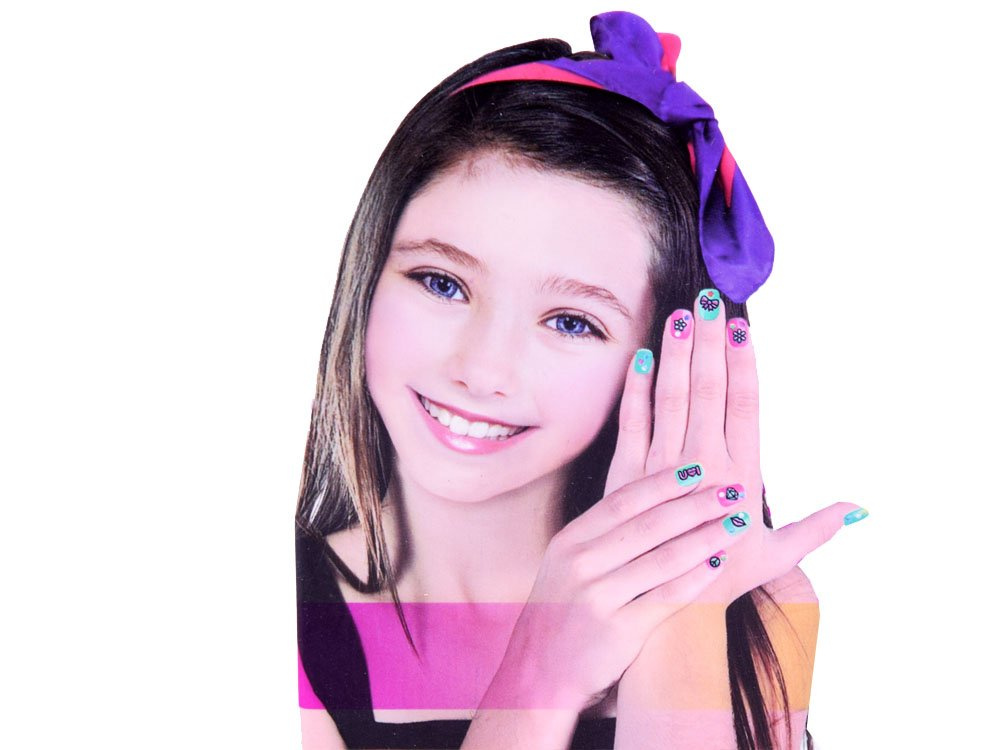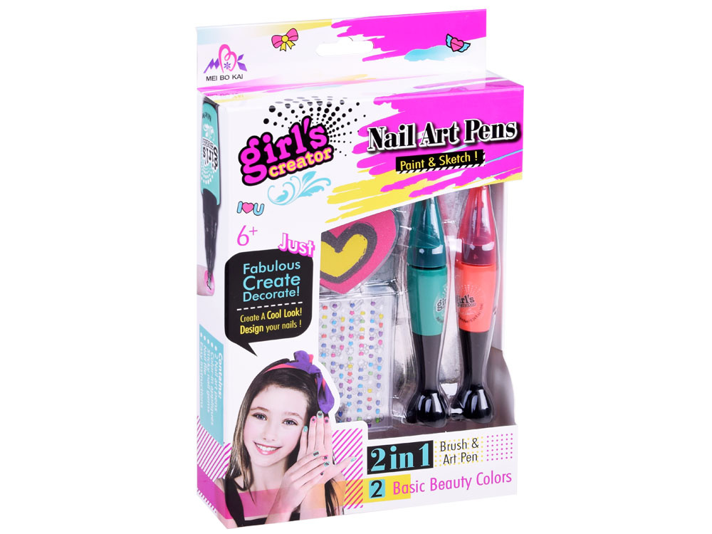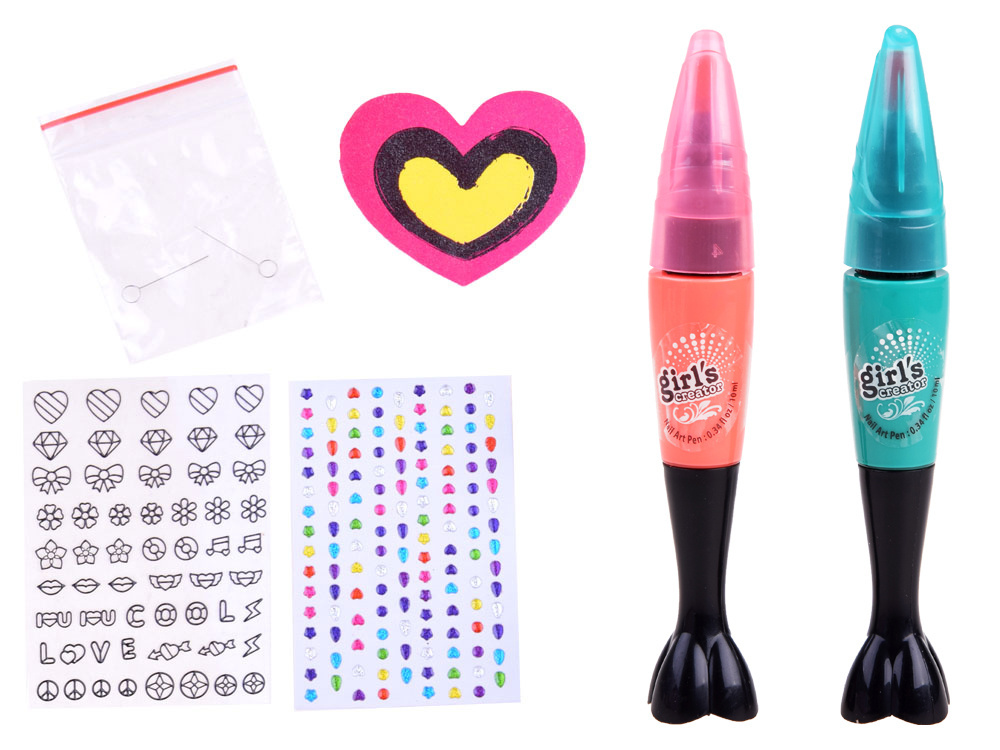 Sada na zdobení nehtů pro dívky. sada se skládá ze dvou laků se zdobicími hroty, barevných samolepek různých tvarů, černých vzorů k malování a pilníku ve tvaru srdce.
