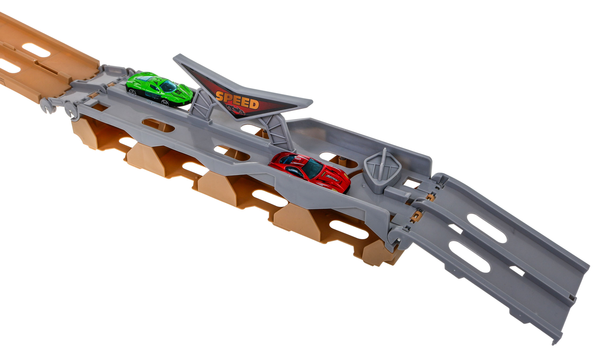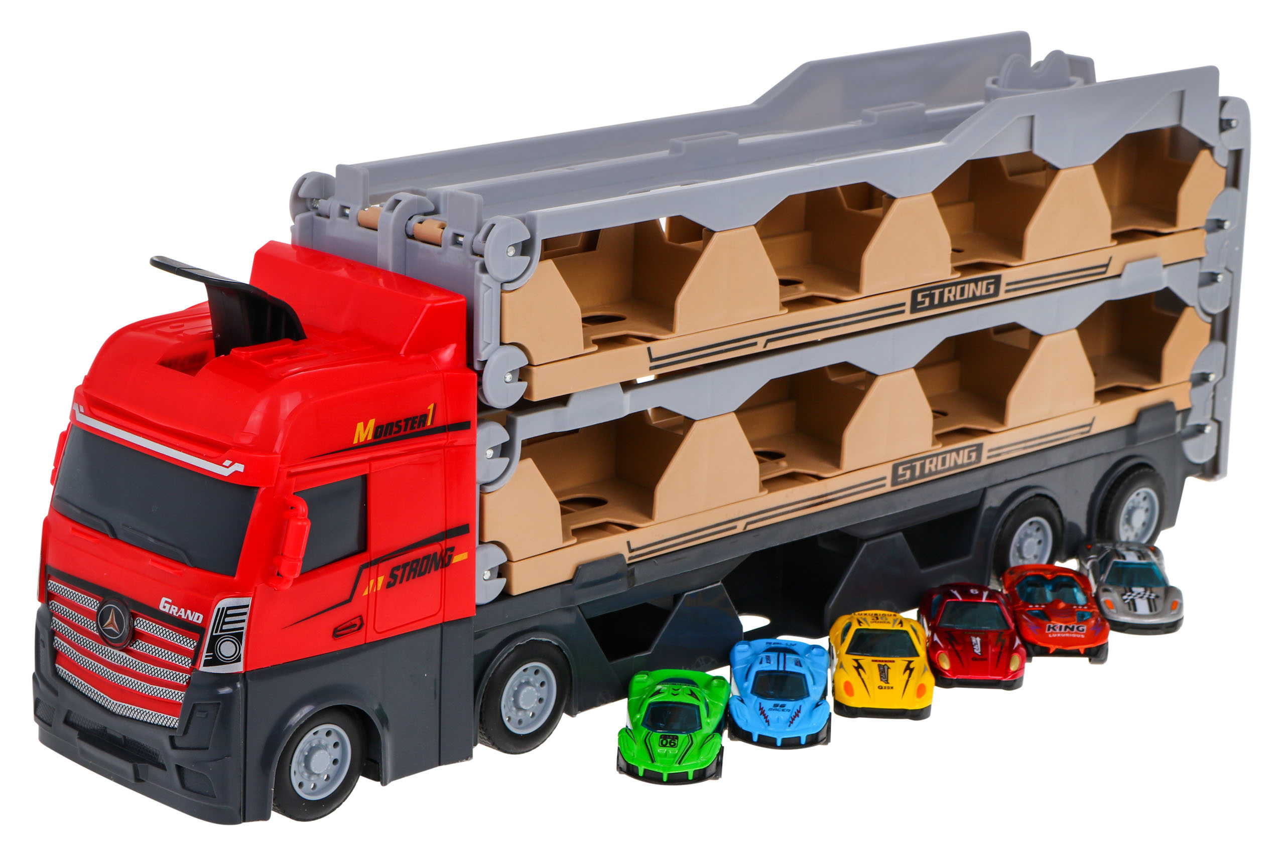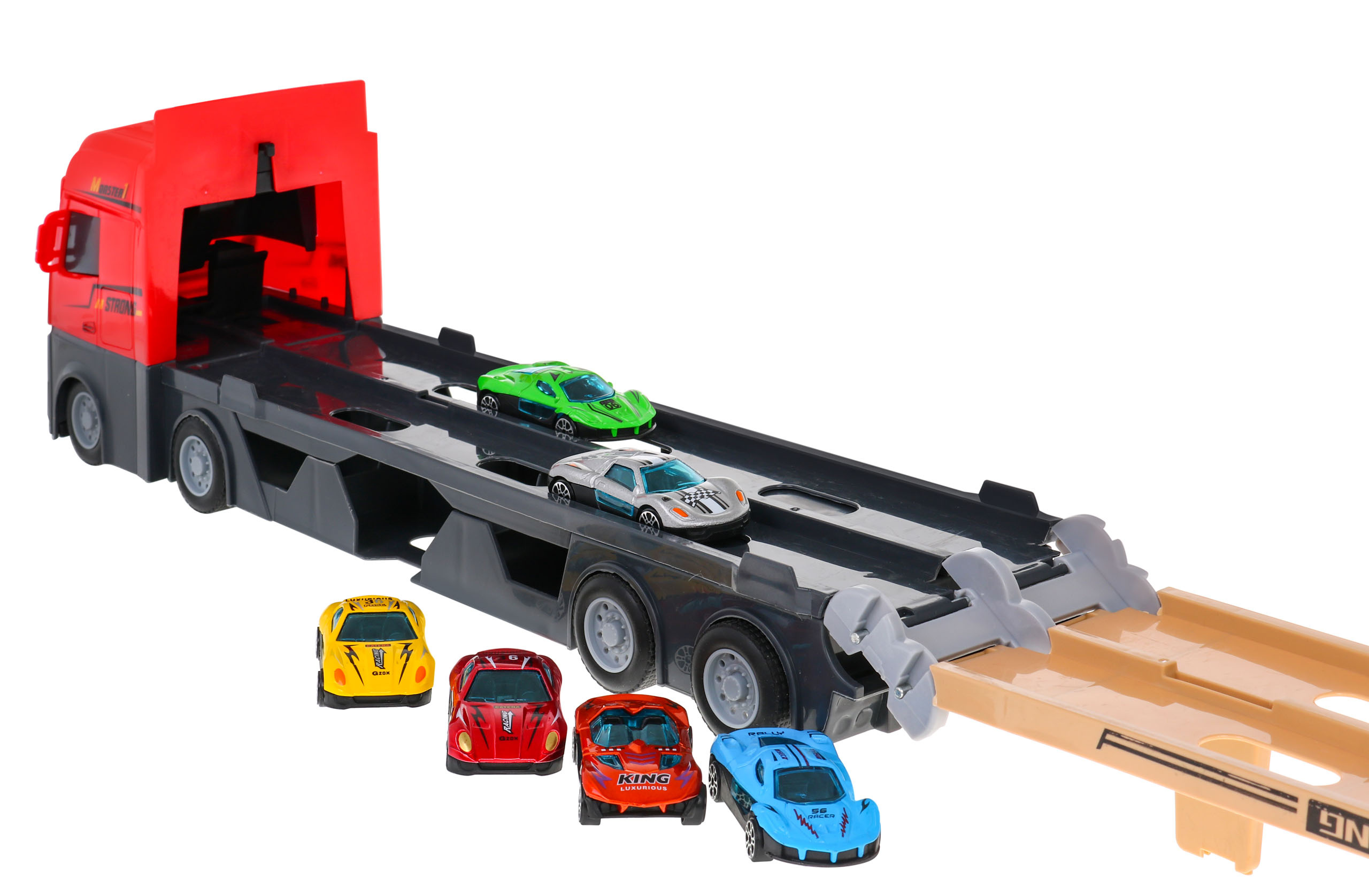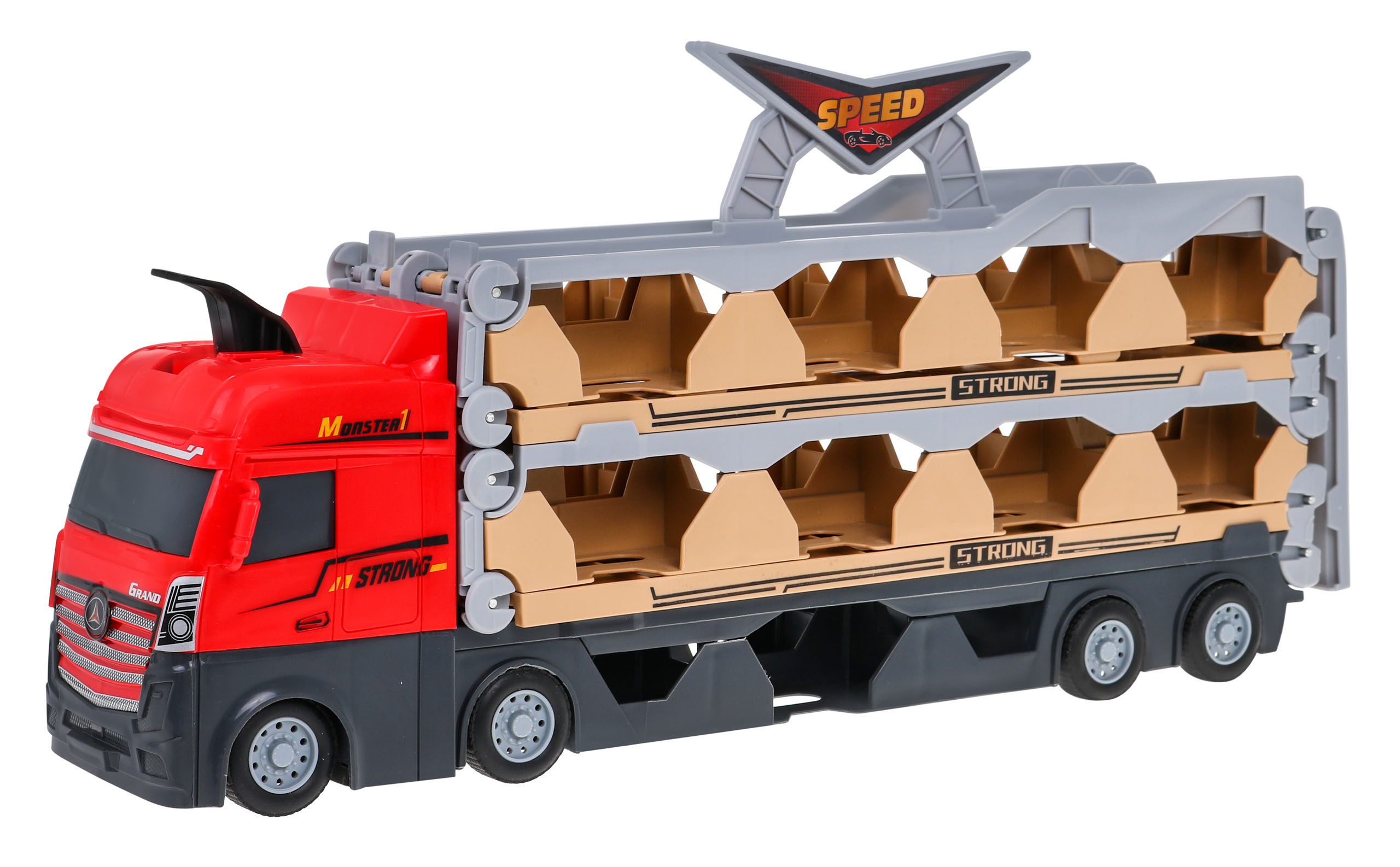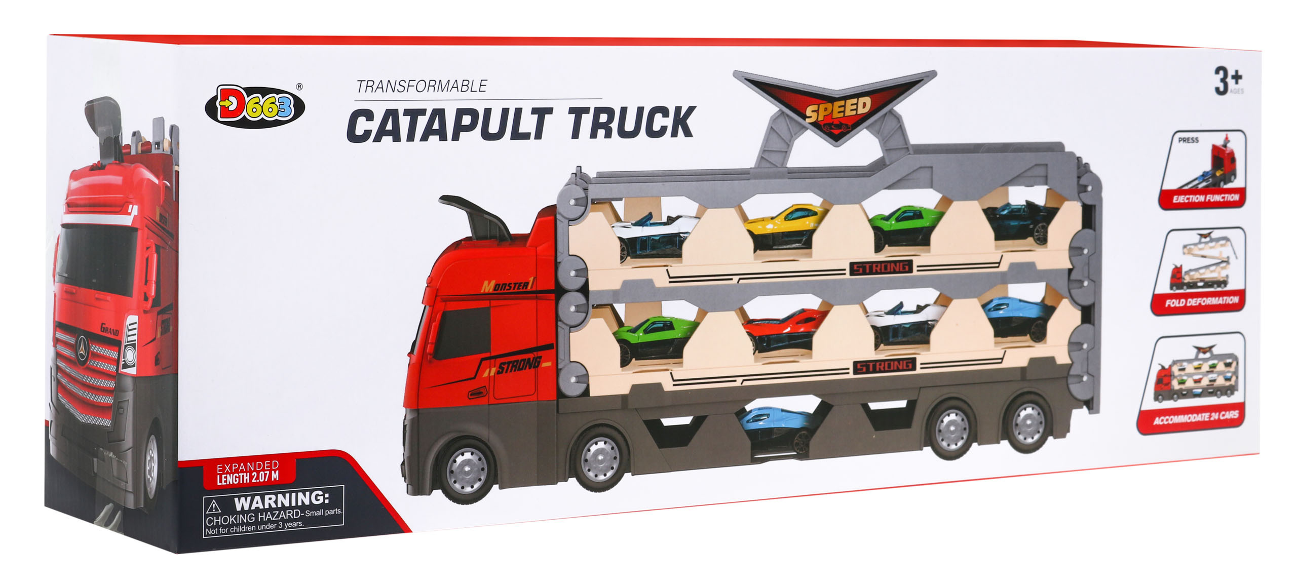 Velký, pevně postavený třípatrový náklaďák s katapultem pro děti od 3 let. Vůz má gumové pneumatiky a pohon obou kol. Na horní straně vozidla je praktické madlo pro přenášení, díky kterému můžete auto vzít všude s sebou. Hračka má 3 úrovně, na které lze uložit velké množství autíček (včetně 6 autíček). Po rozložení úrovní vznikne velká dráha pro auta dlouhá až 207 cm. Náklaďák má katapult pro vozidla, stačí umístit vozidlo na nejnižší úroveň a stisknout páčku umístěnou na střeše náklaďáku. Autíčko vystřelí dopředu a jede po skládací dráze. Hračka nevyžaduje baterie.