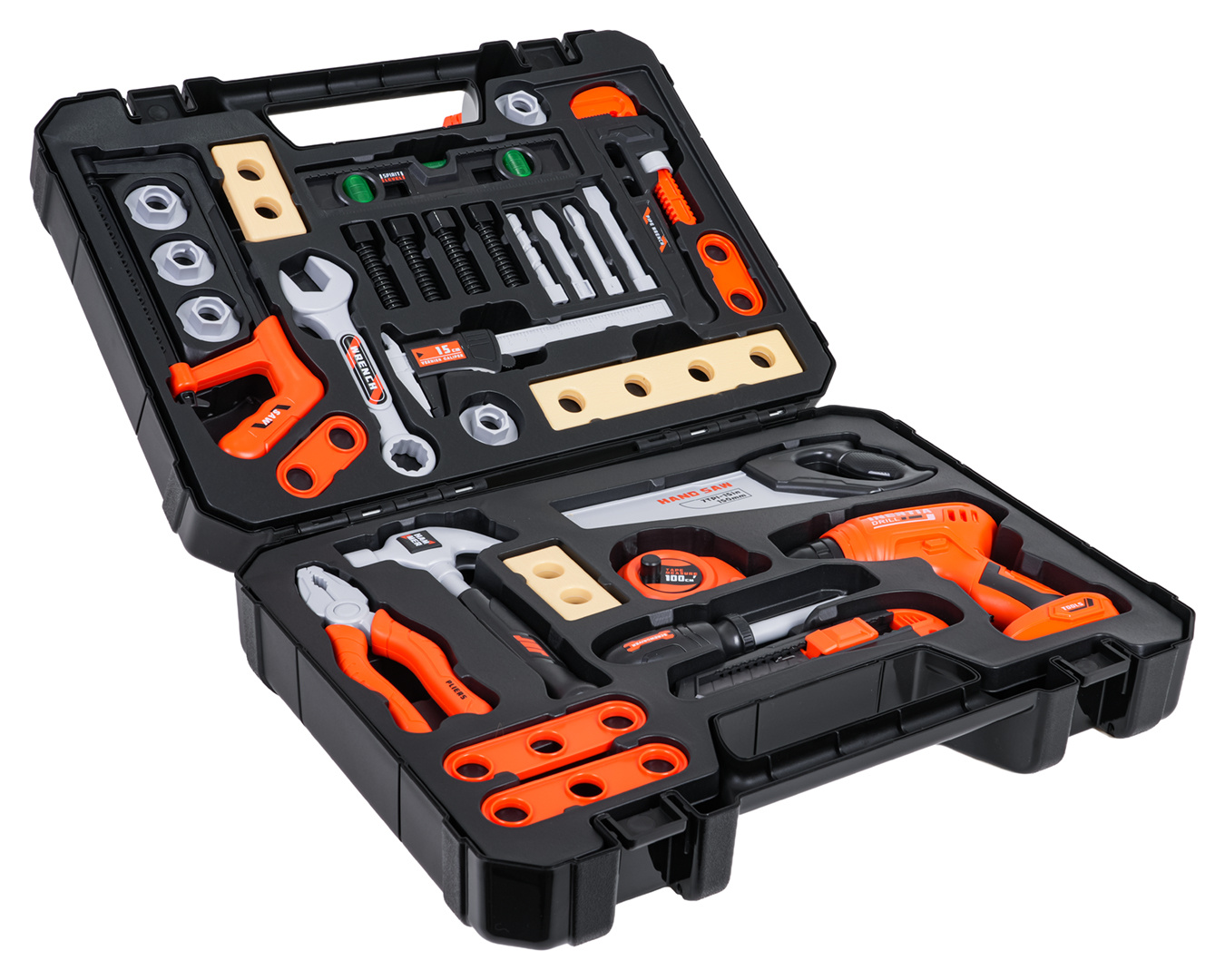 Bohatě vybavená sada nástrojů s interaktivní vrtačkou a šroubovákem a nářaďovým boxem pro děti starší tří let. Sada byla vyrobena z nejkvalitnějšího plastu a obsahuje až 34 prvků. Kromě velké profesionálně vypadající skříňky na nářadí máme v sadě také: vrtačku-šroubovák s vyměnitelnými bity, posuvné měřítko, klíč na šrouby, metr, šroubovák, kladivo, ruční pilu, kleště a mnoho šroubků, nástavců, dřevěných špalíků na šroubování.